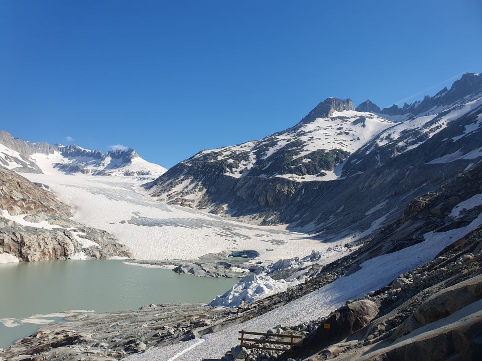 Beim Aufstieg habe ich um 12:00 zwei Skitourengeher bei der sehr steilen und direkten Abfahrt vom Nordgrat Galenstock in die Westflanke zum Rhonegletscher hinabfahren gesehen. Gratulation dafür. Obwohl oben etwas Eis zu sehen war hat die Abfahrt top ausgesehen.