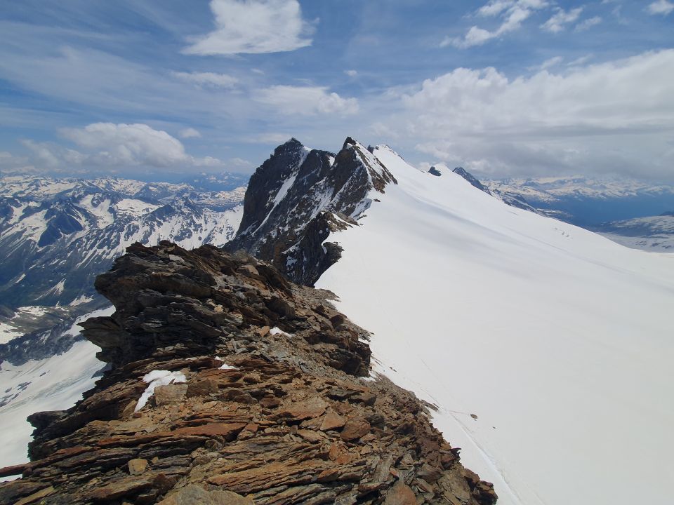 Diese kleine namenlose Erhebung war mir schon am 16.06.18 bekannt und ist nicht so einfach wie es aussieht. Heute war nicht nur der Felsaufstieg, wie damals, sondern auch noch der Übergang von Schnee zu Fels anspruchsvoll. Beim Übergang sank ich immer wieder mal mit einem Ski ins Leere. Der Felsaufstieg war im II-er Bereich. Ich würde diesen Punkt nun im nachhinein auslassen, resp. aktuell deswegen nicht empfehlen.