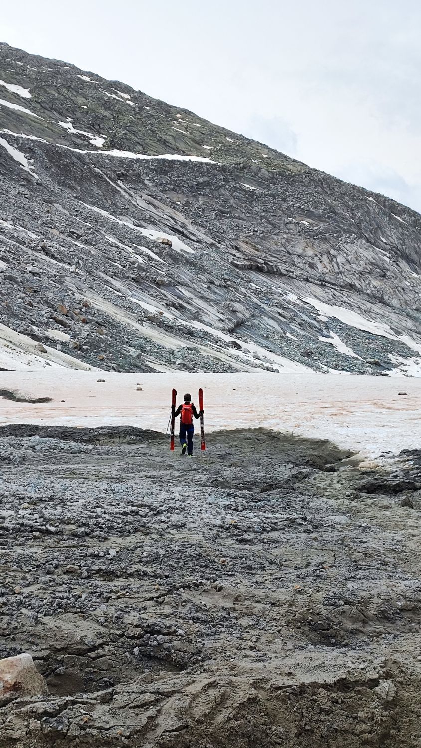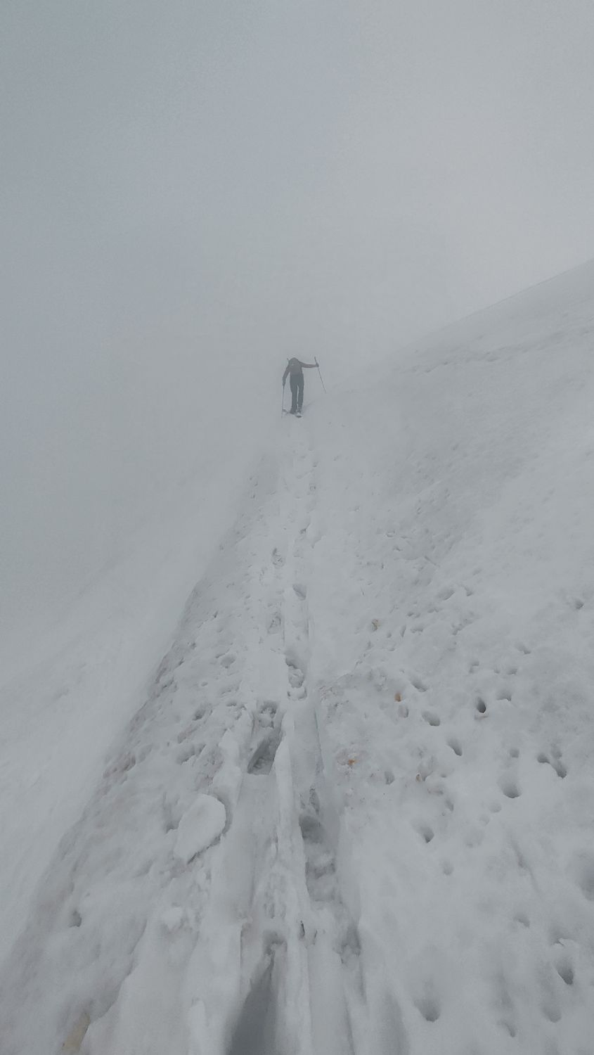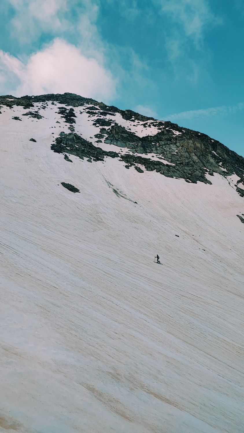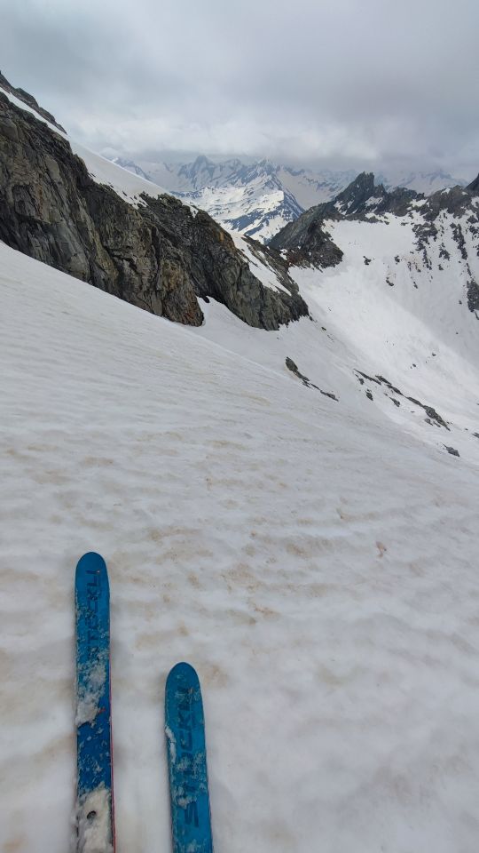 Ab dem Gletscher rechtsseitig noch schmaler Schneestreifen. Nur 1x kurz Ski tragen. Achtung auf Steinschlag. Ab Abzweigung dann erstaunlich gute Verhältnisse. Harscheisen nicht nötig. Ab ca. 3200m dann Sumpf und dichter Nebel plus immer wieder starker Föhn. Abfahrt über den Galengletscher. Sehr gut zu fahren.
