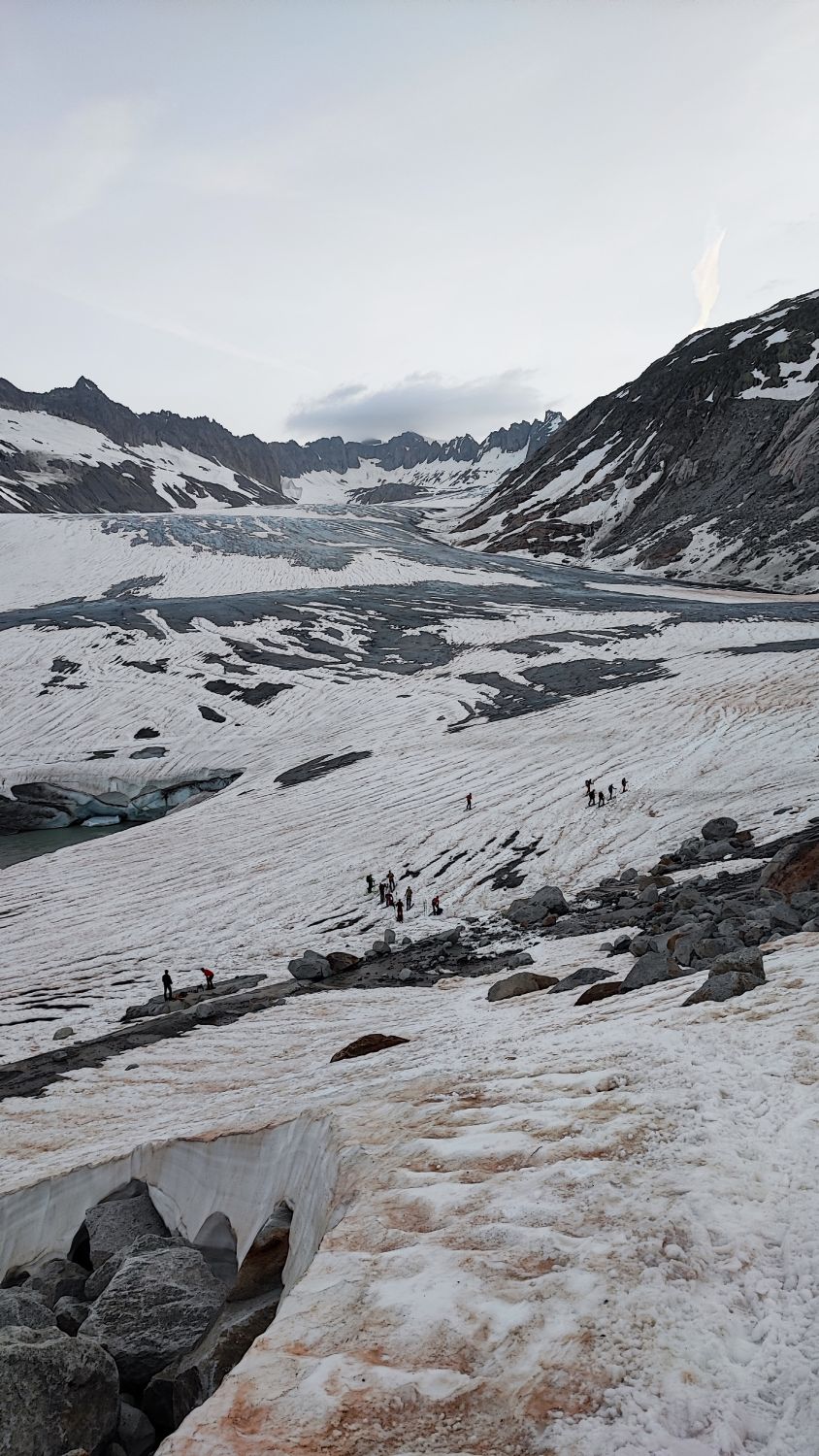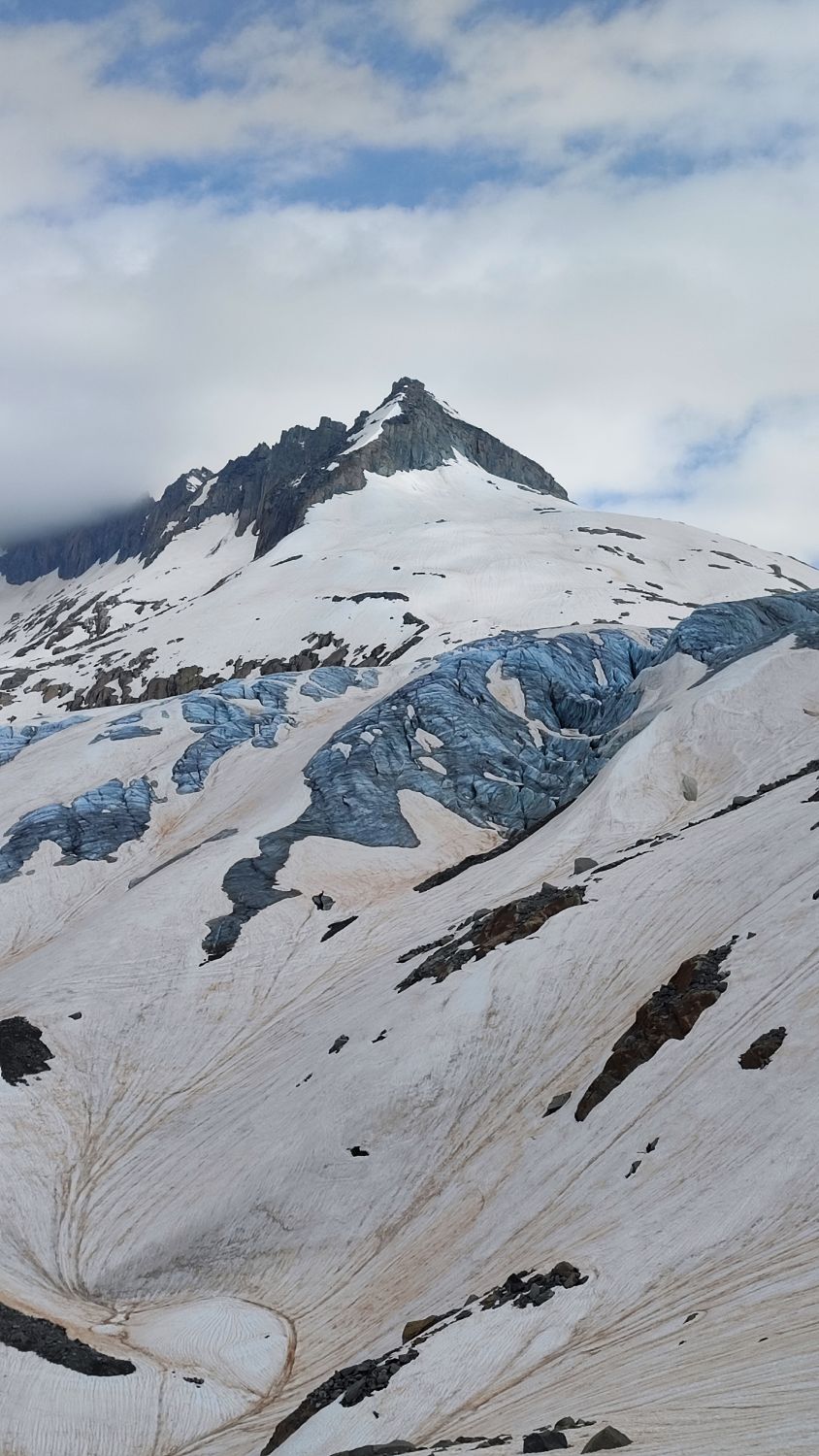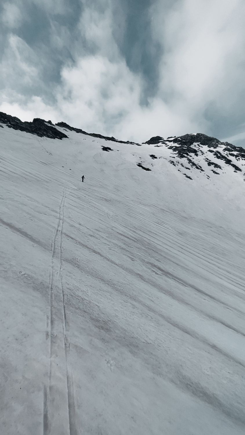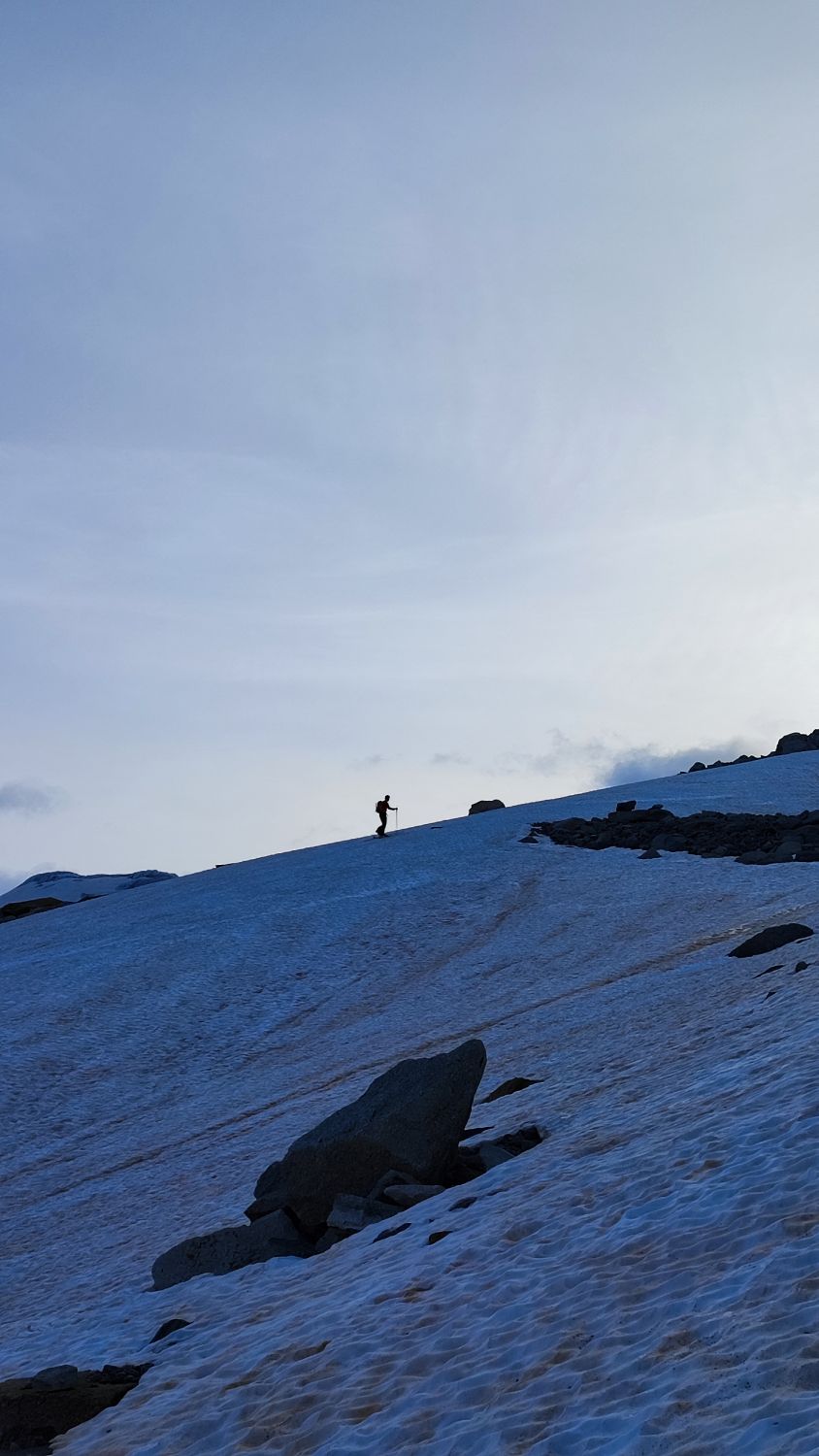 Ab dem Gletscher rechtsseitig noch schmaler Schneestreifen. Nur 1x kurz Ski tragen. Achtung auf Steinschlag. Ab Abzweigung dann erstaunlich gute Verhältnisse. Harscheisen nicht nötig. Ab ca. 3200m dann Sumpf und dichter Nebel plus immer wieder starker Föhn. Abfahrt über den Galengletscher. Sehr gut zu fahren.