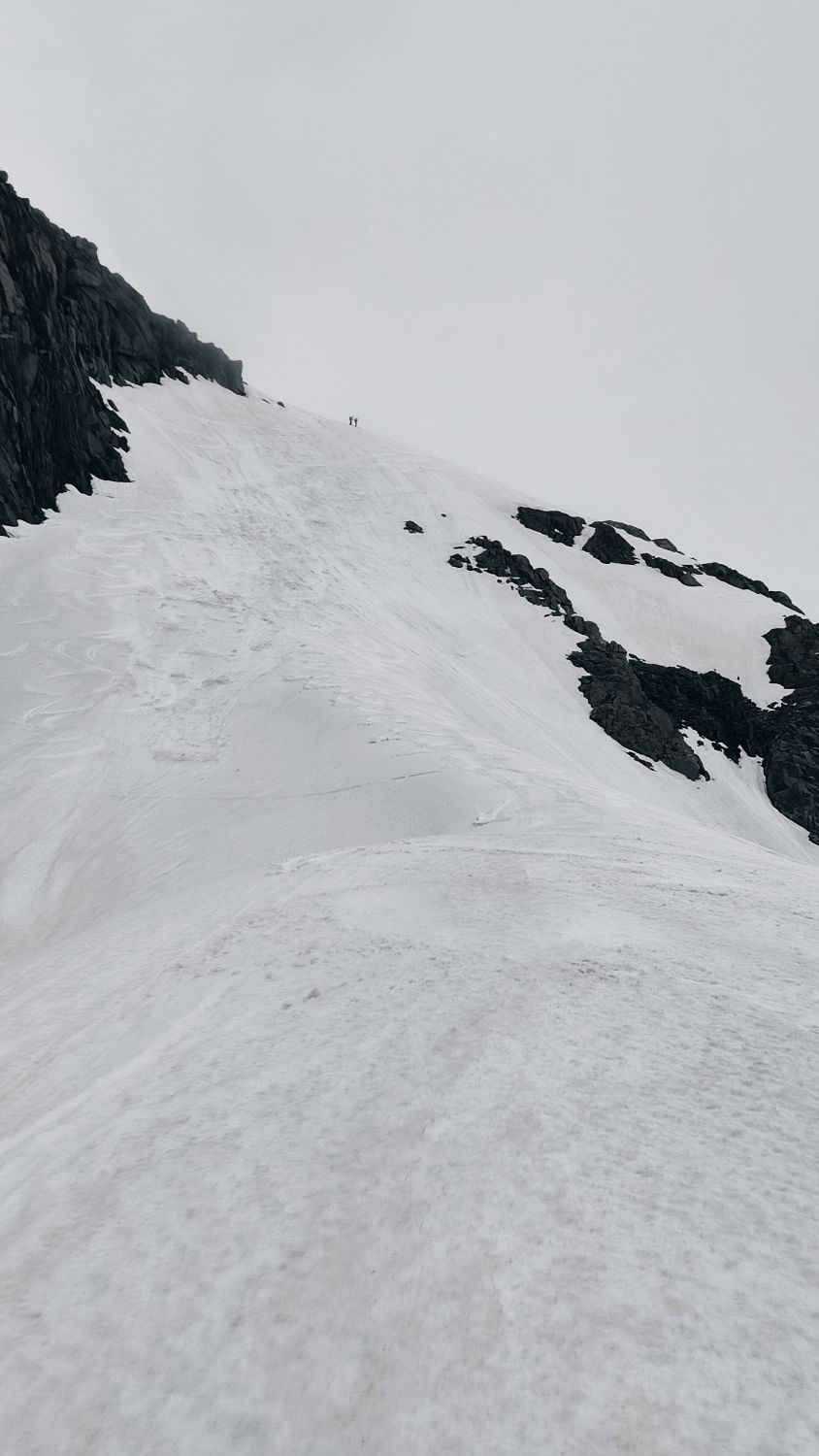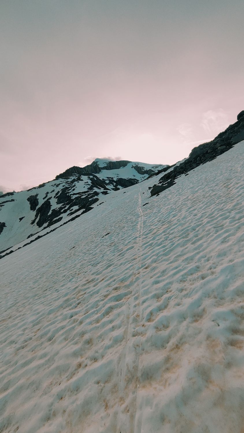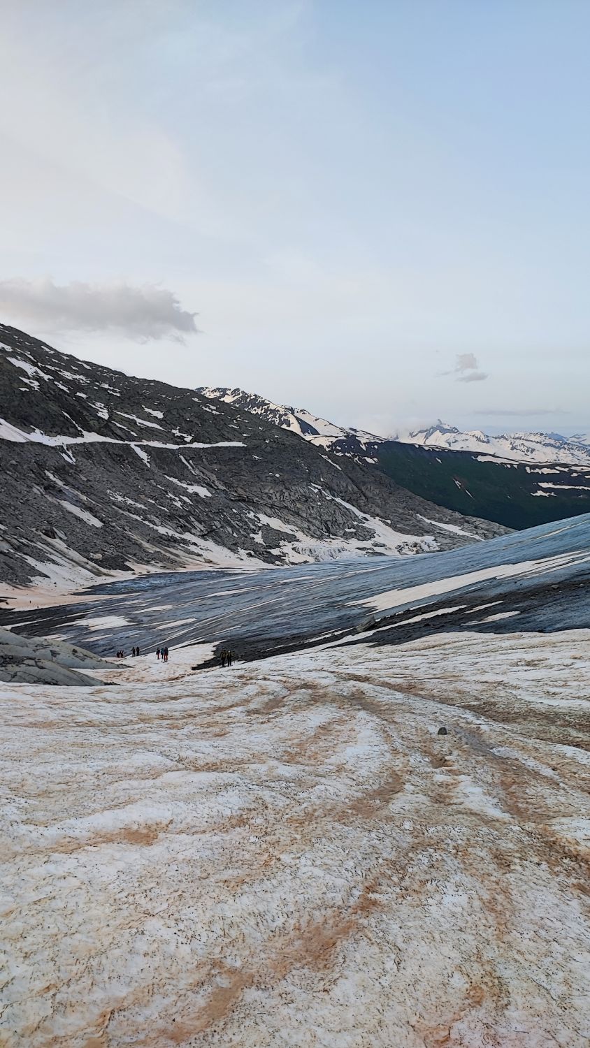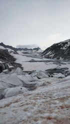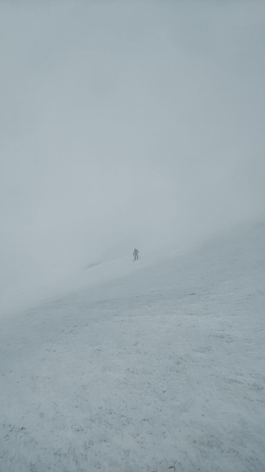 Ab dem Gletscher rechtsseitig noch schmaler Schneestreifen. Nur 1x kurz Ski tragen. Achtung auf Steinschlag. Ab Abzweigung dann erstaunlich gute Verhältnisse. Harscheisen nicht nötig. Ab ca. 3200m dann Sumpf und dichter Nebel plus immer wieder starker Föhn. Abfahrt über den Galengletscher. Sehr gut zu fahren.