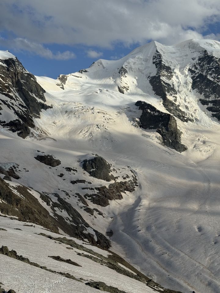 Abfahrt von der Diavolezza mit Ski zum Vadret Pers nicht mehr lange möglich. Vadret Pers dürfte noch eine Weile gut zu gehen & zu fahren sein, Schnee wird allerdings im Tagesverlauf recht weich, zum Teil bremst der Sahara-Staub. Begehung mit Schneeschuhen (wurde von vielen gemacht) aktuell sicher auch eine gute Alternative.