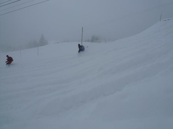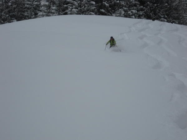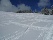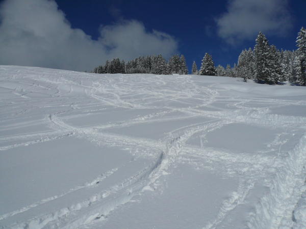 Ca. 50 cm wunderbarer Pulverschnee. Gut gespurt bis oben, noch wenig verspurte Hänge. Es schneite immer wieder leicht, was der Tour keinen Abbruch tat. Im Gegenteil, es waren weniger Leute unterwegs. Sind die Tour nochmals am Sonntag bei strahlendem Sonnenschein gegangen. Teils schon sehr verfahren, trotzdem noch ein paar unverspurte Stellen gefunden. Es war fast schon zuviel Tiefschnee für manche weniger steilen Passagen. Anfangs gab es einige Straßen zu queren, die teilweise schneebedeckt waren.