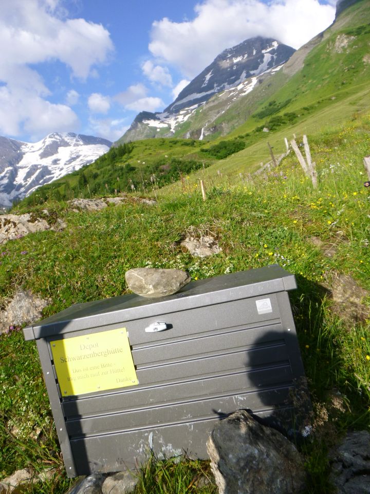 Die Grasweg-Passagen vor und nach der „Schwarzenberg-Kiste“ waren sogar gemäht. Wir trafen auf das erste Bewartungsteam der Hütte in diesem Jahr und zählten dort zu den ersten Besuchern. Vielen Dank an Barbara und Ferdinand für die nette Runde am Abend im kleinen familiären Kreis. Zeitgleich mit uns am frühen Vormittag erreichten 2 Bergsteiger die Hütte, in der wir rasteten, bevor wir weiter gingen. Sie stiegen hinauf zur Gruber-Scharte und wollten zum H.-Schwaiger-Haus.
