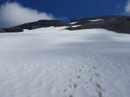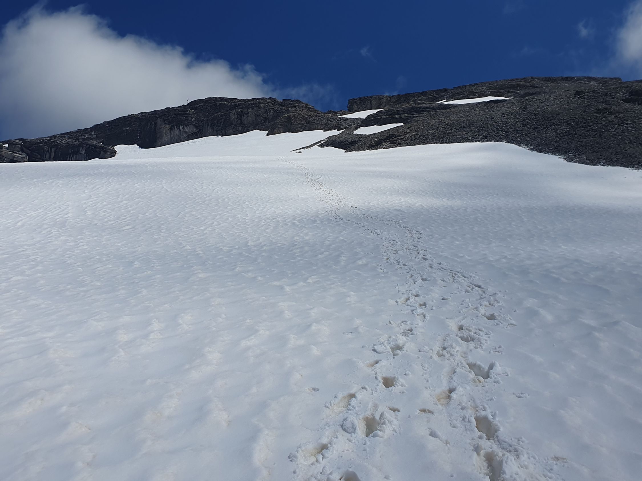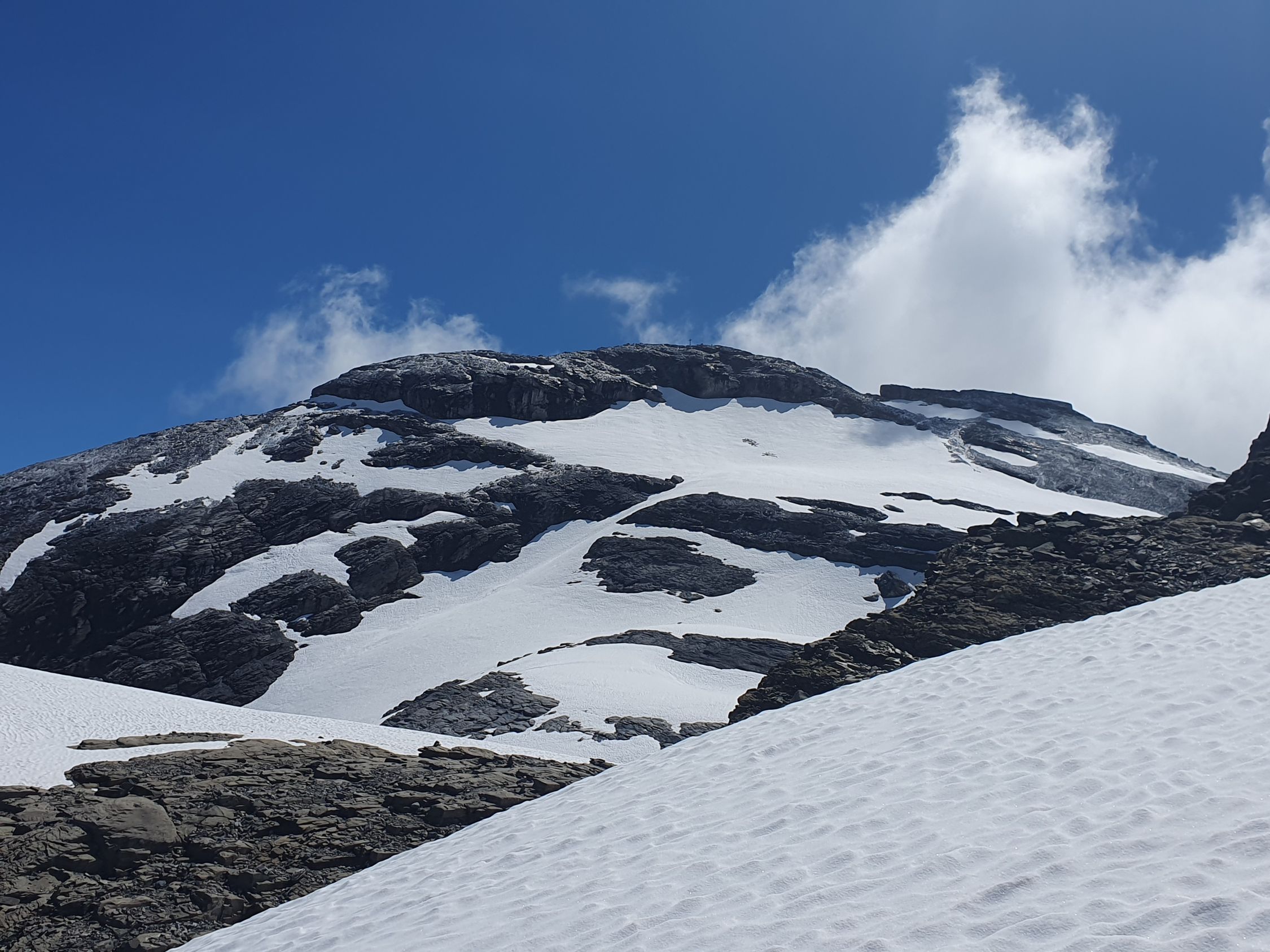 Anstieg zum Gipfel kann die erste Hälfte der Schnee umgangen weden. Danach geschlossene Schneedecke. Gipfelaufbau schneefrei.