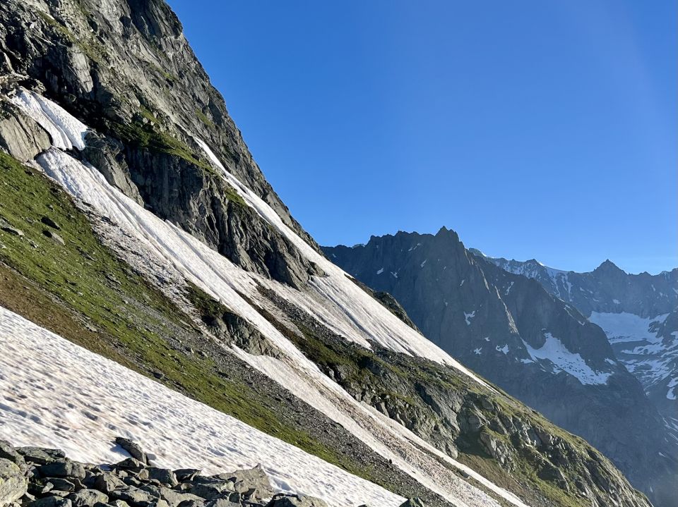 Wichtig: Wir haben das grosse, steile Firnfeld, welches direkt zum Einstieg führt, in Laufrichtung rechts im Grass/Geröll umgangen, was super ging und überhaupt keinen Nachteil bringt und meines Erachtens viel sicherer ist. Das Firnfeld direkt zum Einstieg ist ziemlich hart und steil, es macht keinen Sinn weit oben zum Einstieg zu traviersieren, weil es sehr heikel ist und mit den Steigeisen anziehen&evtl irgendwie sichern wahrscheinlich auch viel länger dauert. (Siehe Markierung im Foto).