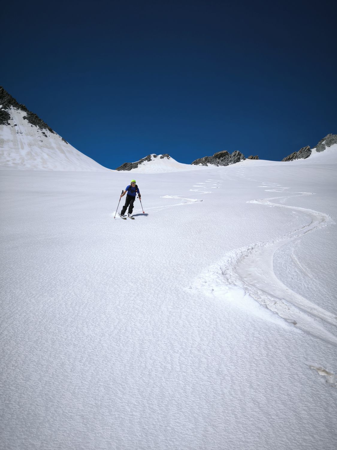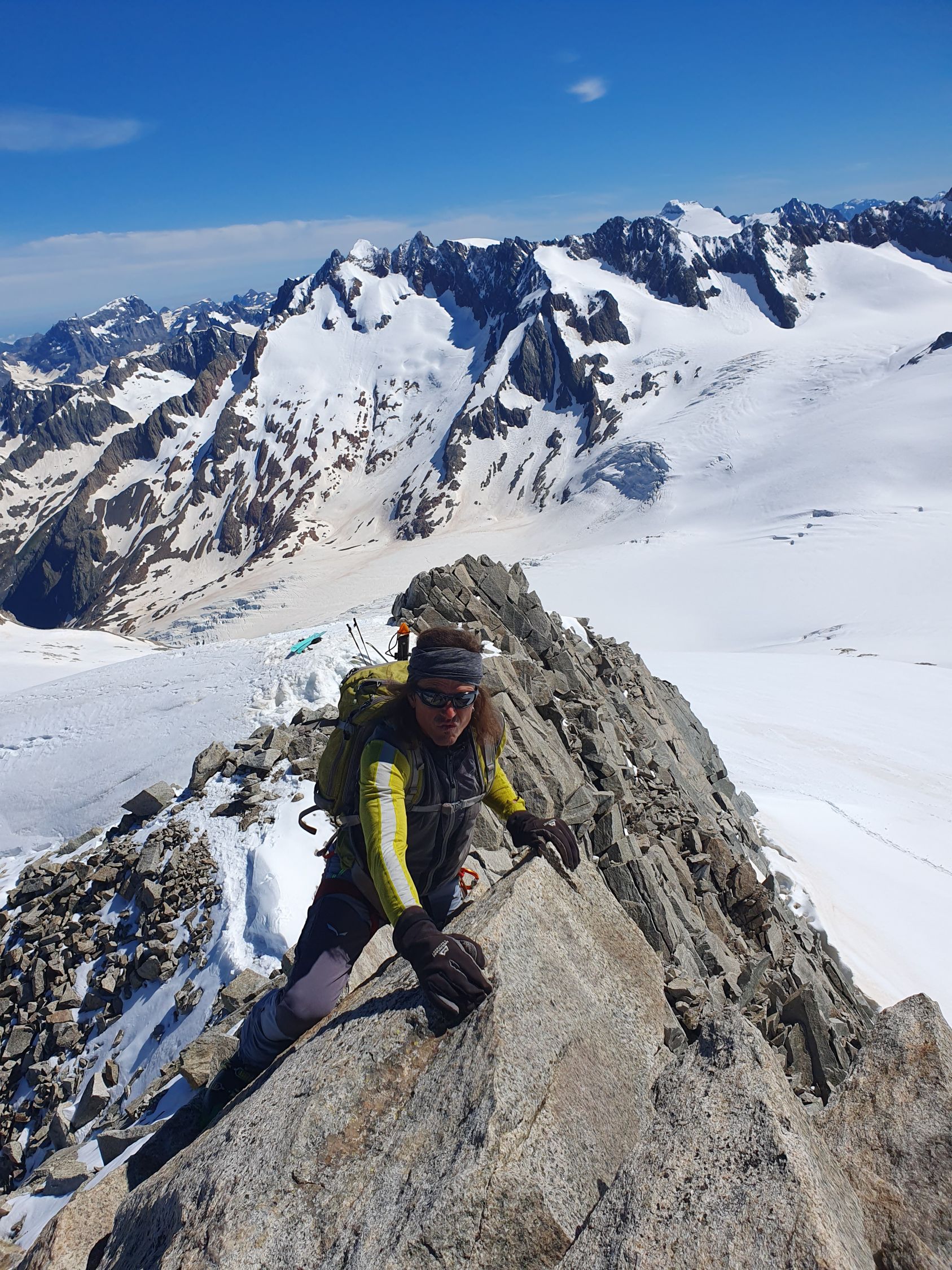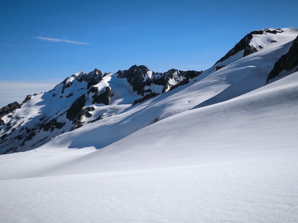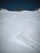 Start um 5:30. Wir sind orografisch den ersten Teil des Gletschers rechts hoch. Somit konnte man die Ski nach 10min anschnallen. In der Nacht hat es mal ausnahmsweise gut abgestrahlt im Vergleich zu den letzten Wochen. Von der Undri Limi ganz kurze Abfahrt, um dann links am Hang entlang zum südlichen Wandfuss des Diechterhorns zu gelangen. Da dort das Englische Militär übte sind wir vorher noch zu Pkt. 3318m traversiert und machten dort unsere Pause. Anschließend zum Diechterhorn zurück, der dann verwaist war. Skidepot direkt unter den Felsen mit anschließender anregender und konzentrierter Kraxelei auf den Hauptgipfel. Nach der tollen Abfahrt vom Gipfel sind wir noch auf den Limistock, um von dort direkt wieder über den Rhonegletscher nach Belvedere zurück kommen. Teilweise mit Stöckeln. Eine gelungener Skitourentag mit Bergrider.