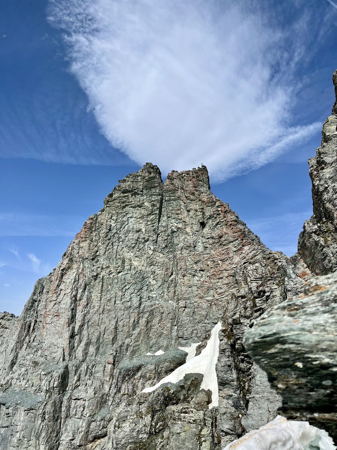 Noch viel Schnee in der Region. Erste Abschnitte der Route ebenfalls Schnee, einige Haken verdeckt. Alternativ selber sichern - alpin. Zugang zum Mittelgrat ist heikelste Stelle (Absturzgelände, sieht einfach aus, aber sehr brüchig), im Abstieg via Stand gesichert.