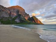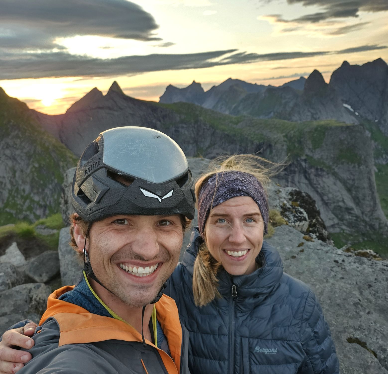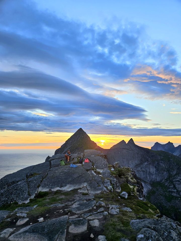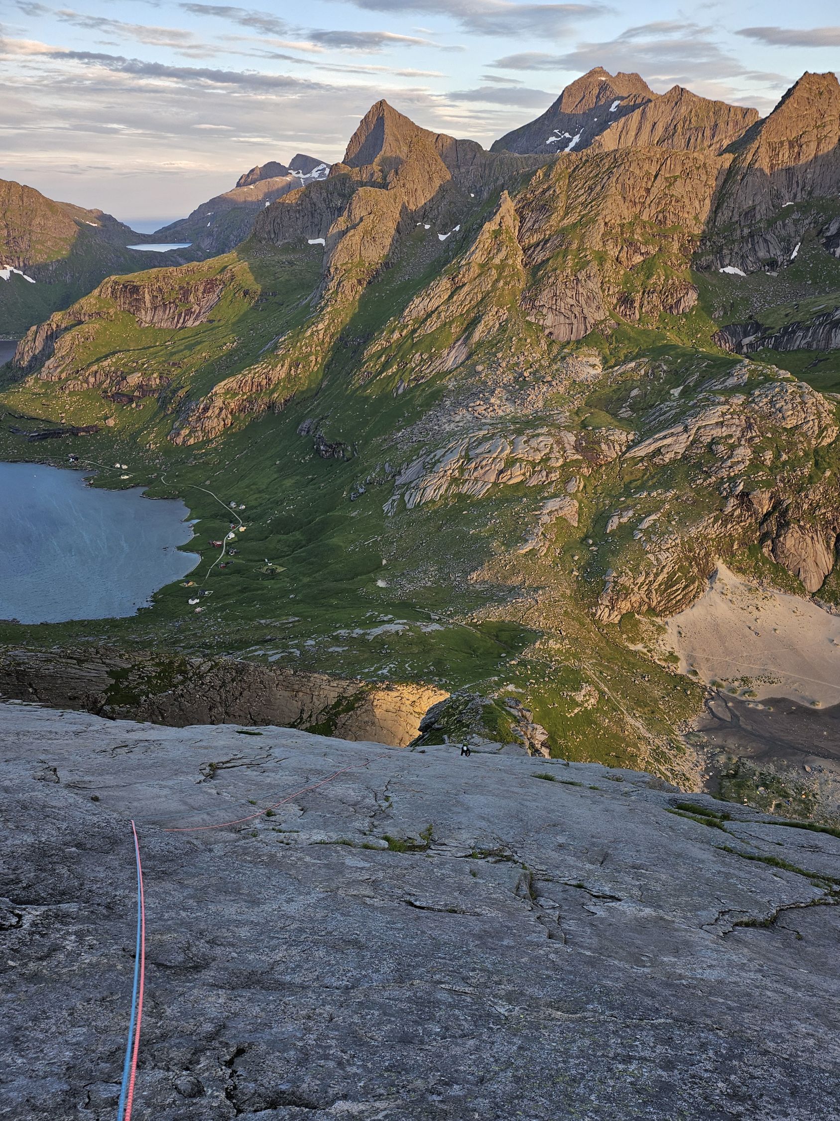 Anreise von Reine mit der Fähre nach Vinstad. Es empfiehlt sich die Tickets vorher online zu kaufen. Weil die 9 Uhr Fähre bereits voll war konnten wir erst mit der 15 Uhr Fähre nach Vinstad. Obwohl wir deshalb erst um 19.00 eingestiegen sind, konnten wir fast die ganze Route in der Abendsonne klettern. Die Gipfelplatten waren dann im Schatten. Gipfel exakt um Mitternacht. Sehr empfehlenswert!