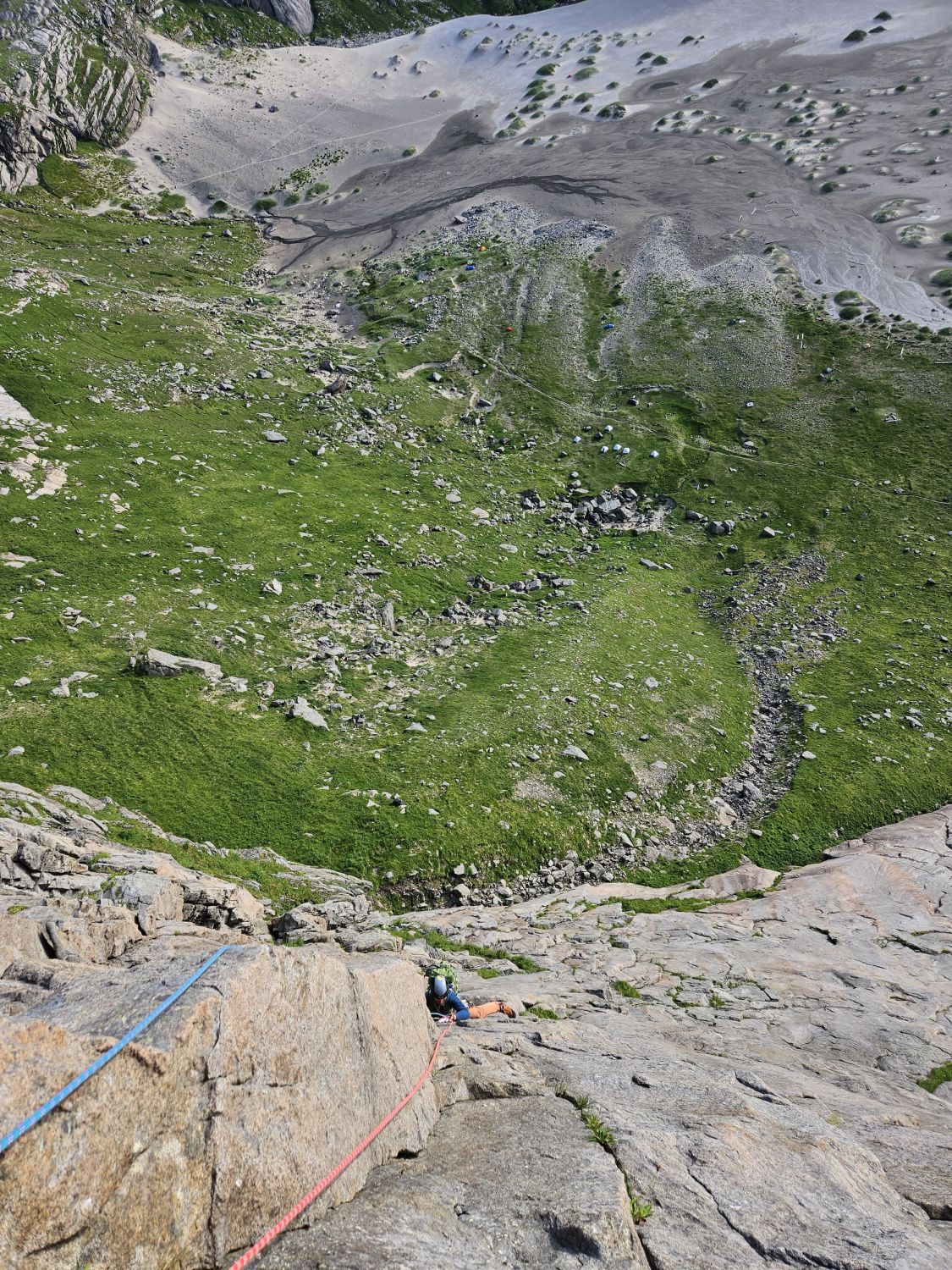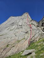 3) 25m N6+ (eine Stelle) nach rechts in die auffallend rote Verschneidung und diese hoch auf die grosse Terrasse. Kurz, anstrengend, bestens gesichert und richtig geil! Stand an Zacken.