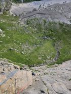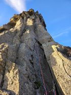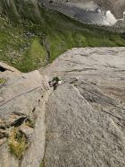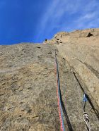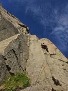 3) 55m N6+ die Verschneidung hoch (Foto). Sobald es zu schwierig wird in die nächste Verschneidung links und später mit einem delikaten Zug zurück. Besser nicht stürzen, denn das Seil würde mehrere Meter über die scharfe Felskante gerissen. Hat man das geschafft steht man beim zweiten improvisierten Abseilstand und fragt sich vielleicht ob man ebenfalls kapitulieren sollte. Aber der Weiterweg ist nun nicht mehr so schwierig. Nochmals nach links eine Verschneidung hoch und rechts aussteigen (brüchig). Stand an Zacken und Keil.