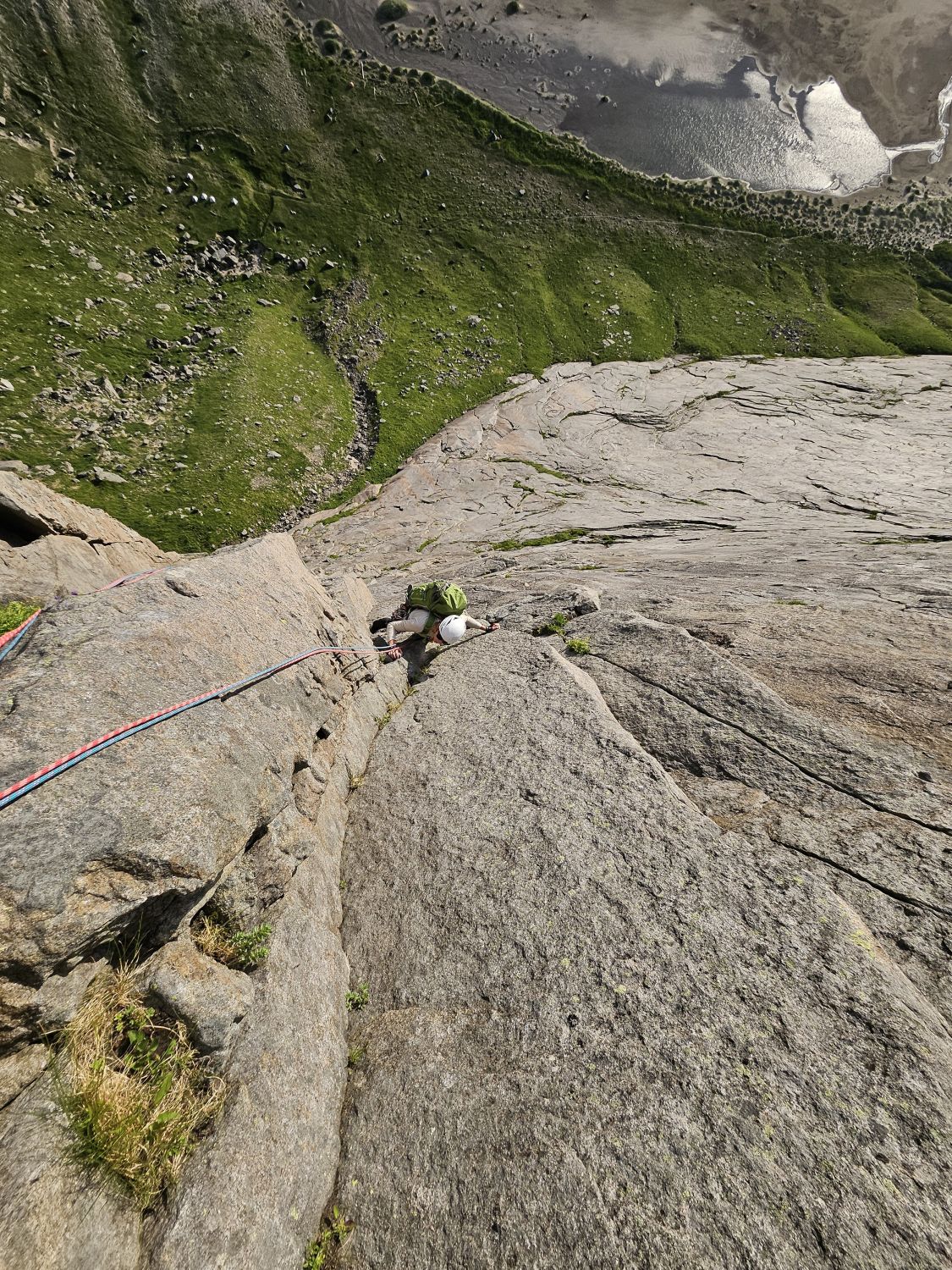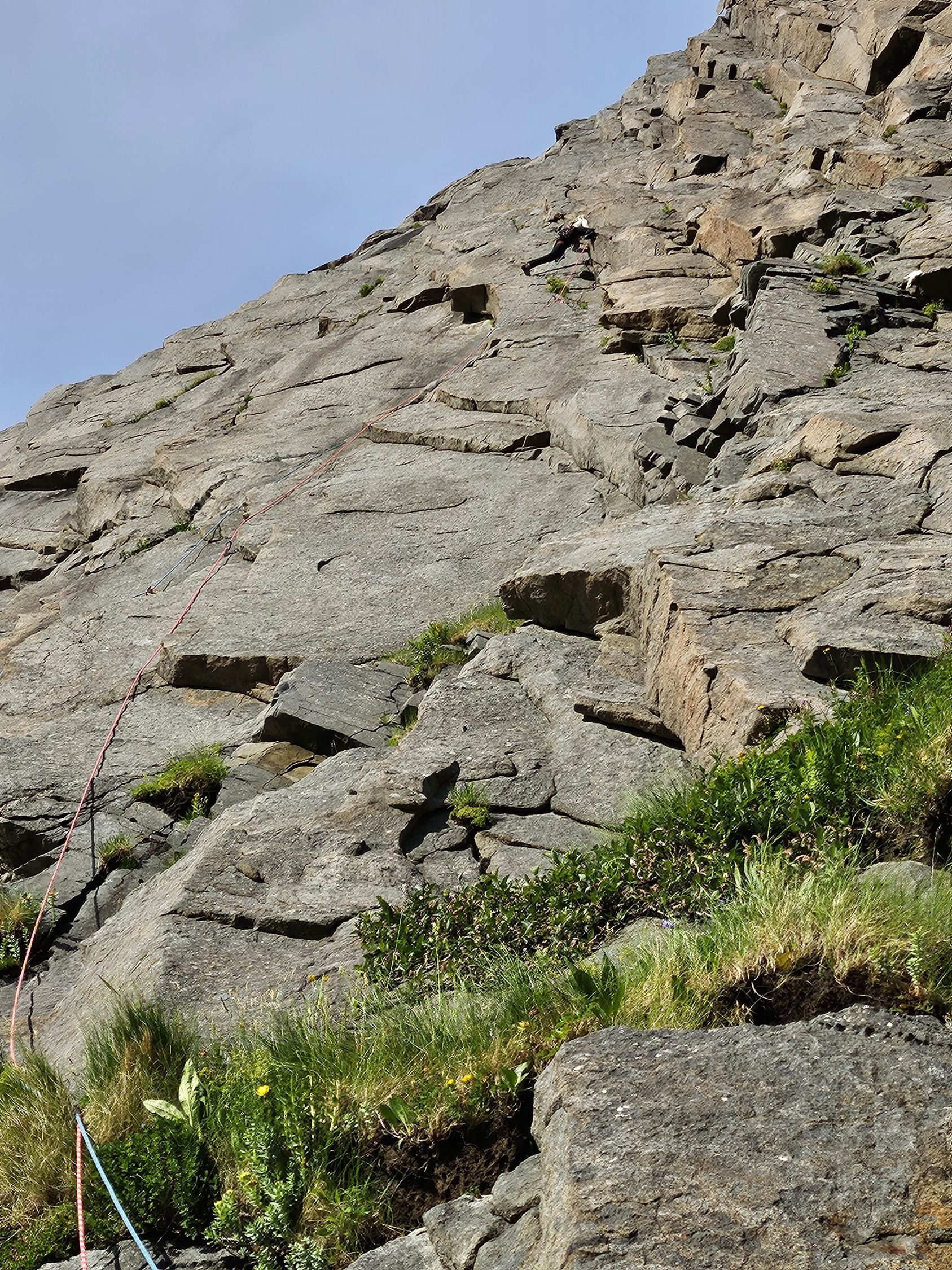 Wir sind die Gipfelplatten simultan geklettert mit Microtraxions alle 60m. Unterwegs musste ich einmal Stand machen, da mir die Micros ausgegangen sind. Den einfachsten Weg suchend immer leicht nach links driftend stösst man ca. 100m vor dem Gipfel auf Wegspuren. Wenn man auf den Platten die Hände benötigt ist man vom einfachsten Weg abgekommen. Den letzten Teil kann man problemlos Seilfrei oder am kurzen Strick gehen. Aber ich hatte keine Lust das System zu wechseln. Total sind es ca. 300m Plattenkletterei.