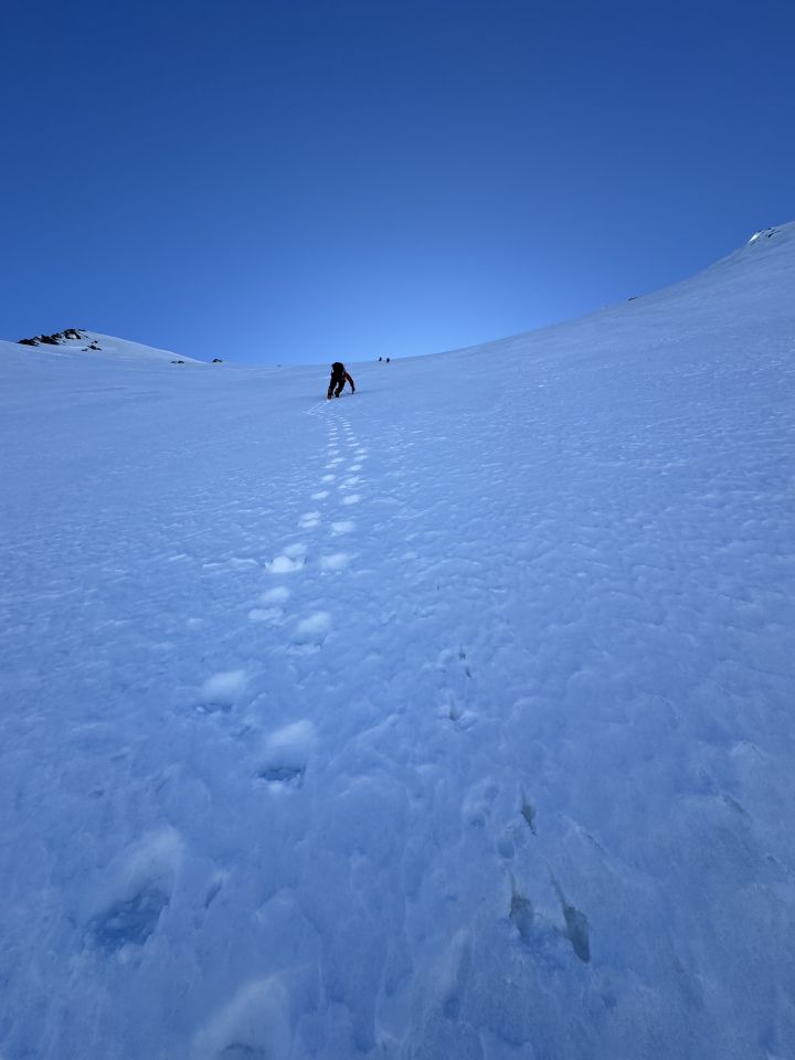 Dem Nollen sind wir links umgangen im sehr guter trittschnee. Weiter oben haben wir dann 1 seillange gesichert wegen dunnes schnee