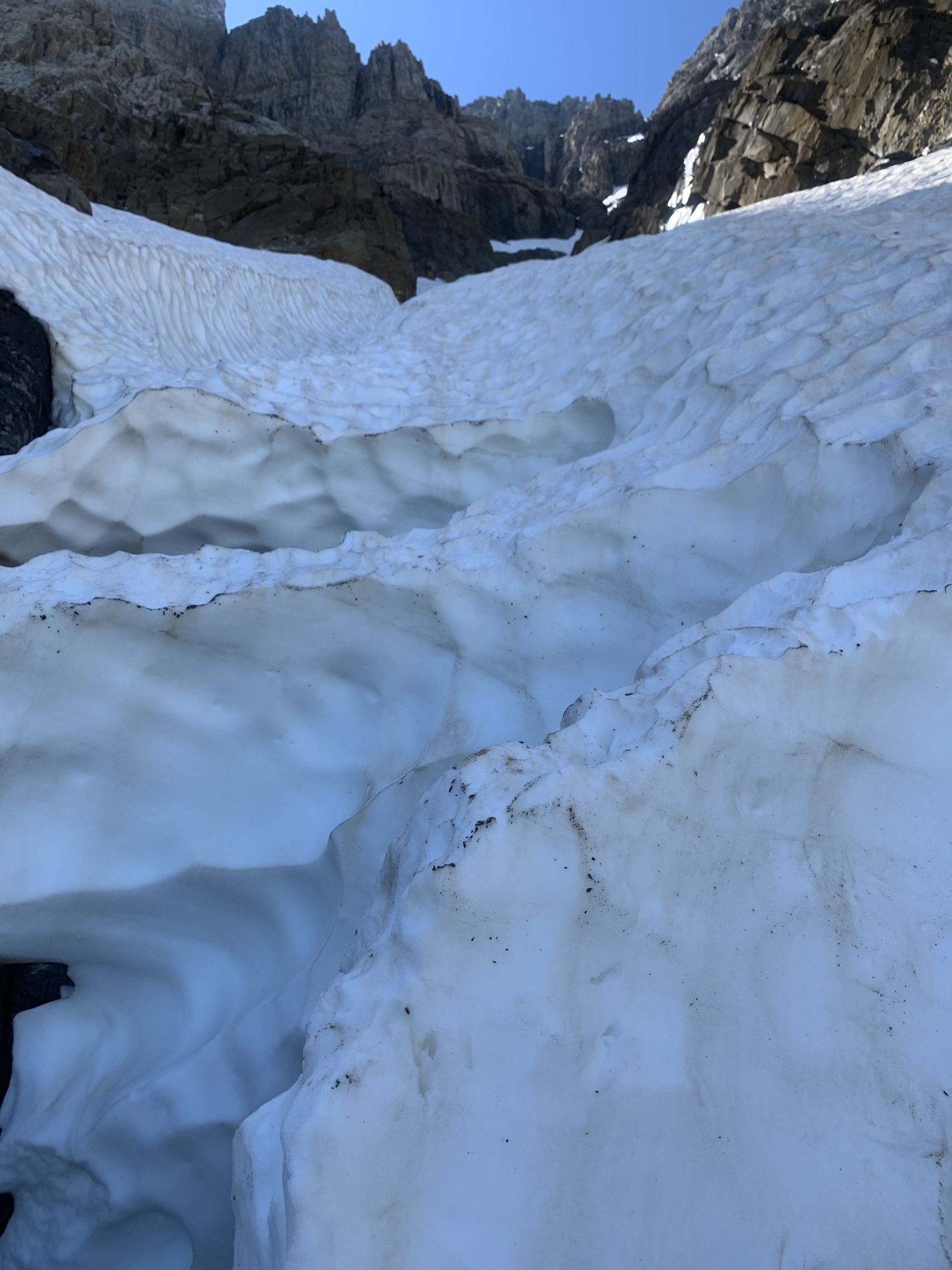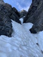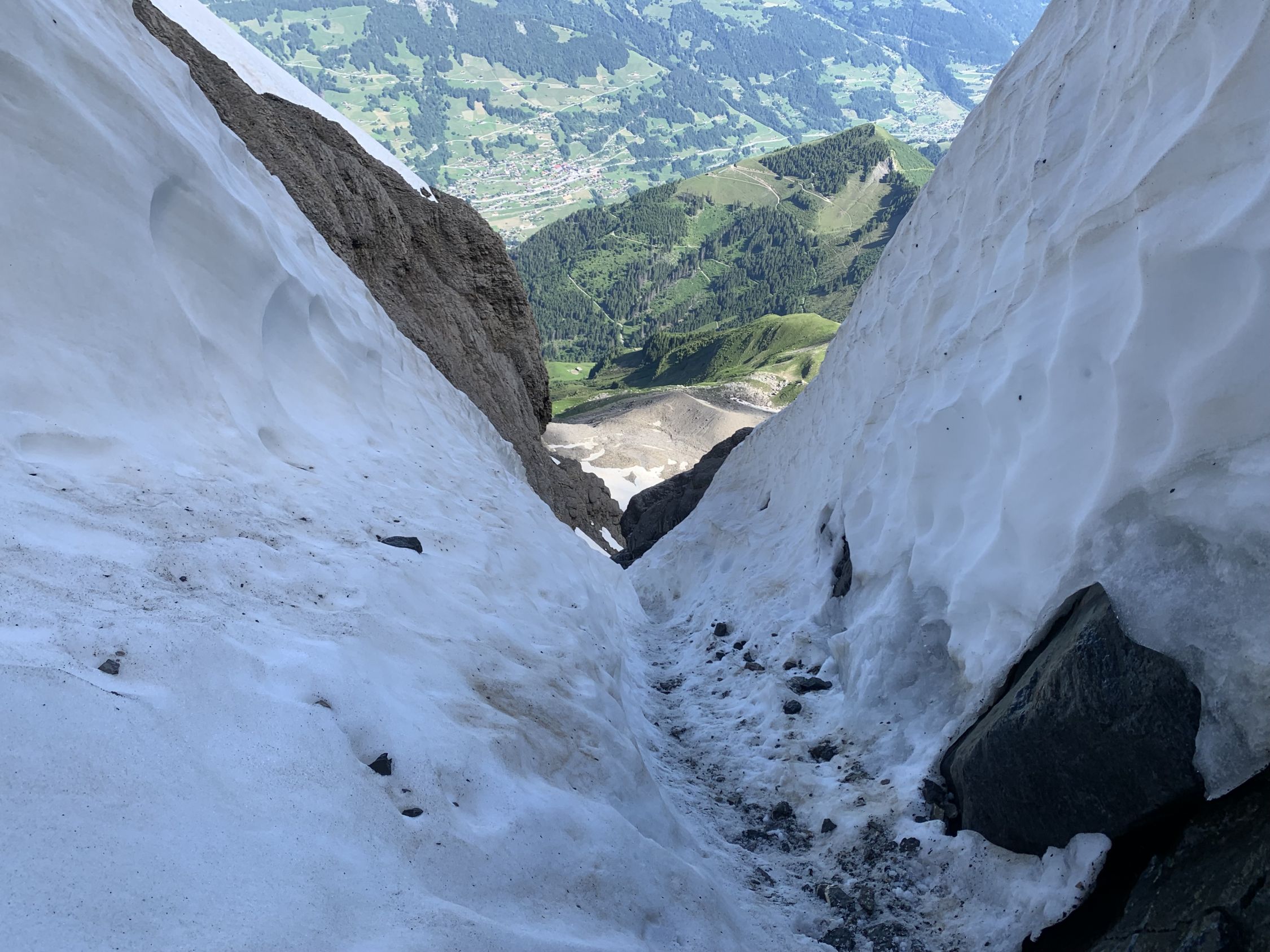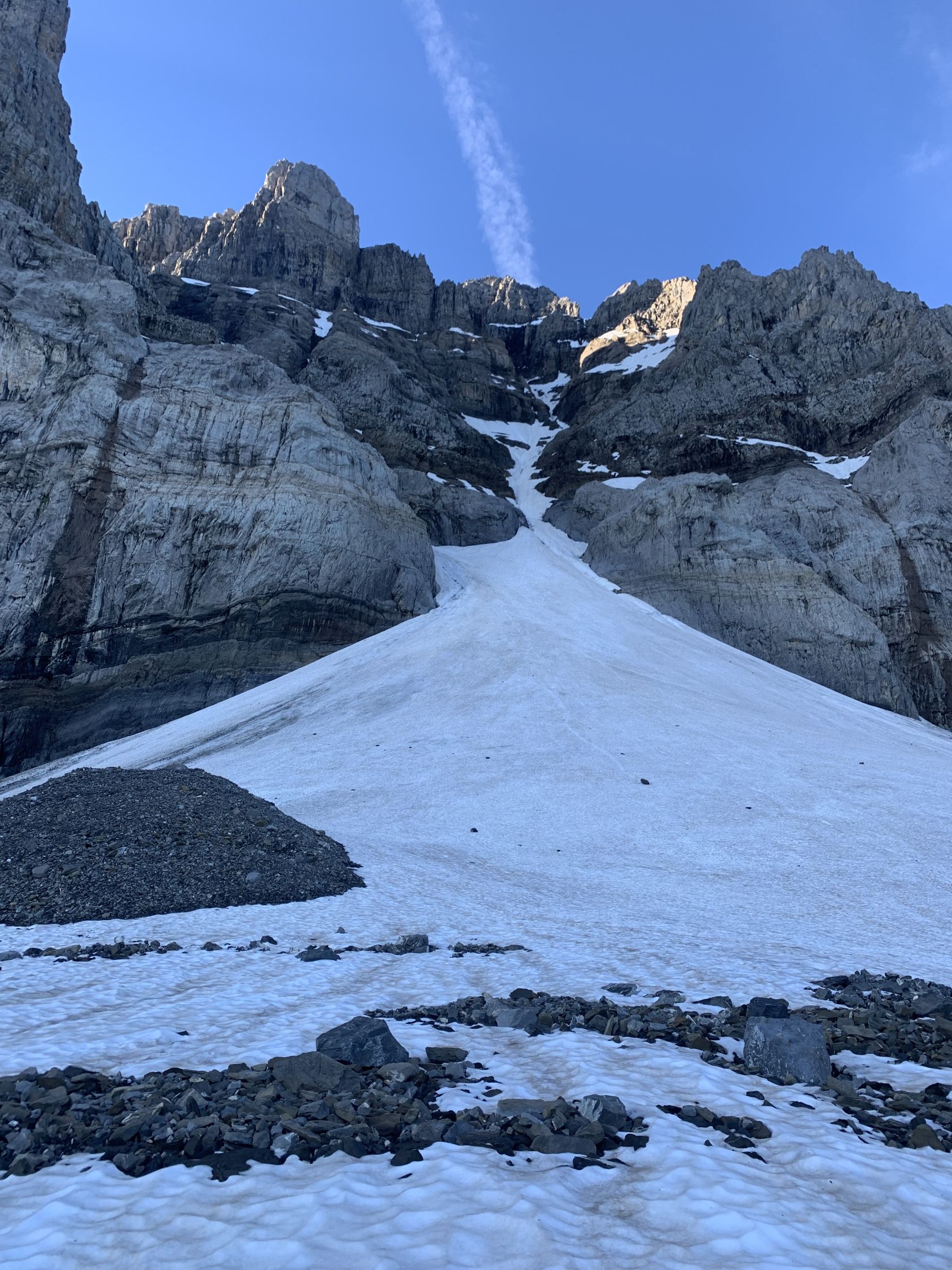 Start Alp Soi 1204 m um 5.20 Uhr bei 15°C. Wanderweg bis Lac de Soi bis auf zwei kurze Einzelstellen aper. Der trichterförmige Einstiegsbereich bis zum Couloiransatz geht hervorragend im griffigen Firn. Gegen 2500 m hat es einen ersten Gleitschneeriss (Bild). Hier ist der Übergang nicht mehr lange ohne erhebliche Zusatzschwierigkeiten möglich. Die Starkniederschläge der letzten Woche haben das Couloir bobbahnmässig ausgespült, oft bewegt man sich in einer 2 - 3 m tiefen Rinne. Gleichzeitig hat es aber praktisch alles loses Material heruntergespült - keinerlei Steinschlag während der Begehung. Die Firnverhältnisse sind insgesamt perfekt, Frontzacken und Eisgeräte dringen ein wie in Butter, ohne dass es jemals zu weich wäre. Aktuell hat es drei mixed Passagen, diese sind kurz, bis 60° steil und kaum absicherbar (solo ohnehin nicht). Behutsames Hochspreizen zwischen Fels und Firn ist hier erforderlich. Gegen 11 Uhr erreicht die Sonne den Trichter am Couloir Einstieg. Besonnung wird erst am Nachmittag relevant.