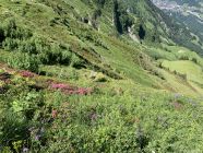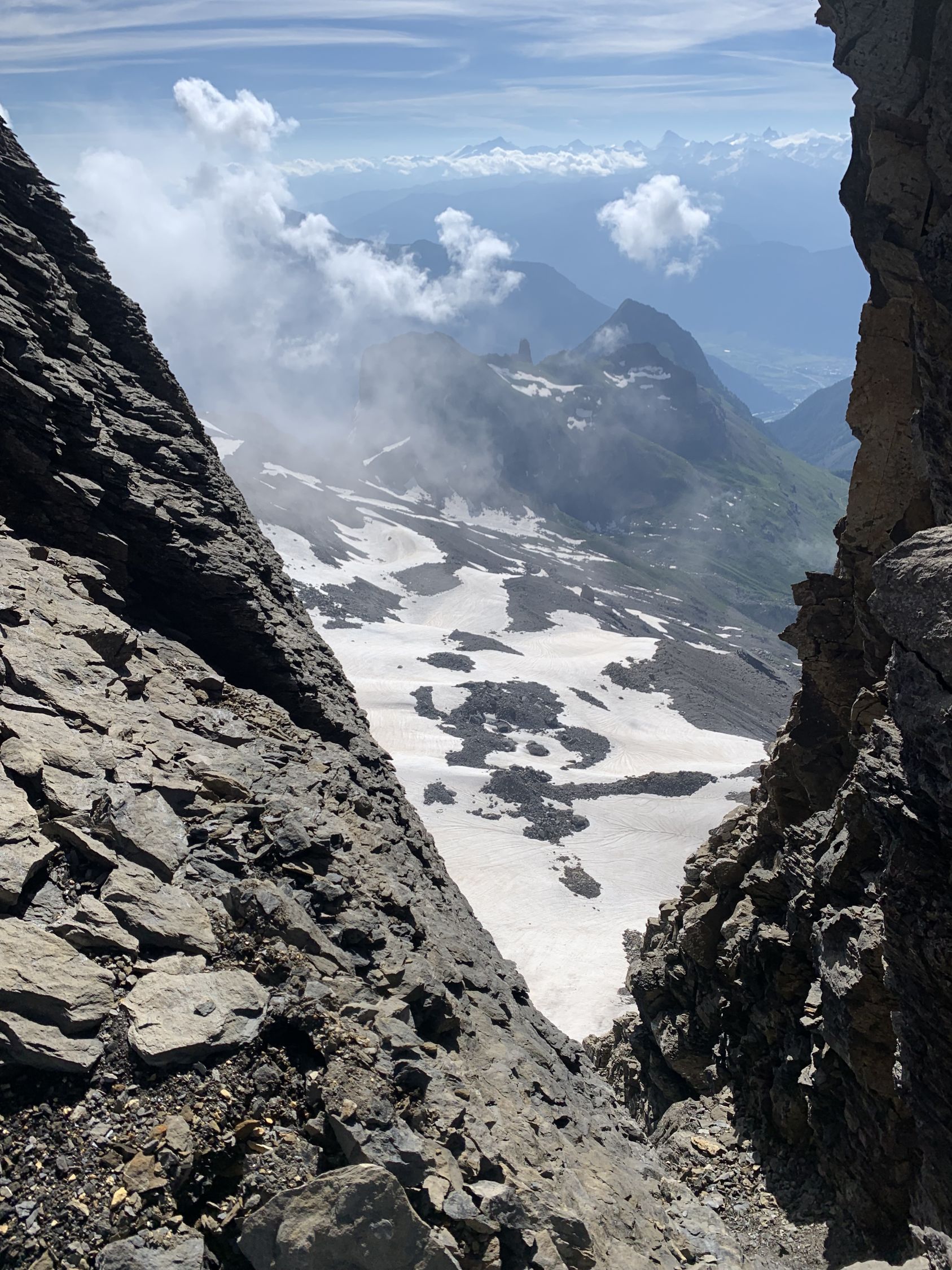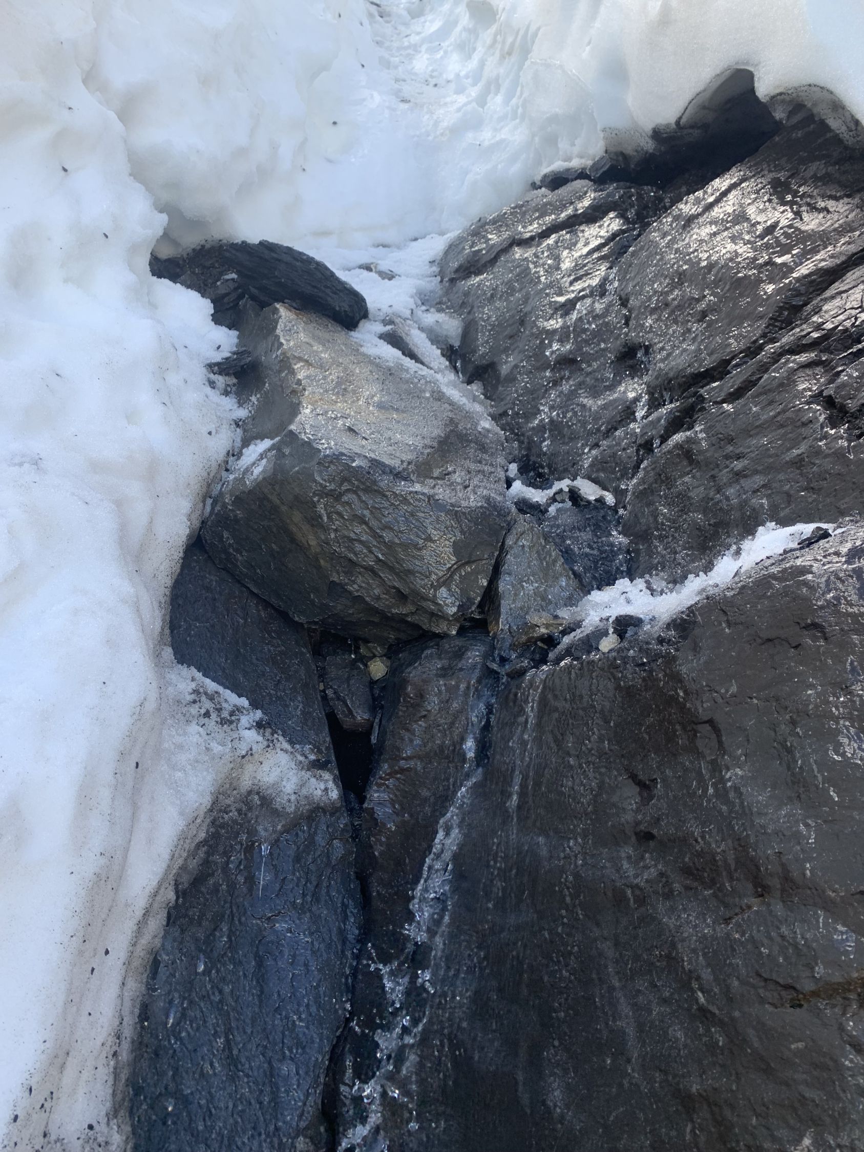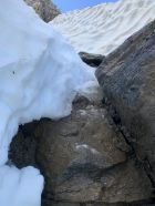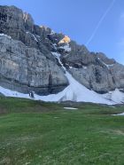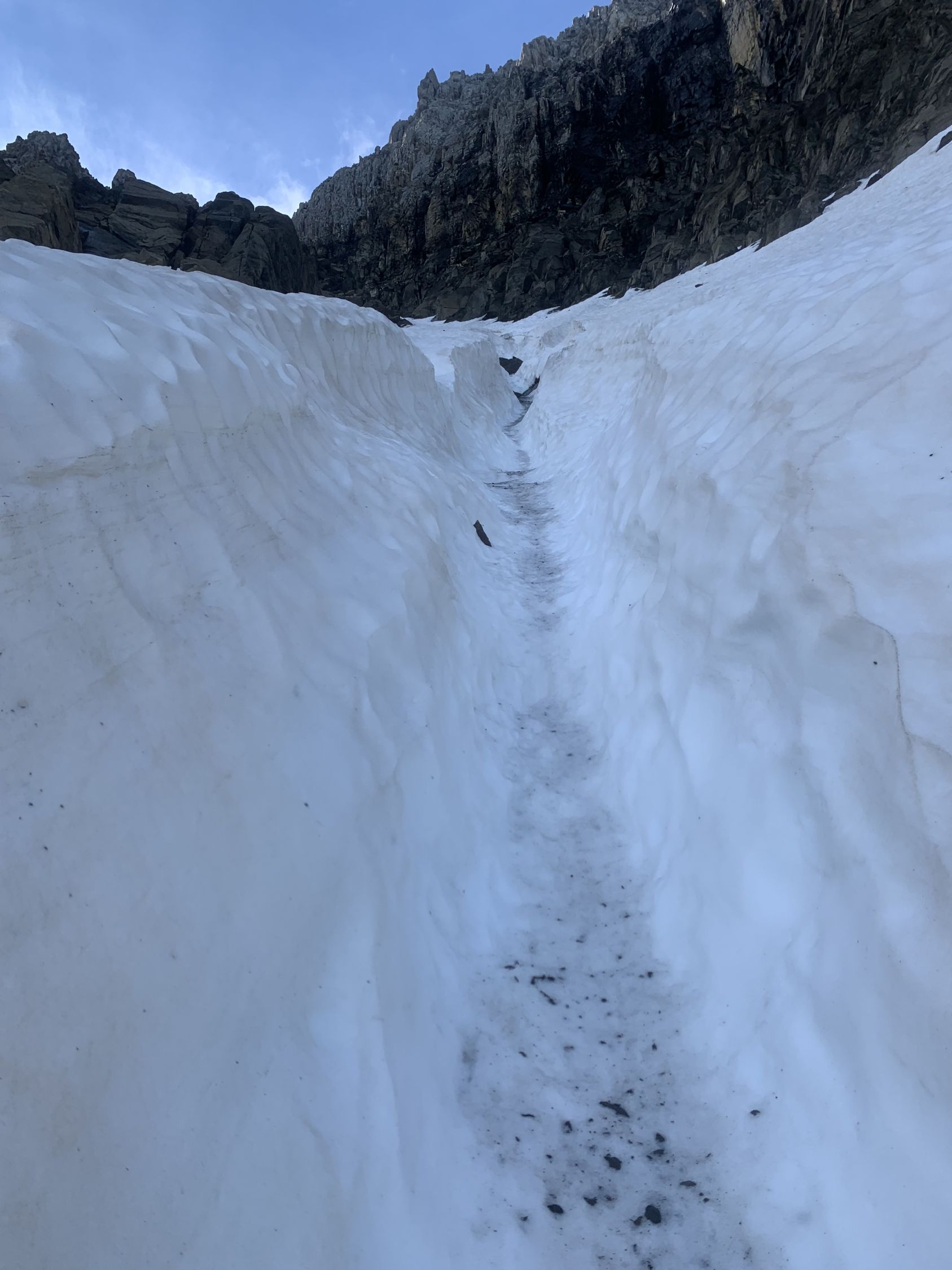 Start Alp Soi 1204 m um 5.20 Uhr bei 15°C. Wanderweg bis Lac de Soi bis auf zwei kurze Einzelstellen aper. Der trichterförmige Einstiegsbereich bis zum Couloiransatz geht hervorragend im griffigen Firn. Gegen 2500 m hat es einen ersten Gleitschneeriss (Bild). Hier ist der Übergang nicht mehr lange ohne erhebliche Zusatzschwierigkeiten möglich. Die Starkniederschläge der letzten Woche haben das Couloir bobbahnmässig ausgespült, oft bewegt man sich in einer 2 - 3 m tiefen Rinne. Gleichzeitig hat es aber praktisch alles loses Material heruntergespült - keinerlei Steinschlag während der Begehung. Die Firnverhältnisse sind insgesamt perfekt, Frontzacken und Eisgeräte dringen ein wie in Butter, ohne dass es jemals zu weich wäre. Aktuell hat es drei mixed Passagen, diese sind kurz, bis 60° steil und kaum absicherbar (solo ohnehin nicht). Behutsames Hochspreizen zwischen Fels und Firn ist hier erforderlich. Gegen 11 Uhr erreicht die Sonne den Trichter am Couloir Einstieg. Besonnung wird erst am Nachmittag relevant.