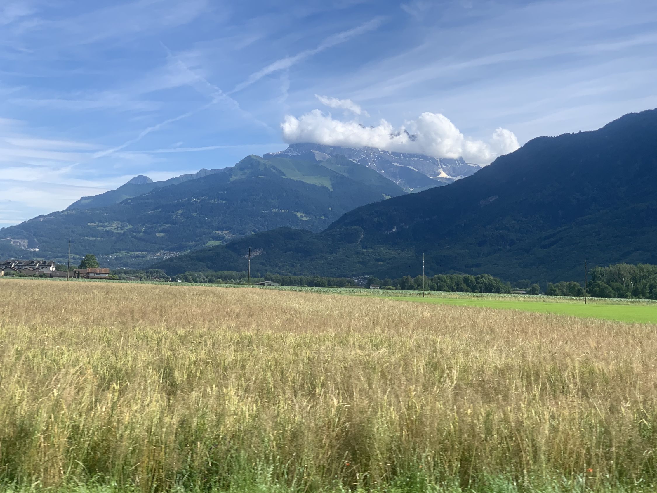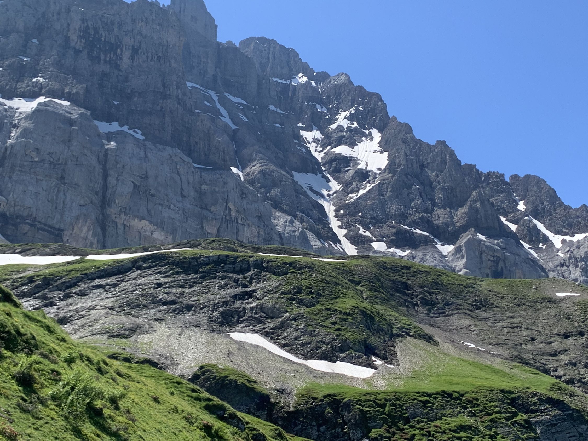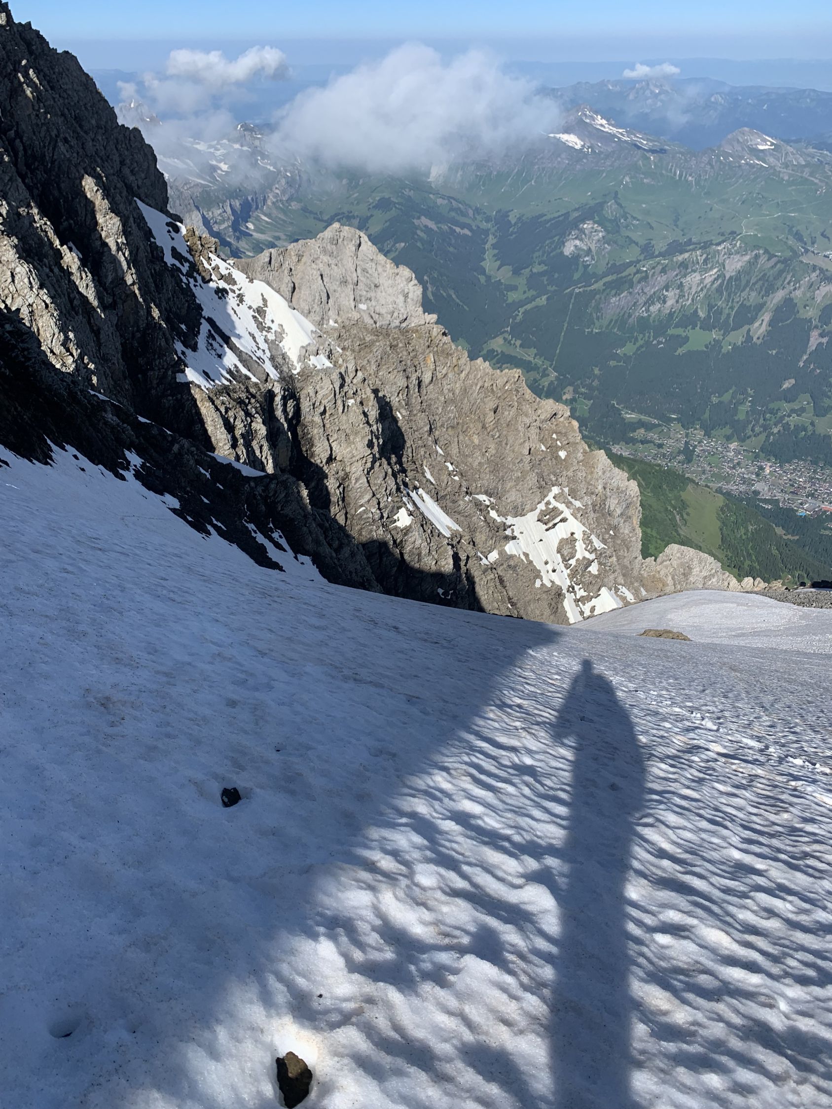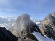 Bei unserer Anreise nach Bouveret am vergangenen Freitag fiel mein Blick von der Rhonebrücke bei Aigle VD auf die Nordflanke der Dents du Midi. Da strahlte doch eine durchgehend weisse Linie vom Couloir des Doigts mir entgegen (siehe letztes Bild). Ok, das war vllt zu Zeiten von Erich Vanis eine (Früh)Sommer-Tour, aber heute? Nun, der ewige Frühling 2024 ist vllt wie anno dazumal der Frühsommer, also warum nicht probieren? Und siehe da, Bingo - perfekte Verhältnisse. Die Zacken gingen rein wie in Butter und alles hielt!