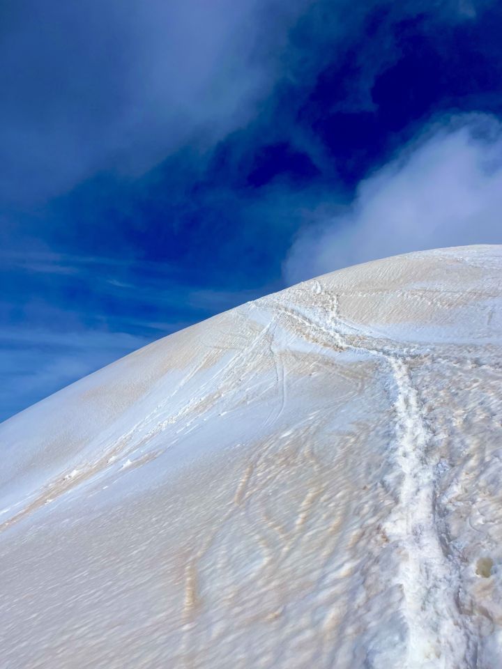 Um 7.00 Uhr bei 7 Grad auf dem Belvedere Parkplatz gestartet. Die Nacht hat den Schnee gut abgestrahlt. Der Schnee war hart und angenehm zum gehen. Links und rechts vom blanken Rhonegletscher hat es noch Schneestreifen. Konnte den grössten Teil der Strecke mit den angeschnallten Skier gehen. Musste nur 3x kurz die Skier tragen. Im Gipfelbereich hatte es zum Teil Wolken. Ab 10.30 Uhr wurde der Schnee schön aufgeweicht. So war auch der Büserschnee in der unteren Hälfte relativ gut zum fahren. Habe noch eine Brille gefunden. Wem die gehört kann sich gerne melden.