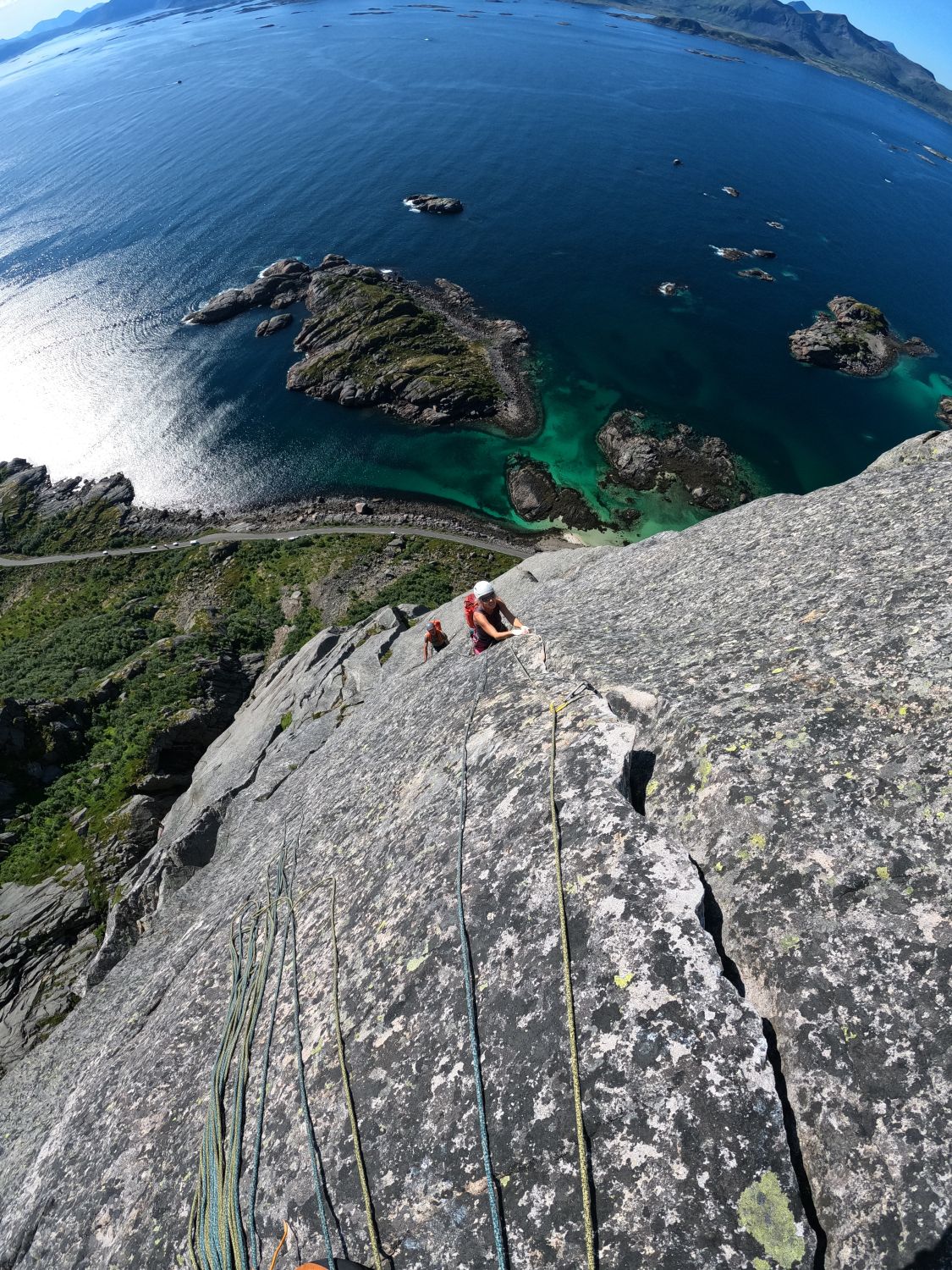 Ganze Route trocken. Ungewöhnlich warm aber ganz ok zum klettern. Wie üblich viel los in der Vestpillaren direct und freie Bahn in den übrigen Routen.
