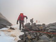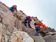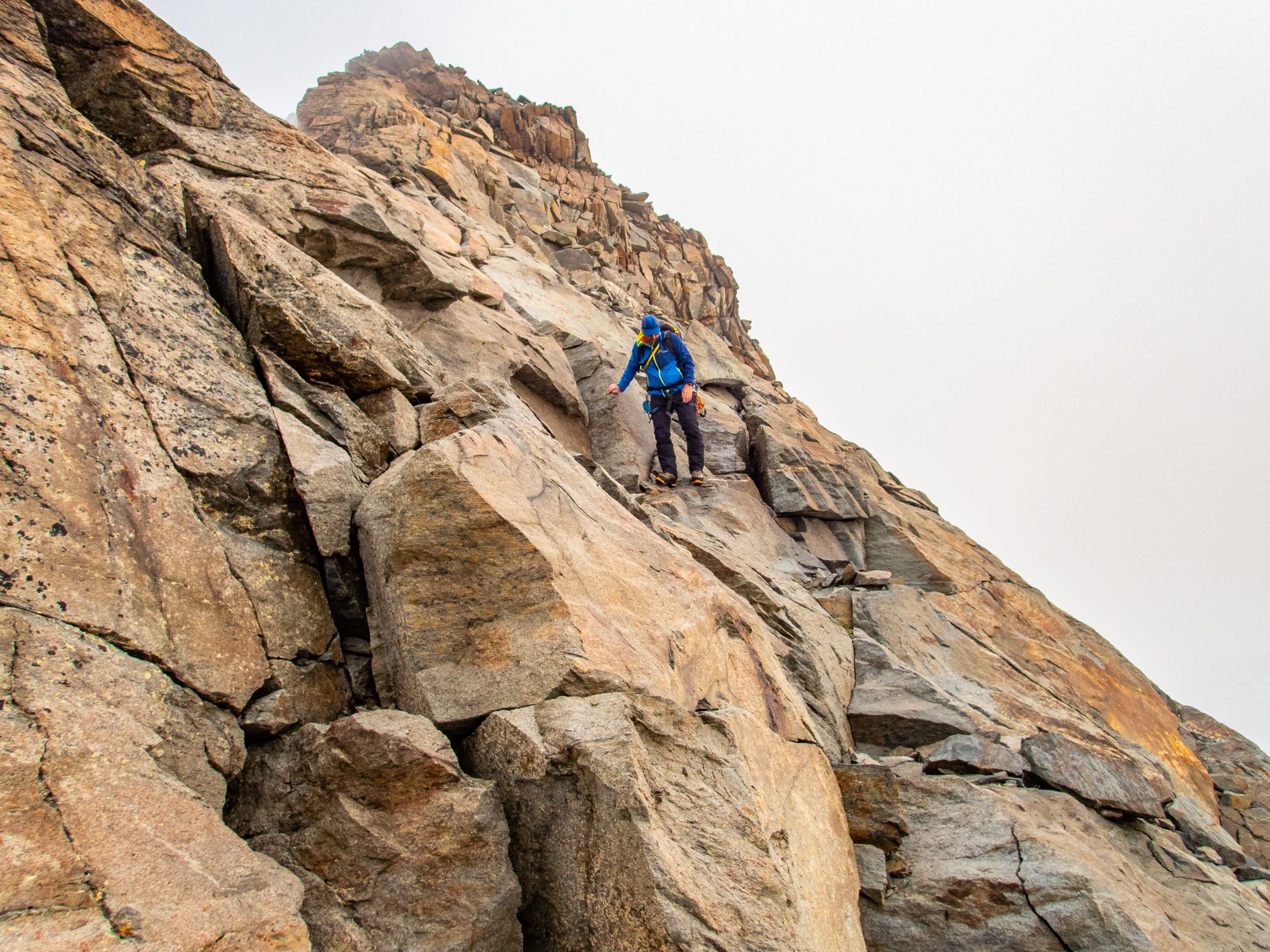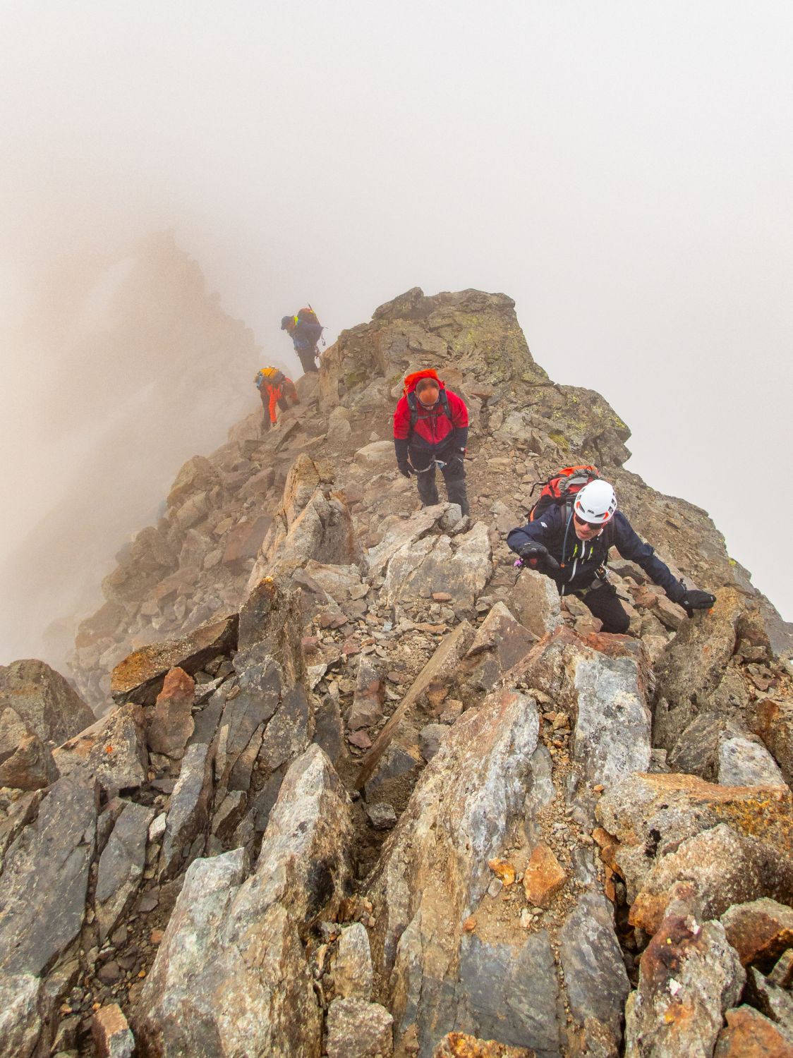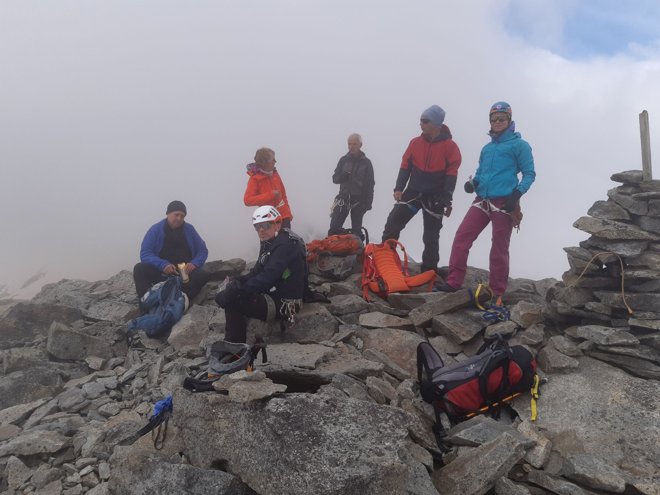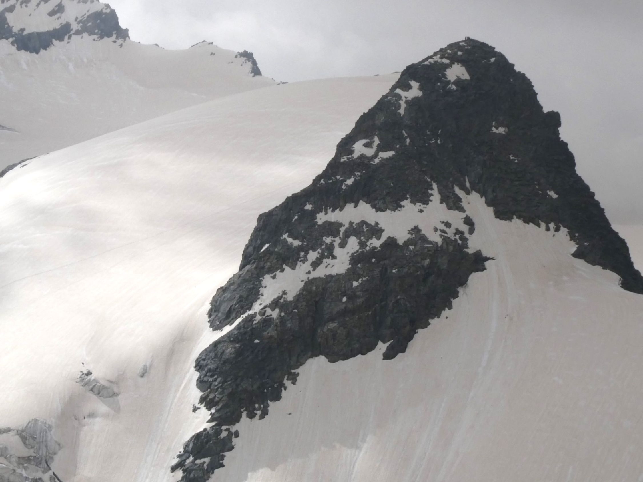 Bei ca. 3200m erreicht man einen kleinen, schwach ausgeprägten Firnrücken. Von hier geht man direkt in südwestliche Richtung hinauf ein eine klein Scharte am felsigen Gipfenaufbau. Nun in unschwierige Kraxlerei zum Gipfel (ca. 20Hm).