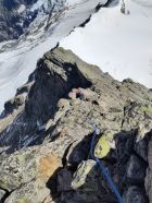 Wir sind dann über den Gletscher etwas Richtung Gleckstein abgestiegen, um den Felssporn herum und zum NE-Grat. Schnee war etwas über Knöcheltief zum spuren und recht nass. Der NE Grat war sehr schön mit gutem, angenehm zu kletterndem Fels. In der Linienwahl ist man dank wenig fixem Material recht frei, irgendwo gehts immer. Der Vorsteiger sollte aber die Schwierigkeit ca 4c unbedingt beherrschen, da der Fels oft recht geschlossen ist und Sicherungen schwierig zum anbringen sind. Insgesamt 3 Schlaghacken angetroffen, einige Friends und Keile unverzichtbar.