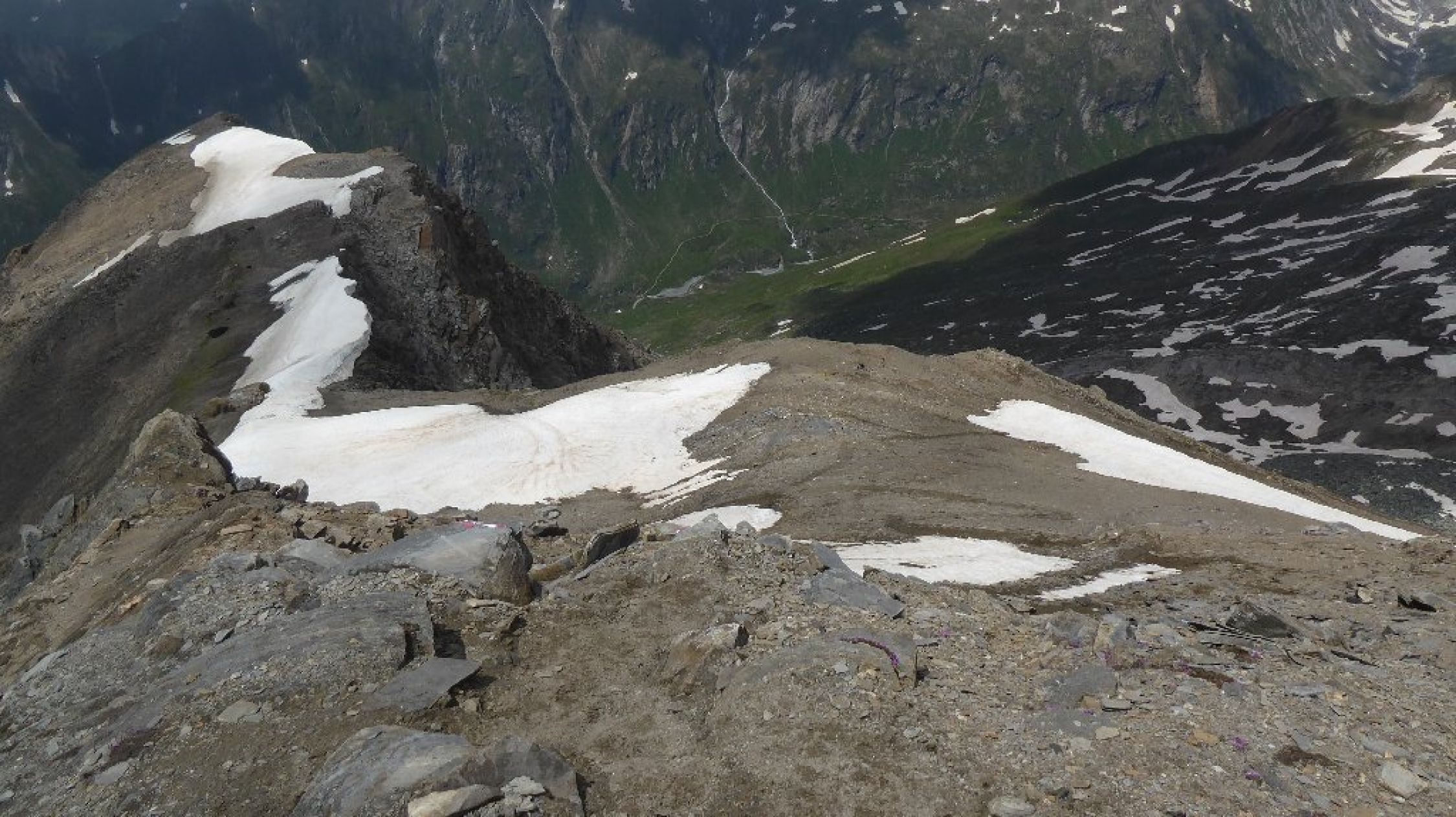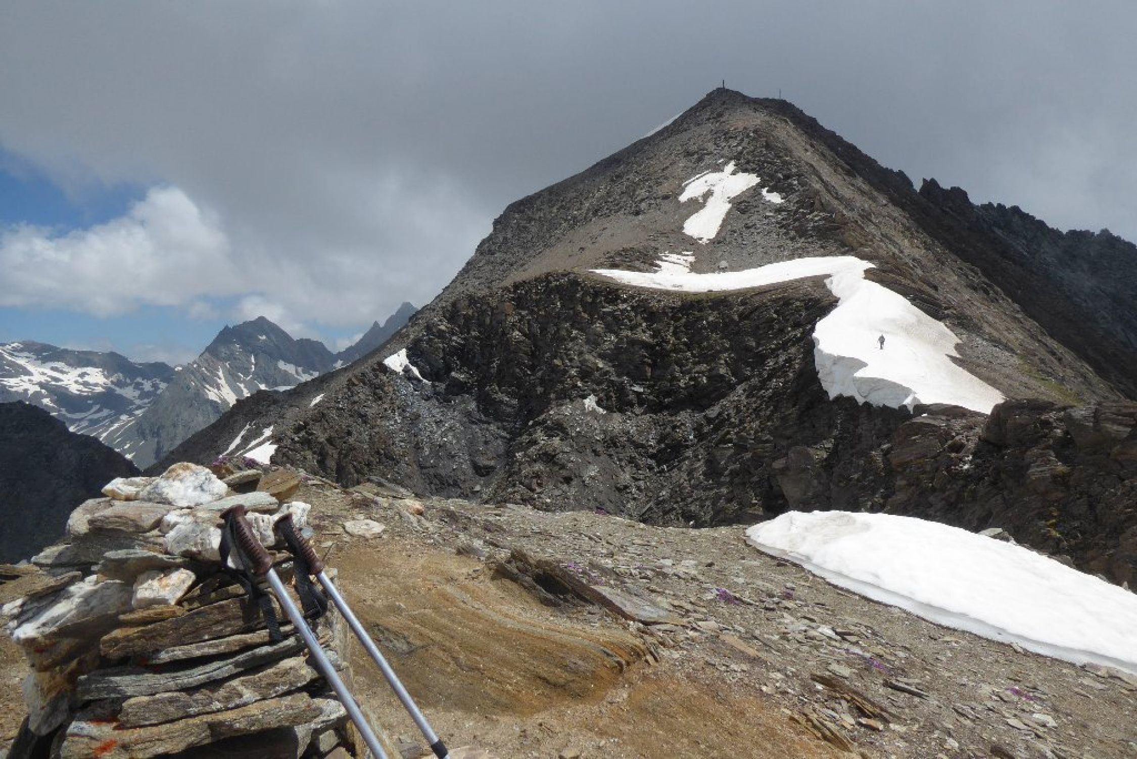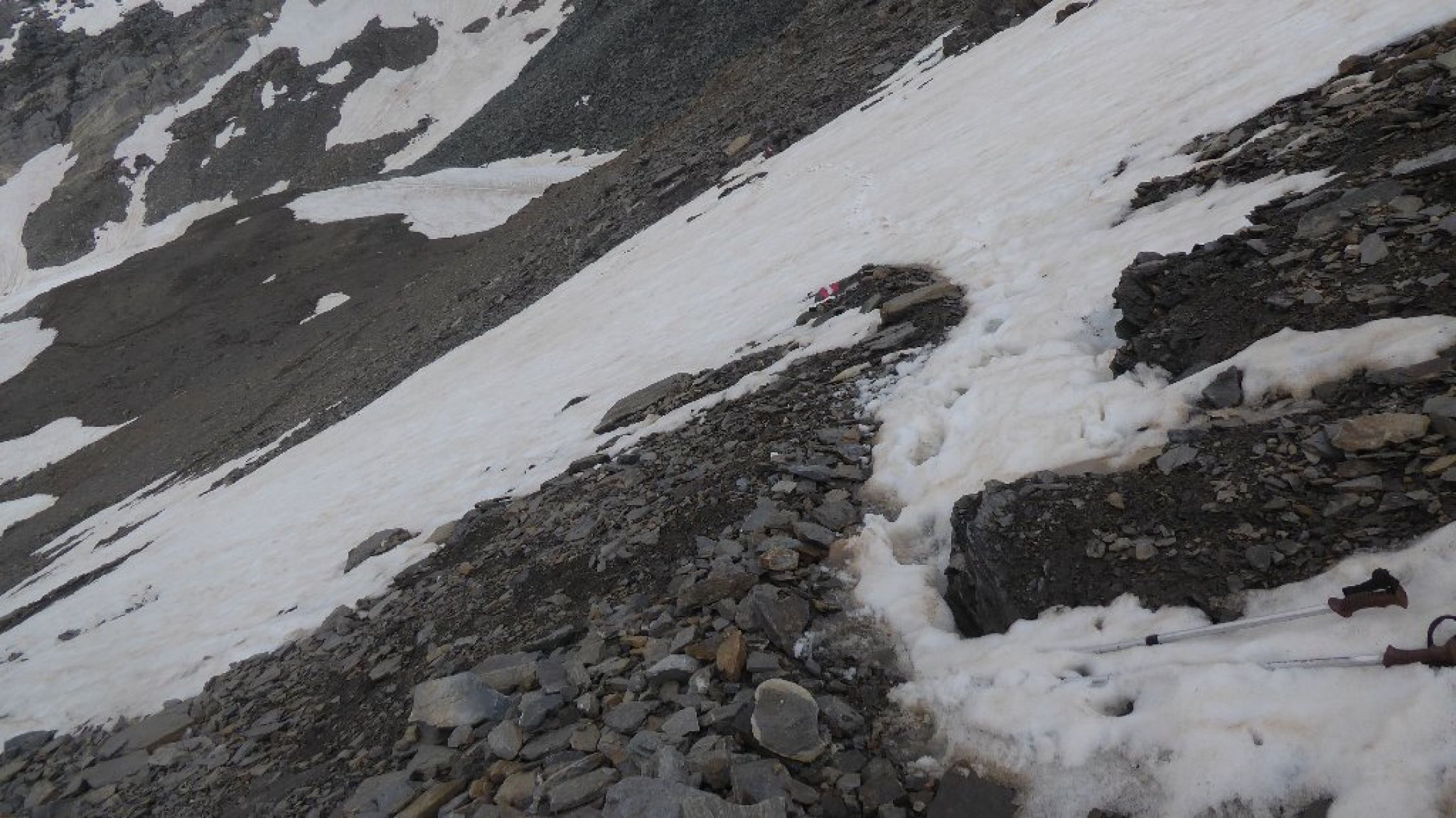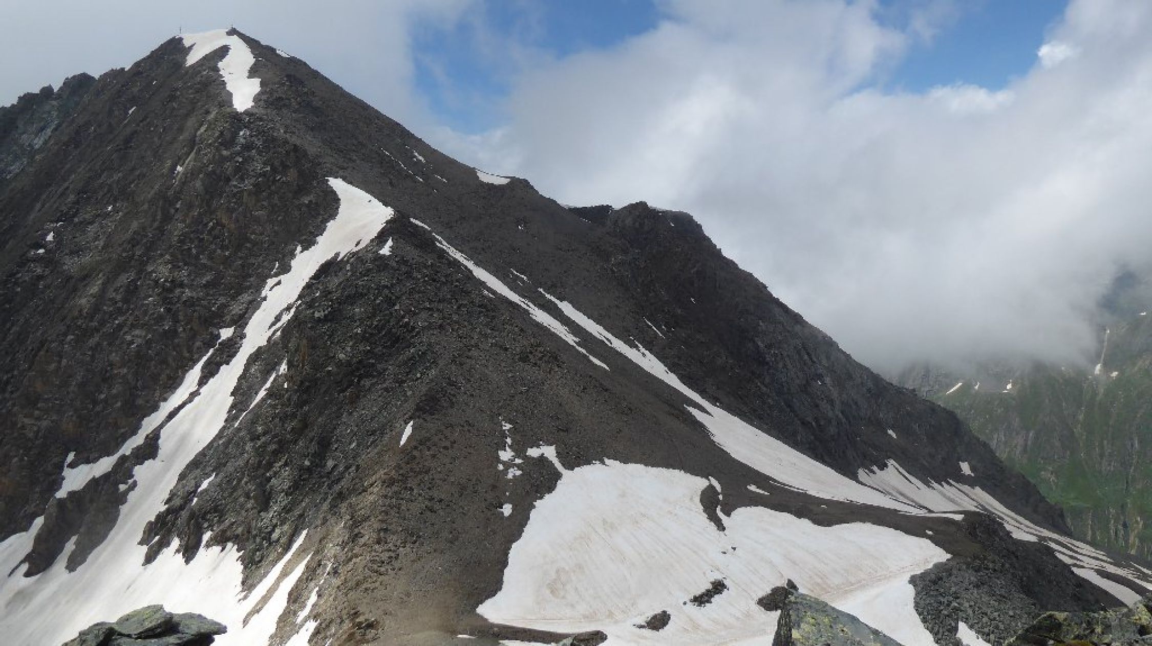 Wetter endlich mal gut ohne Schauer Stress. Allerdings Fernsicht eingeschränkt. Bis Abweig Kreuzspitze beste Bedingungen, ab dort dann Richtung Tuplscharte schon Größere Schneefelder zu begehen alles tragend. Die beiden Gipfelanstiege quasi aper. Im Abstieg ab Schernescharte waren dann doch einige Meter im steilen Gelände zu queren. Hatte Eisen dabei und hier auch eingesetzt. Mit Vorsicht vielleicht auch so gegangen.