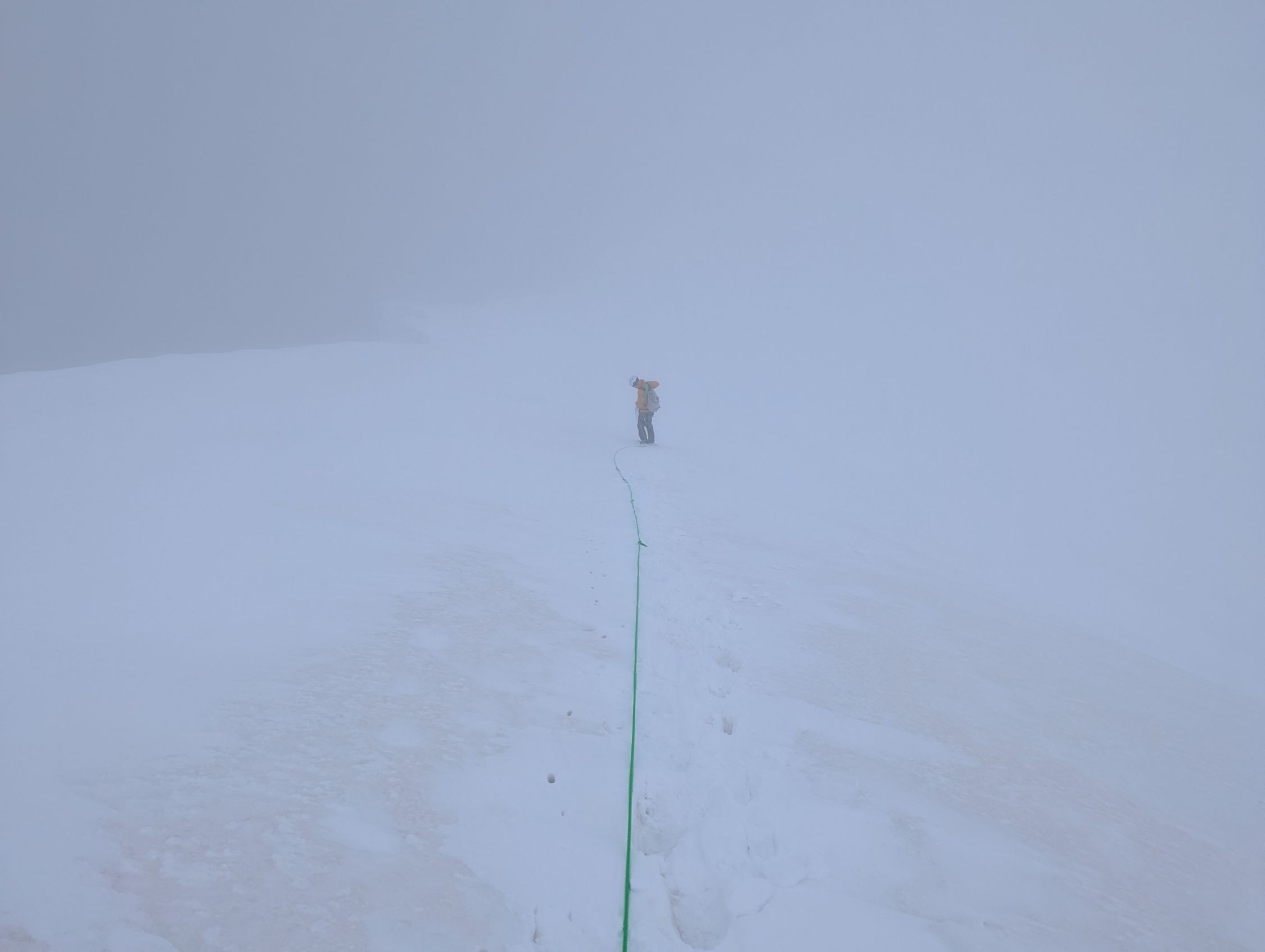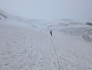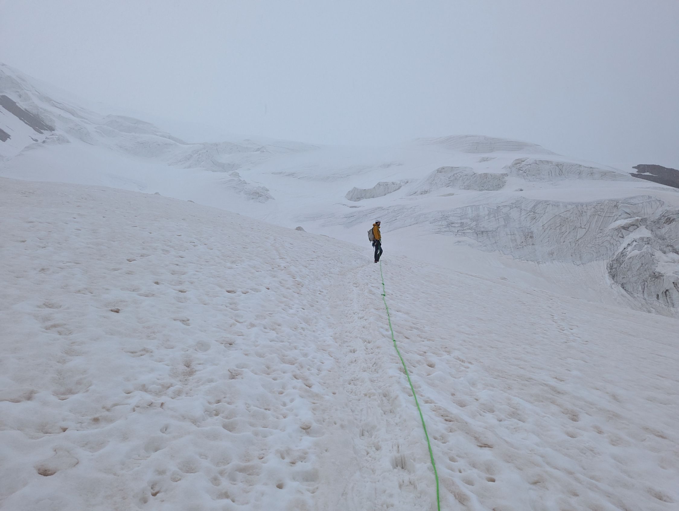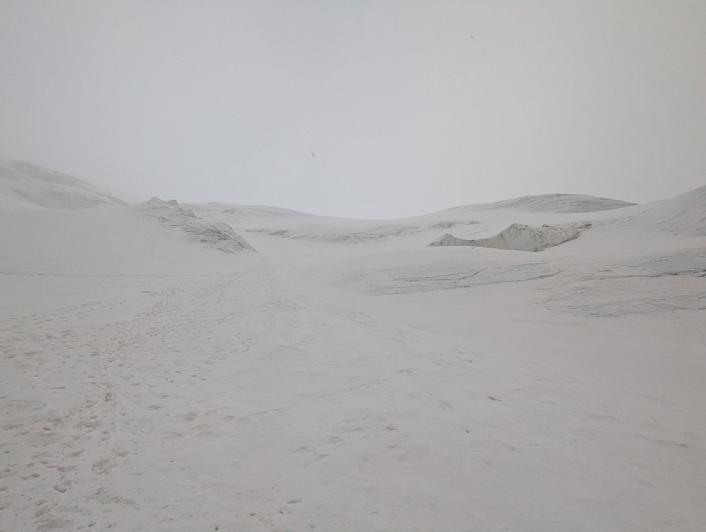 Regen harter Schnee am Gletscher, oben dann Schneefall und harter Schnee. Mussten durch den Schneefall eine neue Spur legen.