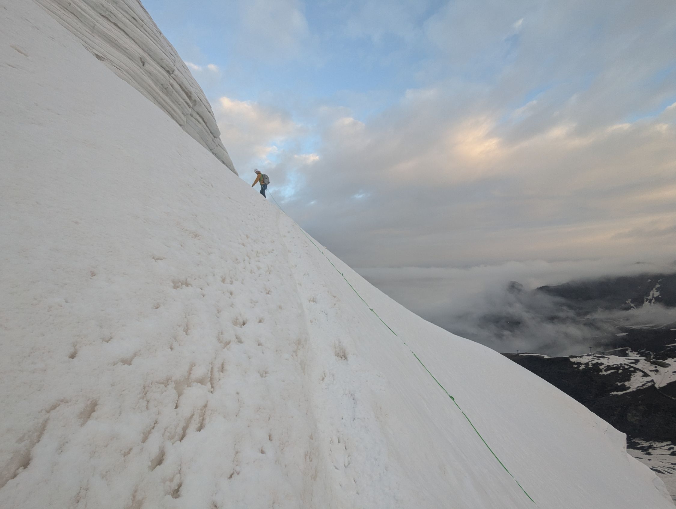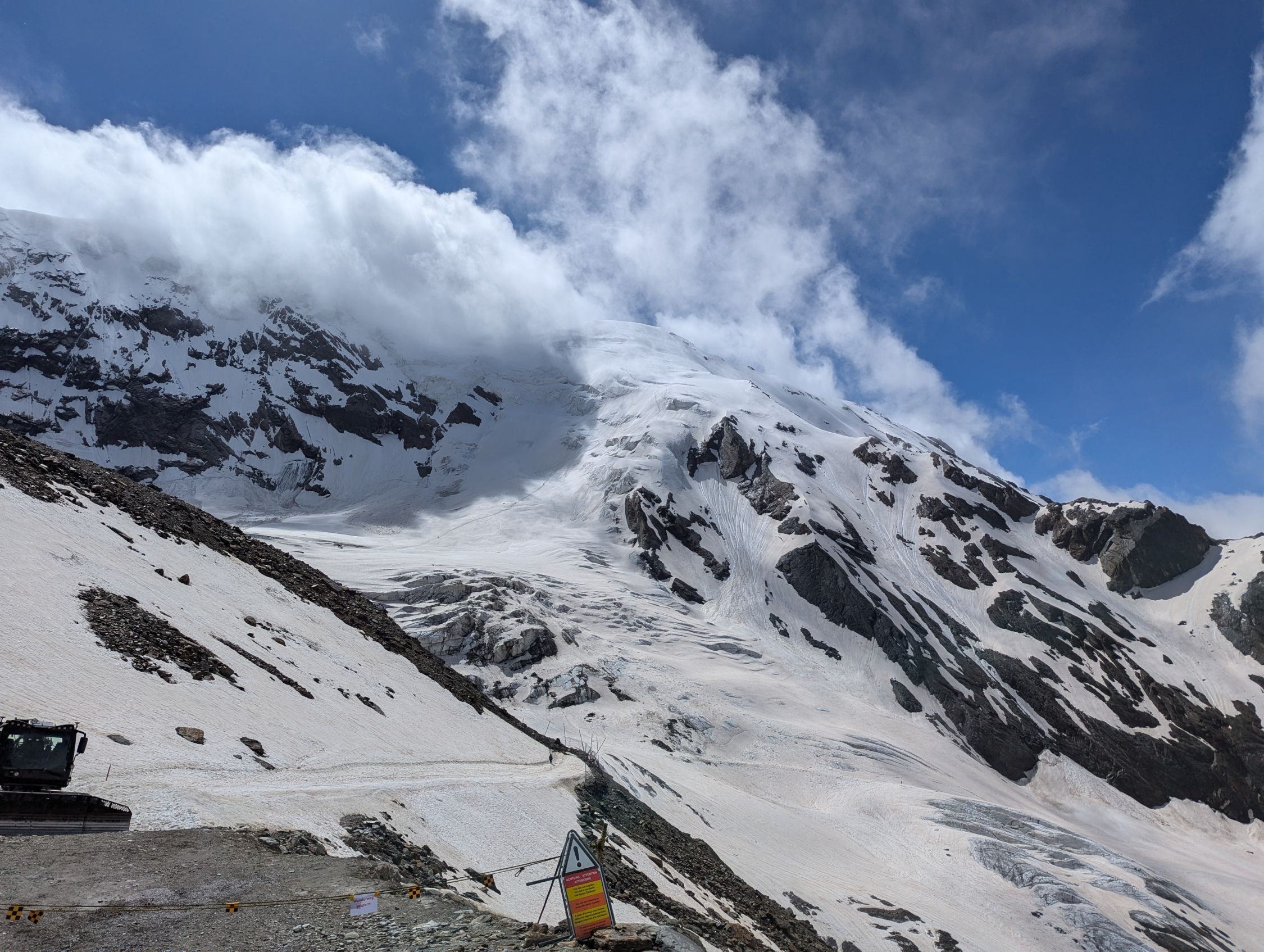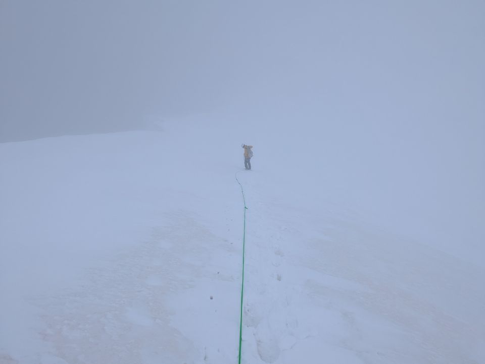 Regen harter Schnee am Gletscher, oben dann Schneefall und harter Schnee. Mussten durch den Schneefall eine neue Spur legen.