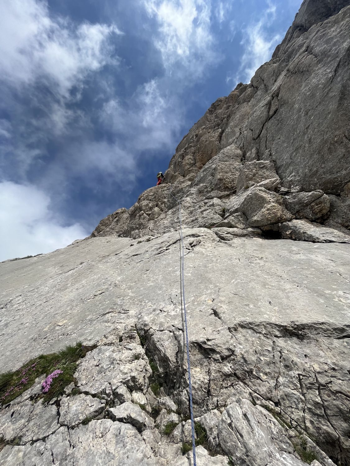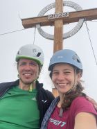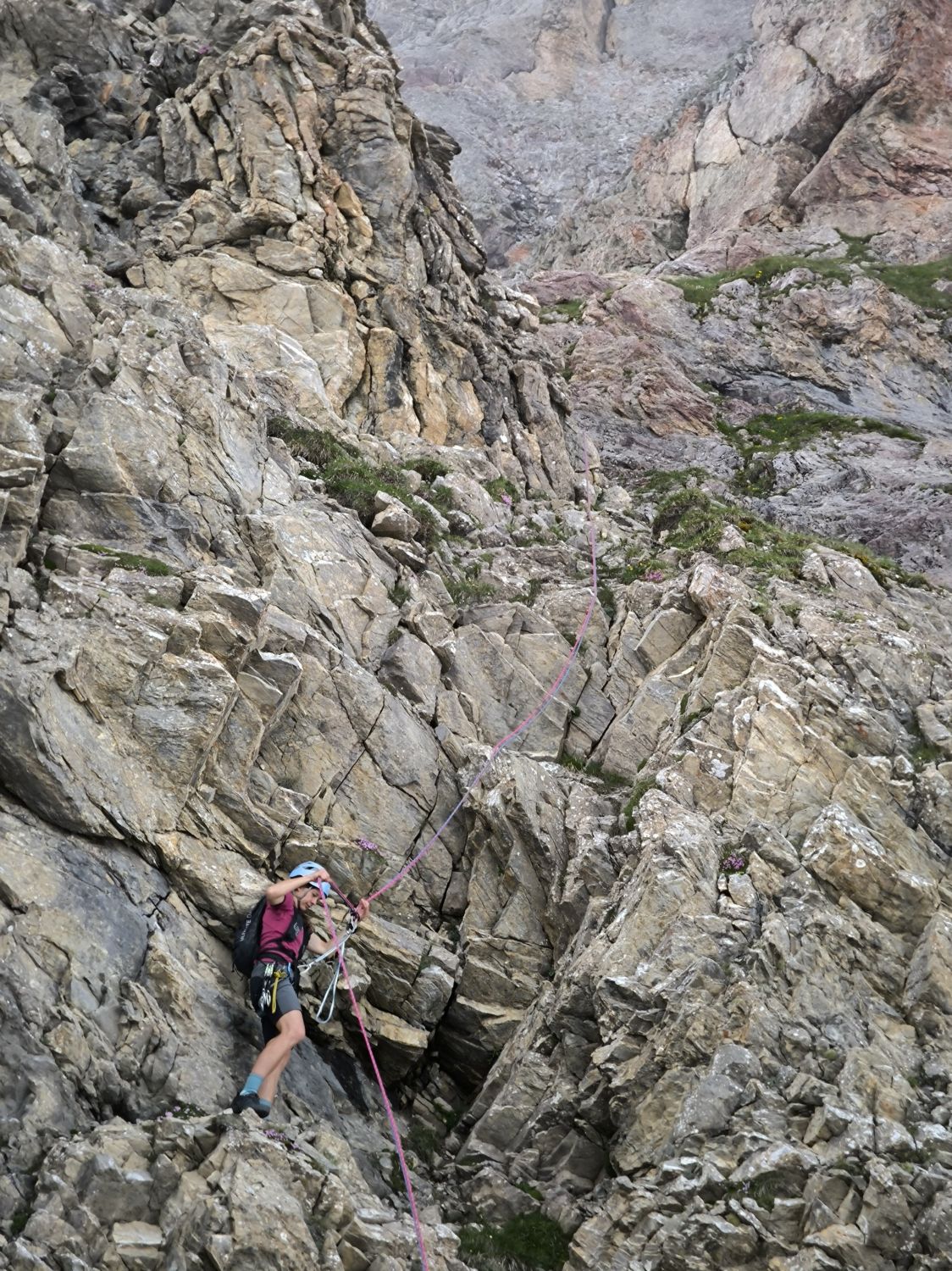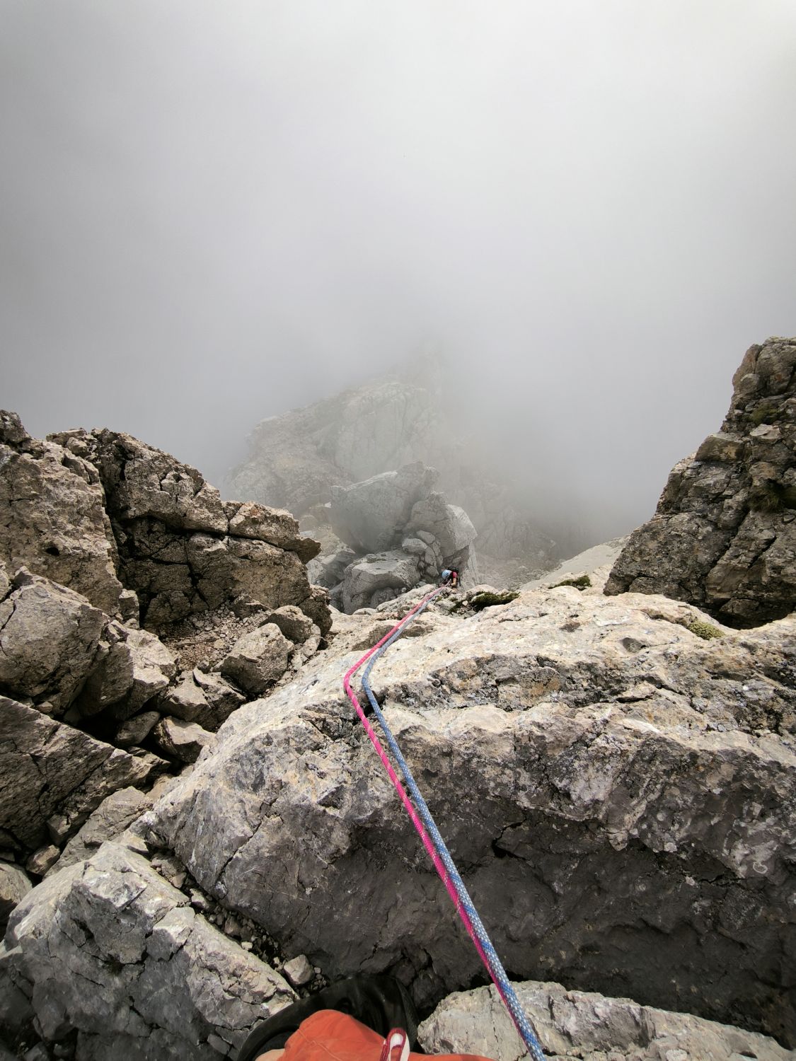 Ideale xxxx, hike and climb Tour wer gerne polysportiv unterwegs ist. xxxxxxxxx Ab Heinrich Hueter Hütte auf Barfußschuhe gewechselt. Da die Route komplett schneefrei war und vor allem trocken war das ideale Schuhwerk. Ab Zimbajoch fing dann die kurzweilige Kletterei an. Bei einer Seillänge im 3. Grad gab es keine Bohrhaken. Mobile Sicherungen hatten wir keine dabei. Ging auch so sehr gut. Schöne Tour aber ohne jegliche Aussicht. Wir waren die einzigen auf dem Gipfel.