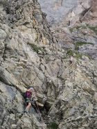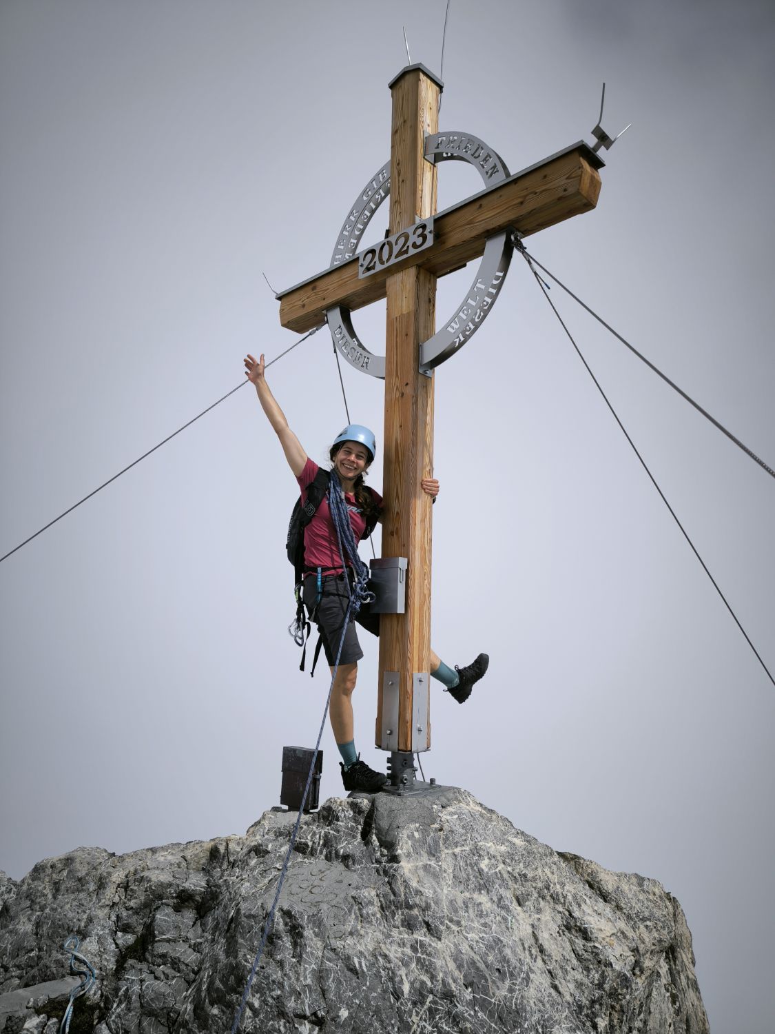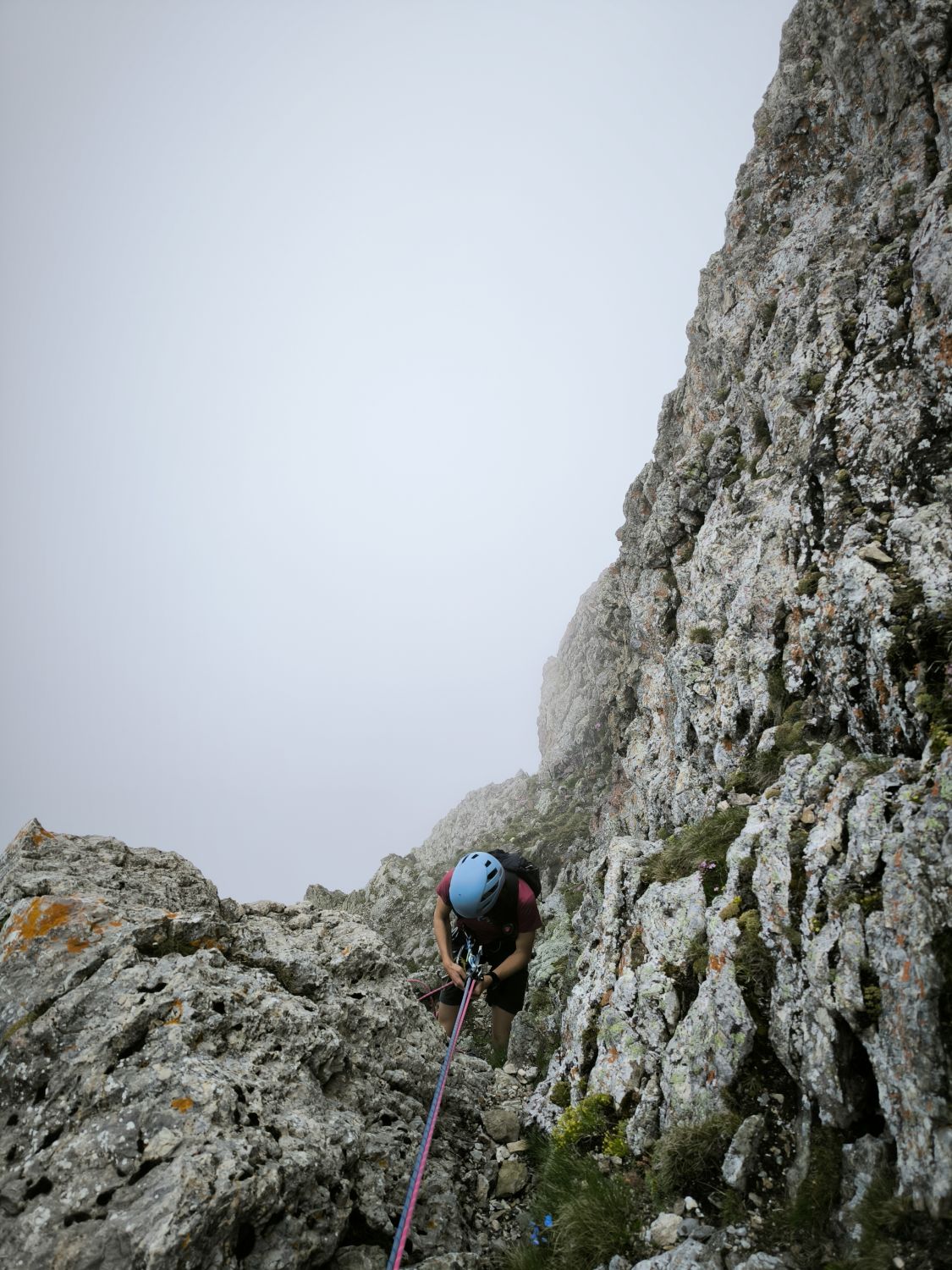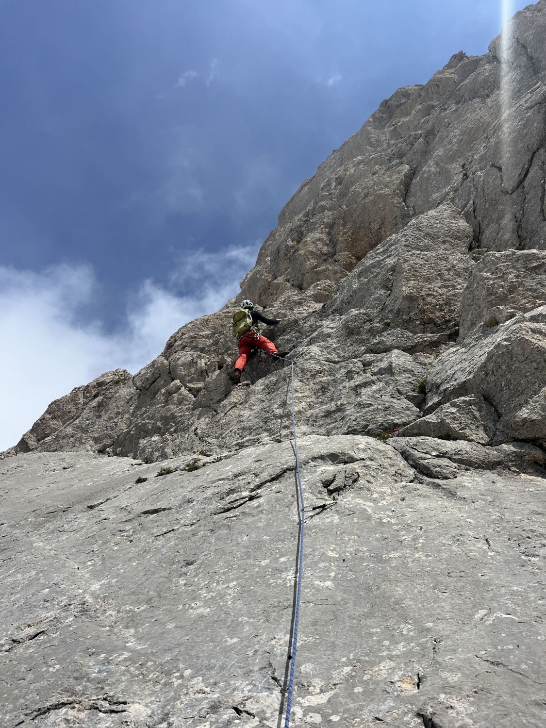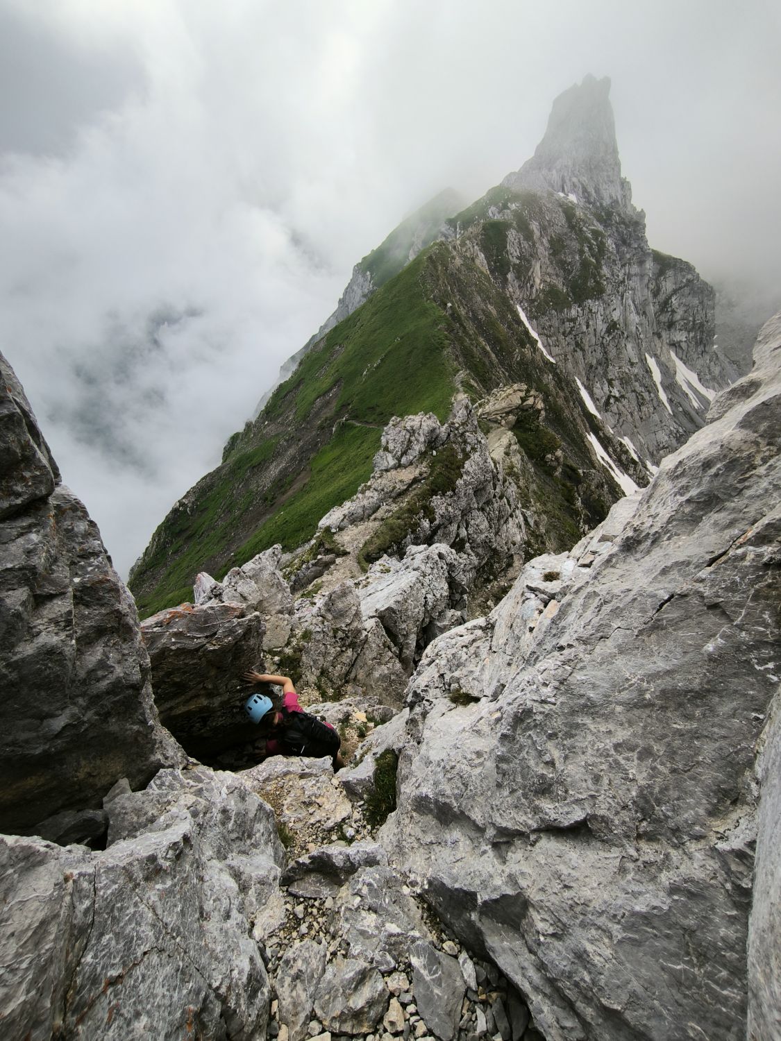 Ideale xxxx, hike and climb Tour wer gerne polysportiv unterwegs ist. xxxxxxxxx Ab Heinrich Hueter Hütte auf Barfußschuhe gewechselt. Da die Route komplett schneefrei war und vor allem trocken war das ideale Schuhwerk. Ab Zimbajoch fing dann die kurzweilige Kletterei an. Bei einer Seillänge im 3. Grad gab es keine Bohrhaken. Mobile Sicherungen hatten wir keine dabei. Ging auch so sehr gut. Schöne Tour aber ohne jegliche Aussicht. Wir waren die einzigen auf dem Gipfel.