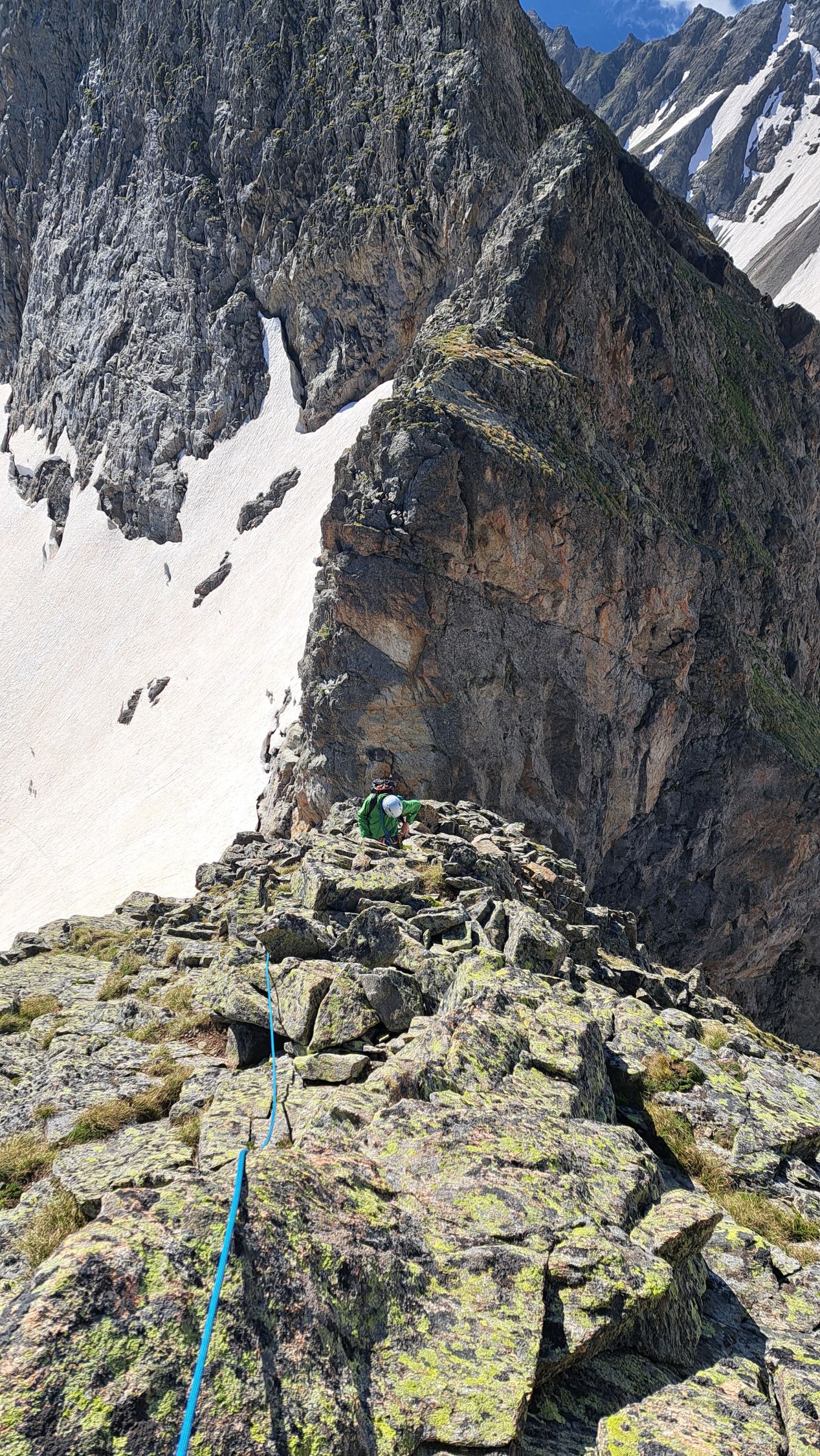 Schnee dort, wo man gerne Schnee hat. Im Aufstieg zum Steinchälefürggli liegt noch etwas Schnee, mit Steigeisen sind wir da zügig vorwärts gekommen. Die Grate sind aper und in bester Verfassung - alpine Genusskletterei!