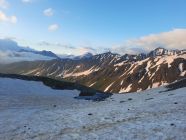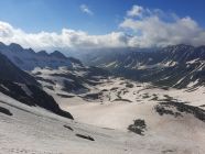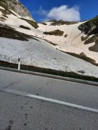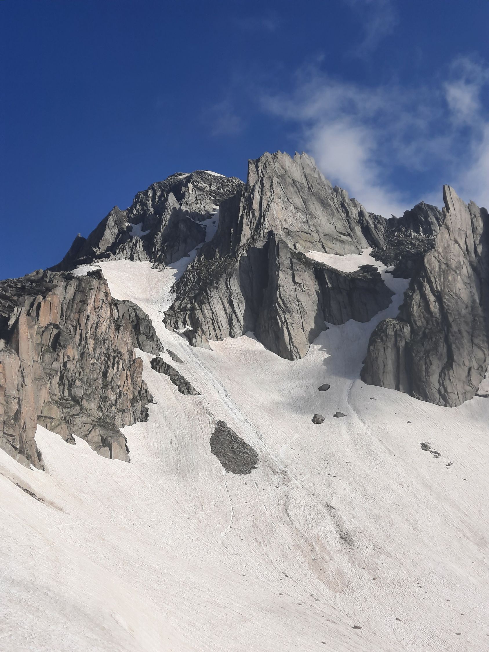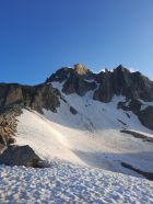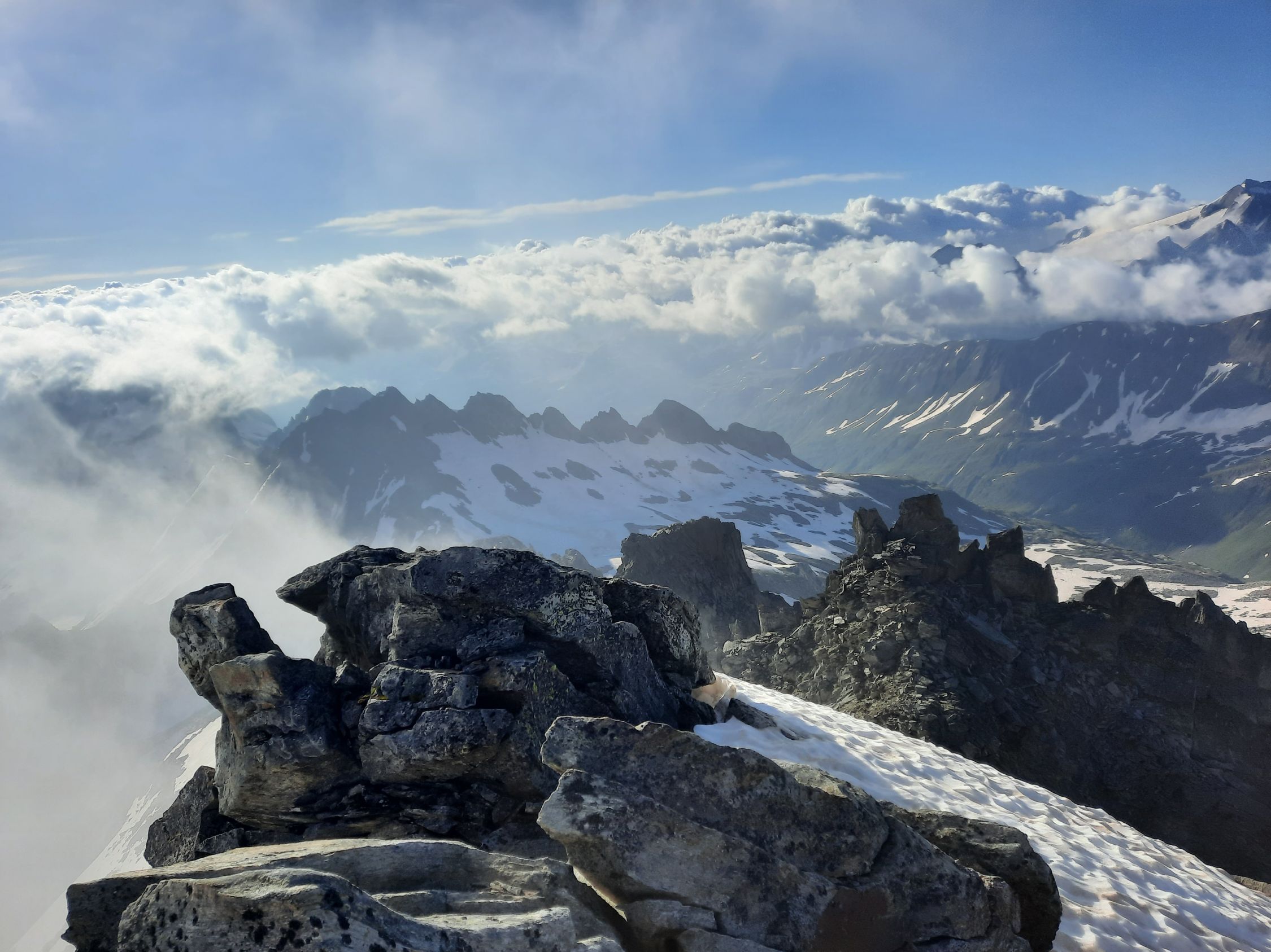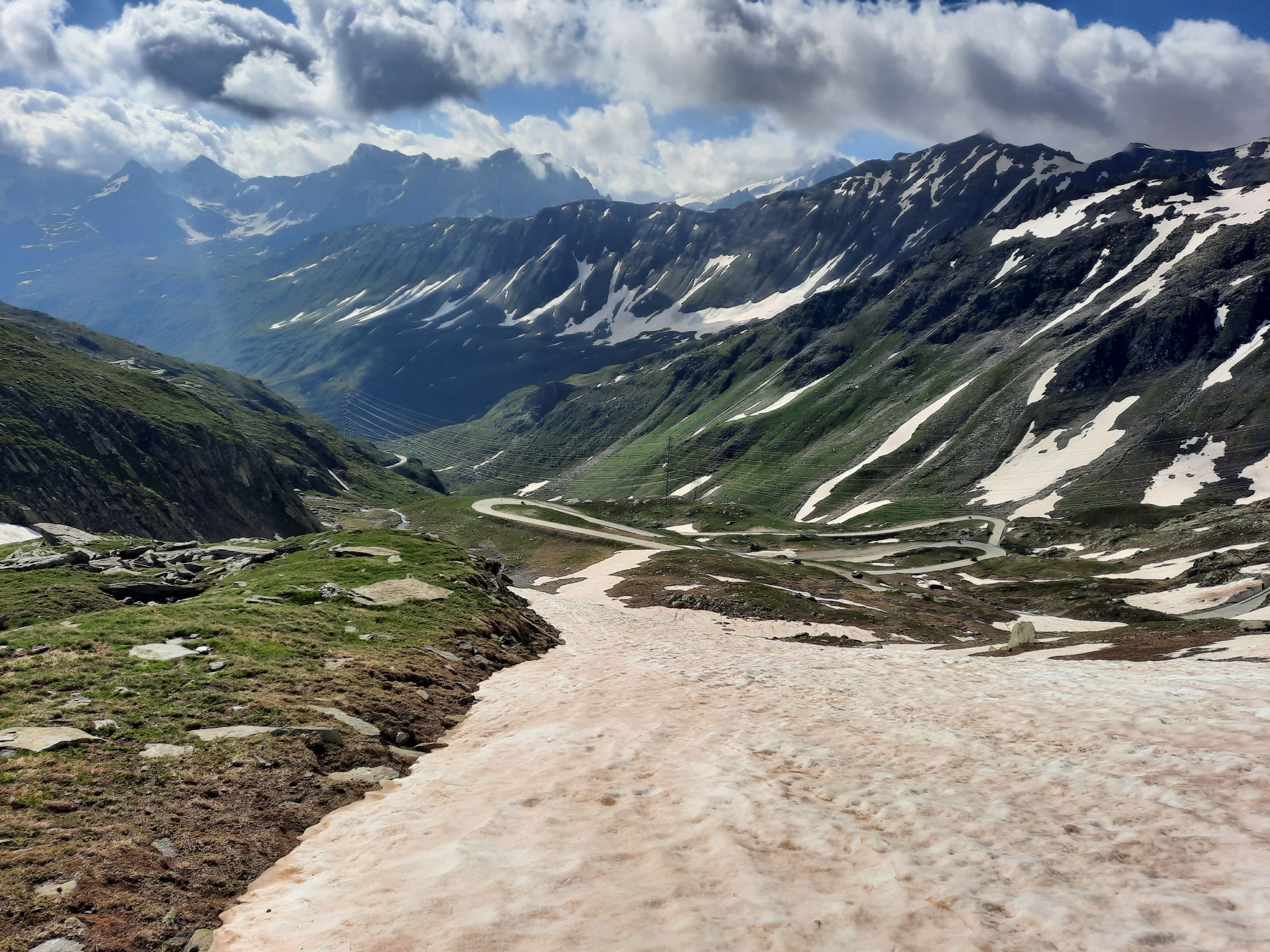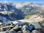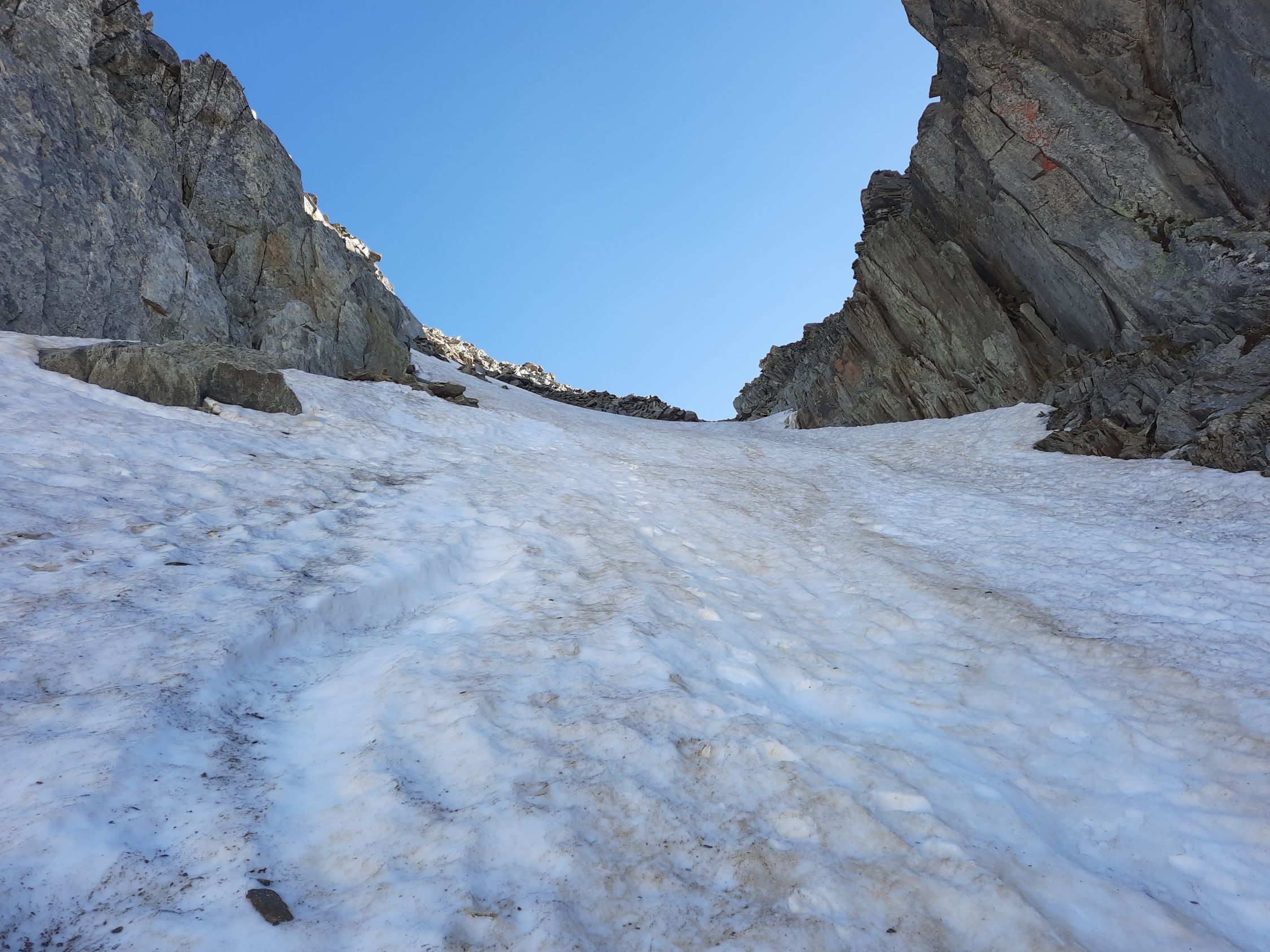Es fühlt sich an wie Ferien am Mittelmeer. Die westliche Welt schreibt den 14. Juli 2024 und es hat Top Wintertourenbedingungen! Zu Unzeiten um 03:30 Uhr weckt der Wecker, was sonst. Ja, jetzt wird wieder in die Hände gespuckt, auf geht`s. Die Axenstrasse, die A2, die Gotthardroute, gen Süden mal wieder. Die ausländischen PKWs und nordischen Kantone überschlagen sich. Das Tor in die Ferien alias Nordportal Gotthardtunnel hat Erbarmen und lotst innerhalb von wenigen Minuten Wartezeit durch den Granit. Bei Airolo sind meine Italienferien bereits Geschichte, und es geht ohne jeglichen Verkehr rechts ins Val Bedretto entlang dem Ticino. Auf dem kiesigen Parkplatz kurz vor dem Nufenenpass endet die Fahrt. Und noch immer keine Menschenseele, weit und breit. Jedenfalls startet die Tour mit einem "asphalt to snow", wie es im Fachjargon heisst, kurz vor 6:00 Uhr zum Pizzo Nero im Schnee neben der Strasse. Ja, genau, Nero war ursprünglich das Ziel. Bald merke ich jedoch, meine Beine führen mich instinktiv direttissima zum Pizzo Gallina mit dem spannenden Couloir. Der Altschnee bzw. die Oberfläche ist von den Witterungseinflüssen gezeichnet. Die Nacht war teilweise klar, und es gab eine akzeptable Abstrahlung. Die obersten Zentimeter gaben nach, etwas sulzig wenn man so will, darunter harter, tragender Schnee schon ab Passhöhe. Die Route zum Pizzo Nero, hat durch die schneelosen Flächen, demzufolge ein auf und ab um die optimale Route zu finden, sowie der apere schwarze Grat, mein Interesse verloren. Etwa 200 Höhenmeter unter dem Gipfel des P. Gallina wird das Splitboarddepot eingerichtet und baue um, um mit Steigeisen und Pickel in das südwestlich ausgerichtete 45° Couloir bei Temperaturen von geschätzten 5°C einzutauchen. Nur im oberen Teil des Couloirs gibt es eine Stelle von etwa 20 Metern ohne Schnee. Auf dem Südostgrat zum Gipfel balancieret es sich problemlos auf den Steinblöcken und voila, um 8:00 Uhr sopra, viva la vacanze. Rundherum sind die Berge immer mal wieder in Wolken gehüllt. Nach kurzer Rast gehts ins noch immer schattige Couloir. Unten auf der Fläche, mit Blick zum Gipfel, gibt es ein Zmorgä. Gleichzeitig grosses Kino beim Zuschauen, wie sich ebenfalls ein Sologänger hochkämpft. Und im östlichen Couloir mit geschätzten 50° klettern drei Italienischsprechende auf den Sattel. Sonst keine Wintersportler im Gebiet.