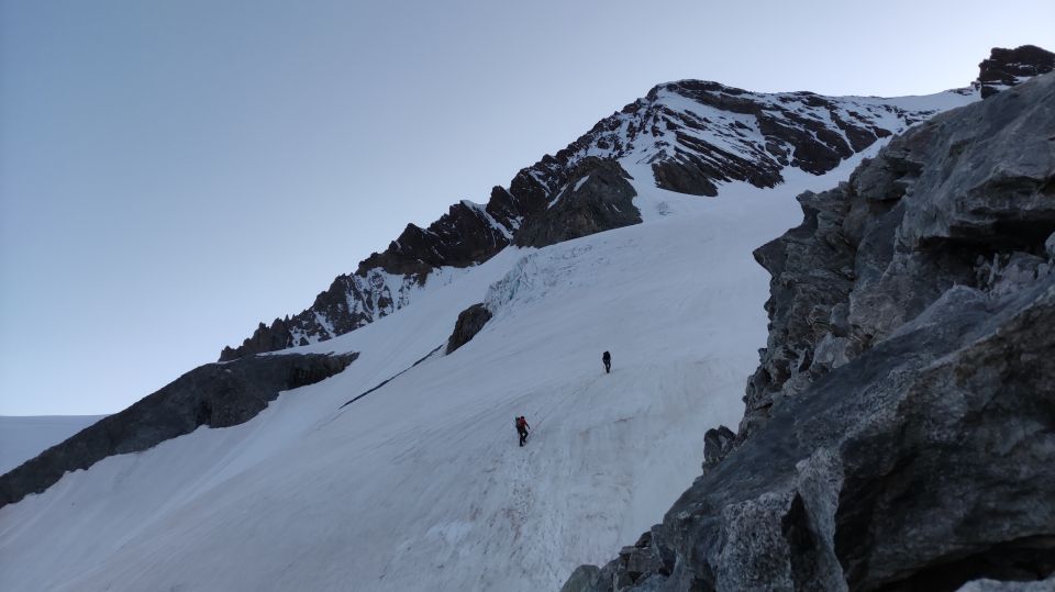From 3800 meters is still presents a lot of snow, from this point onwards you climb through snowy "couloirs" and can use the poles for protection. After 11 a.m. the snow became very soft.
