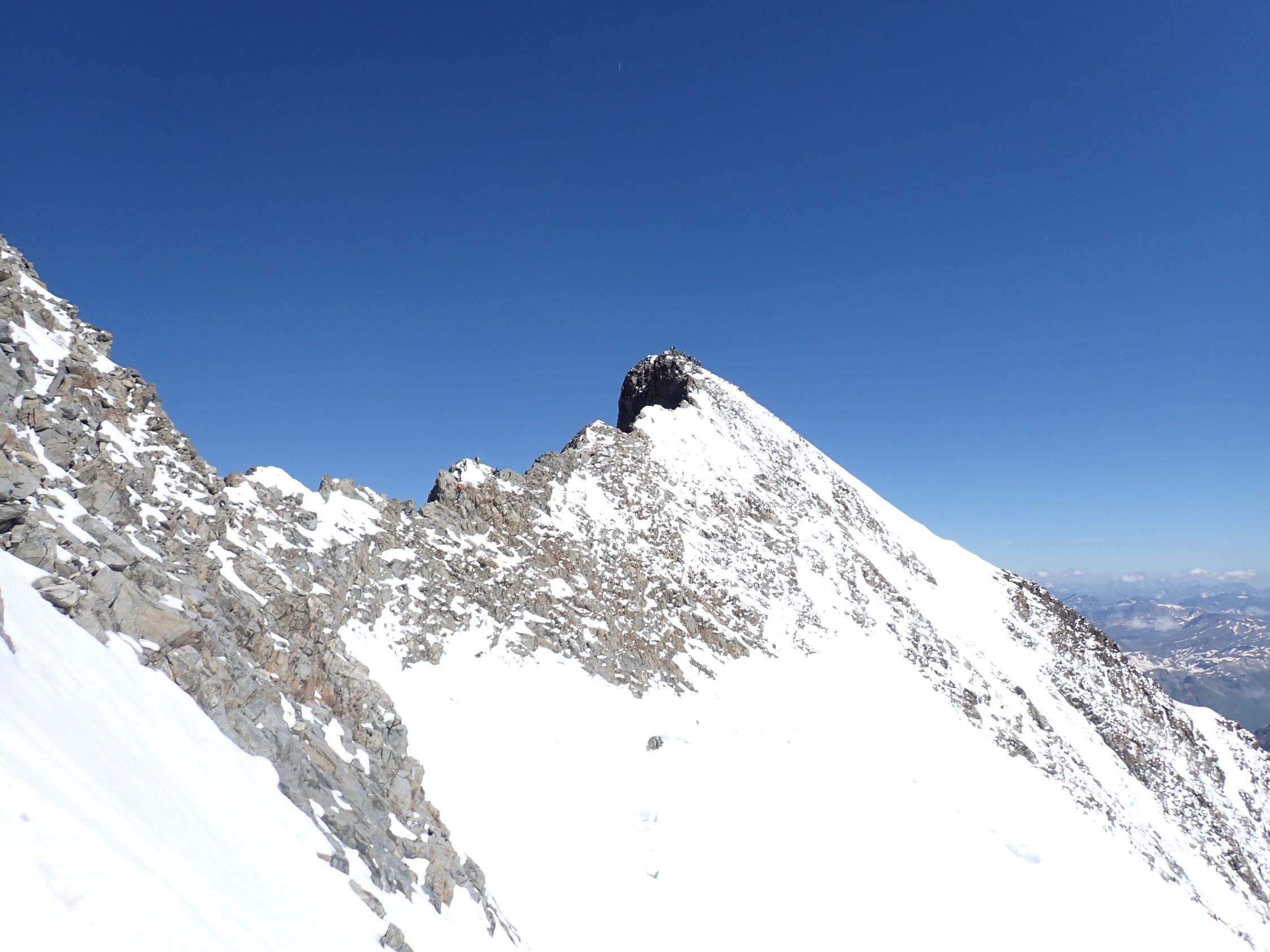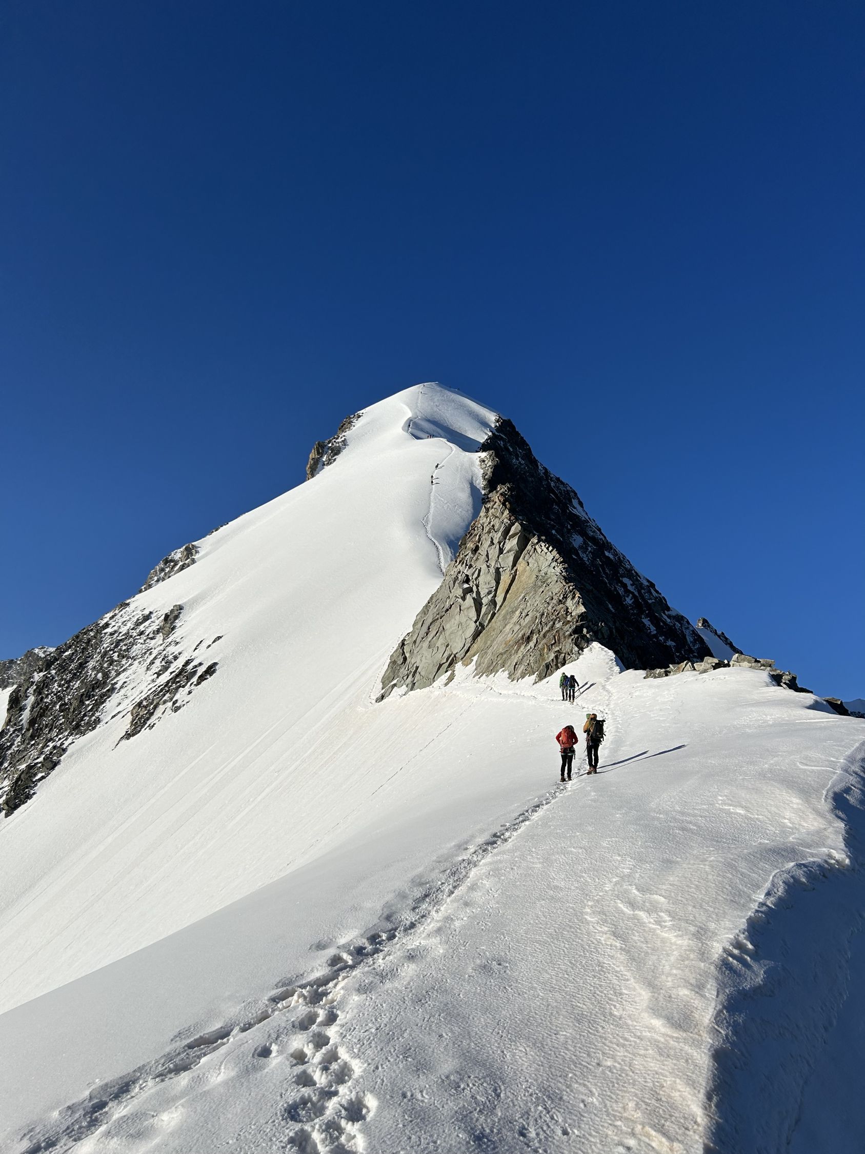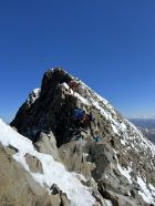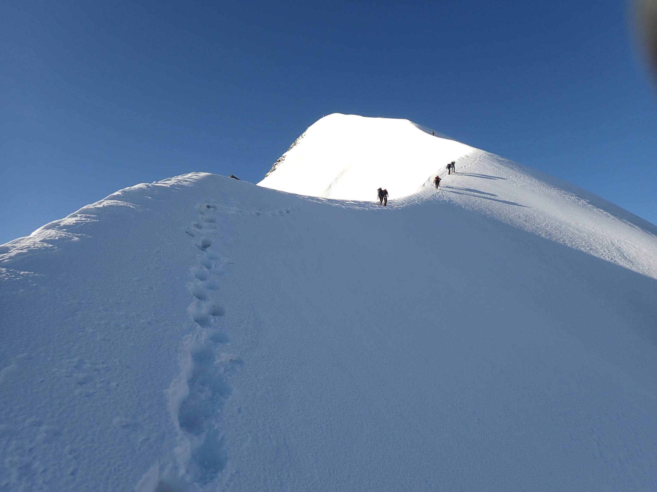 Der Grat ist schneebedeckt mit einer guten Spur. Das Vorankommen gestaltet sich einfach. Kein Stufenschlagen oder Sichern per Eisschrauben nötig.