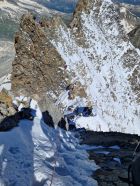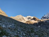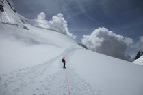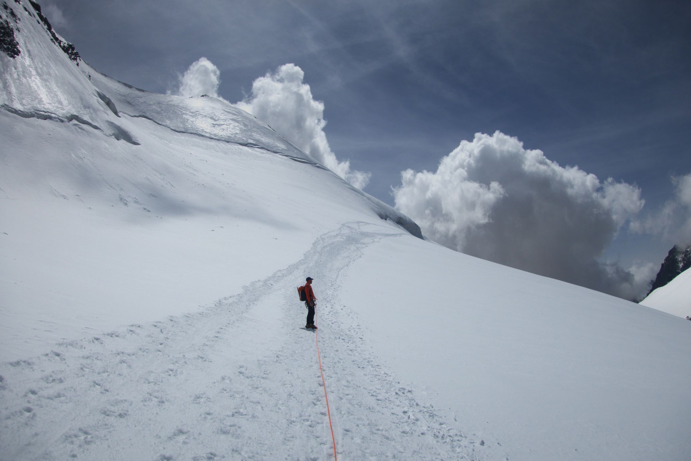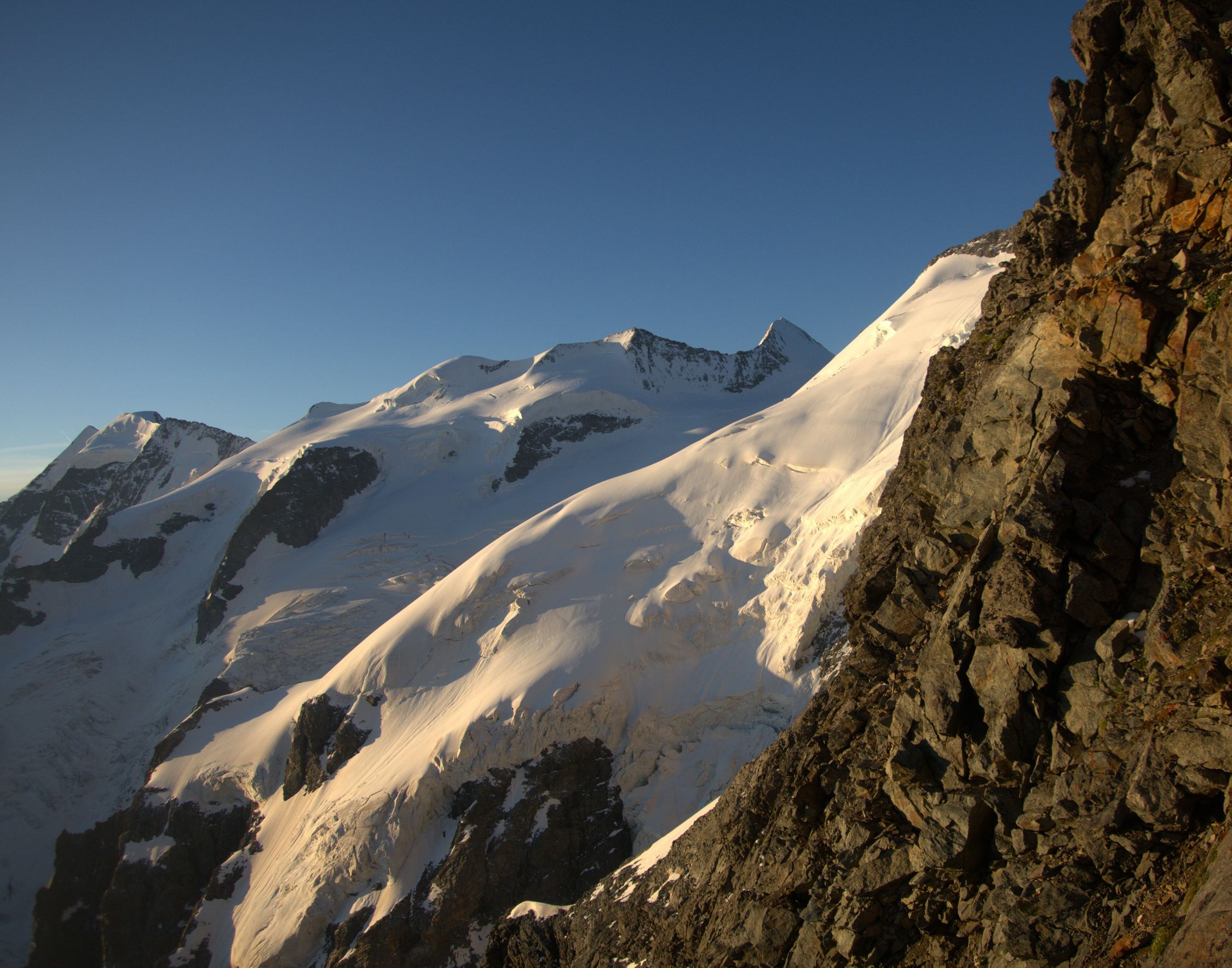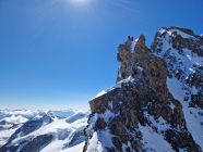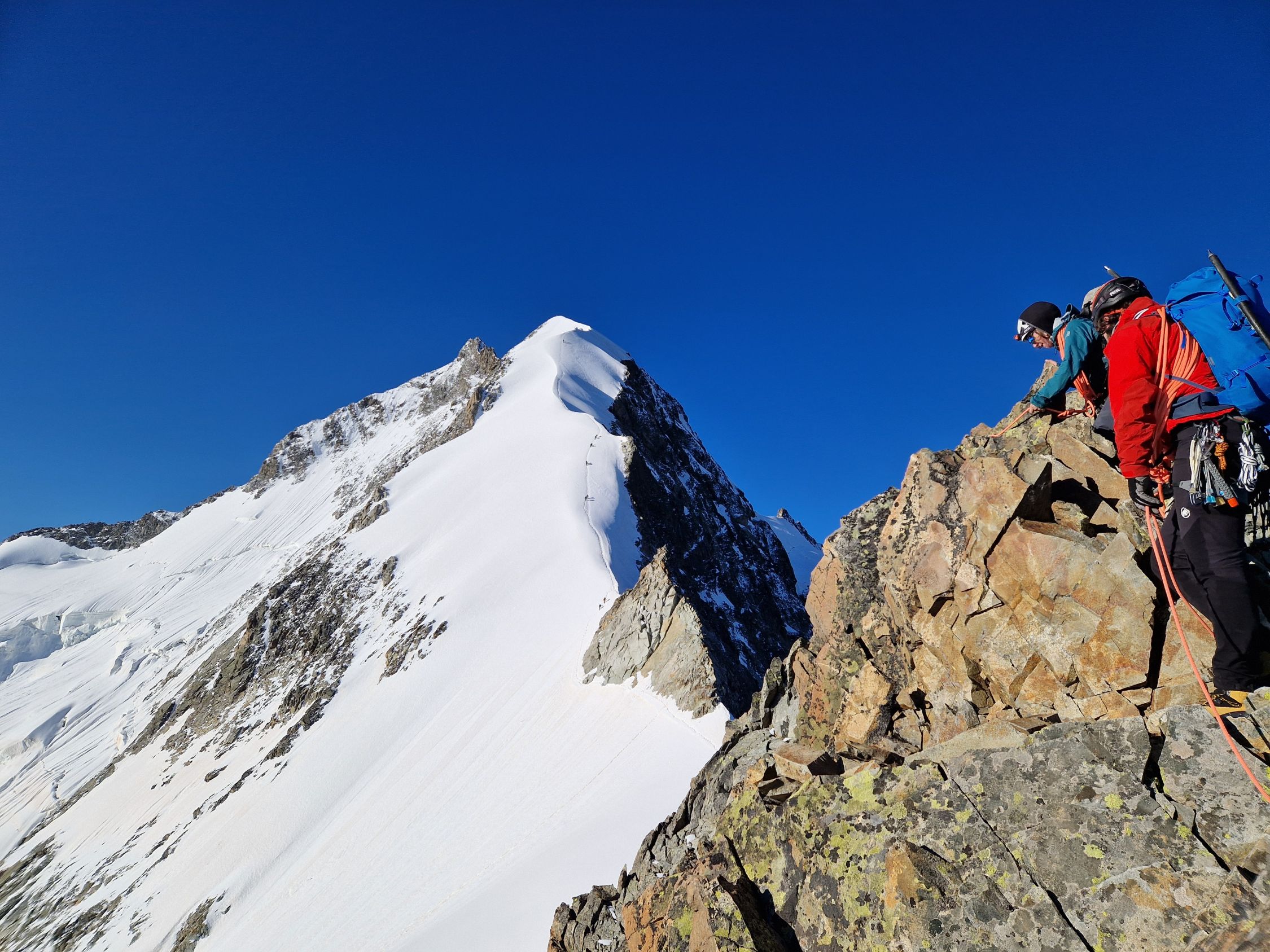 Perfekte Bedingungen: genau die richtige Menge Schnee, der hart, aber nicht eisig war, und sehr stabiles Wetter. Wir konnten auf dem Eisfeld bis zur Fuorcla Prievlusa gehen, obwohl es aufgrund der vielen Kletterer vor uns ziemlich viel Steinschlag gab. Die Haifischflosse konnte im Schnee umgangen werden. Der Biancograt hatte perfekt getretene Stufen auf griffigem Schnee, Eisschrauben waren nicht notwendig.