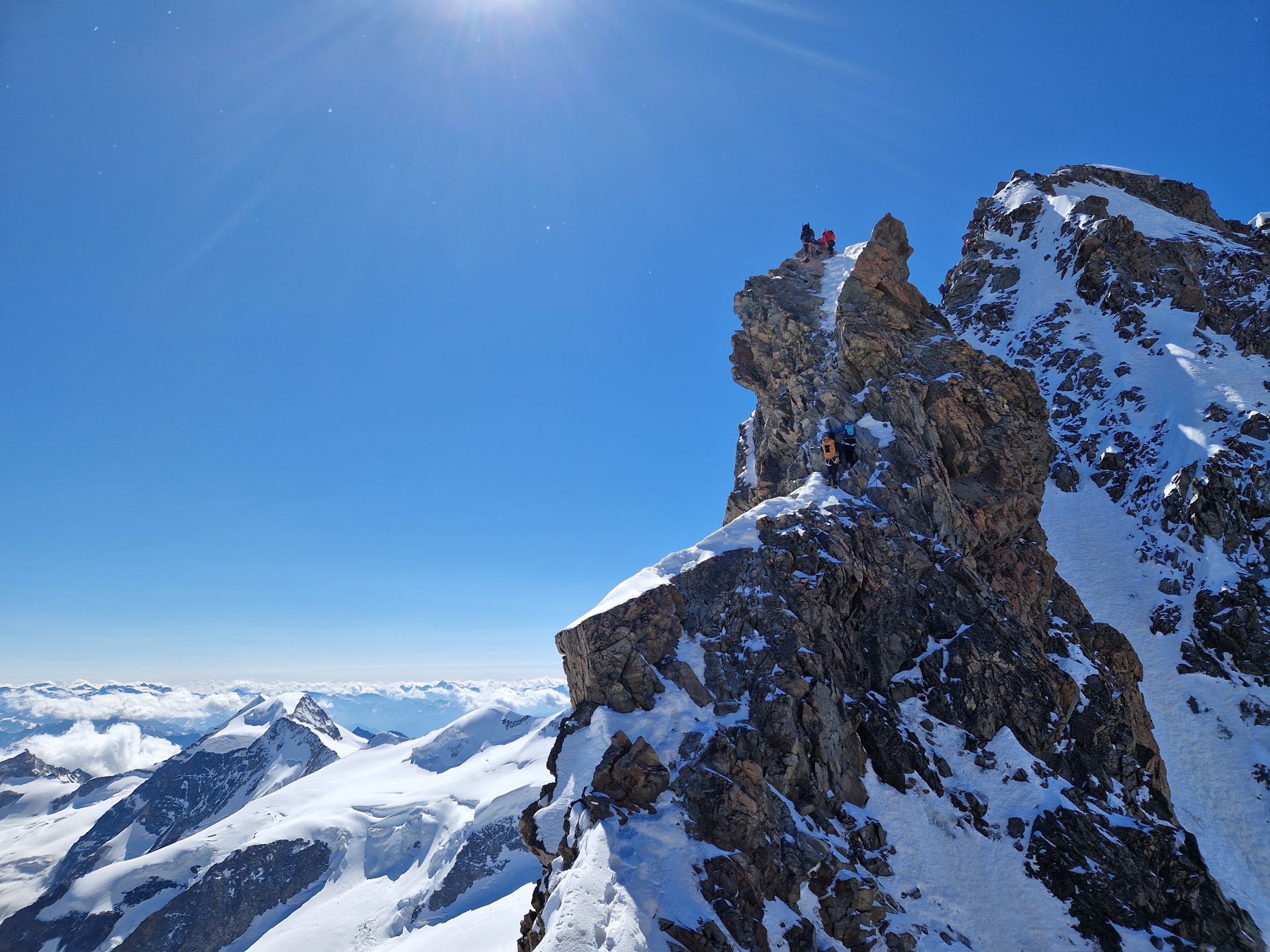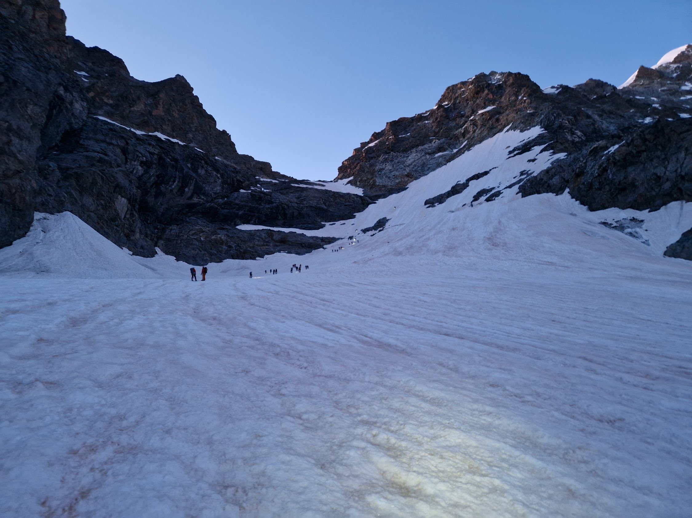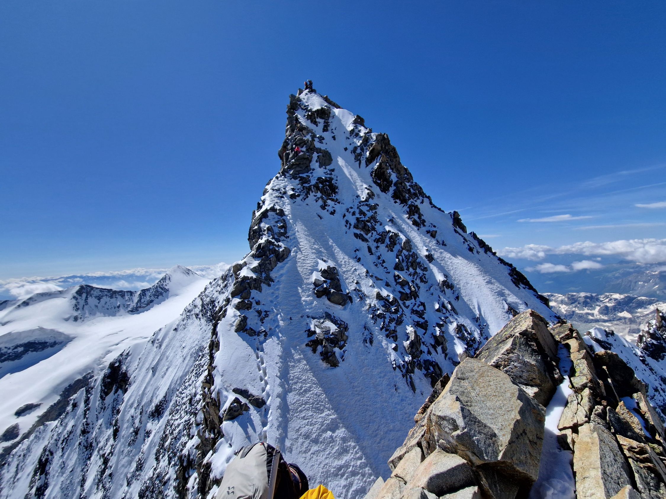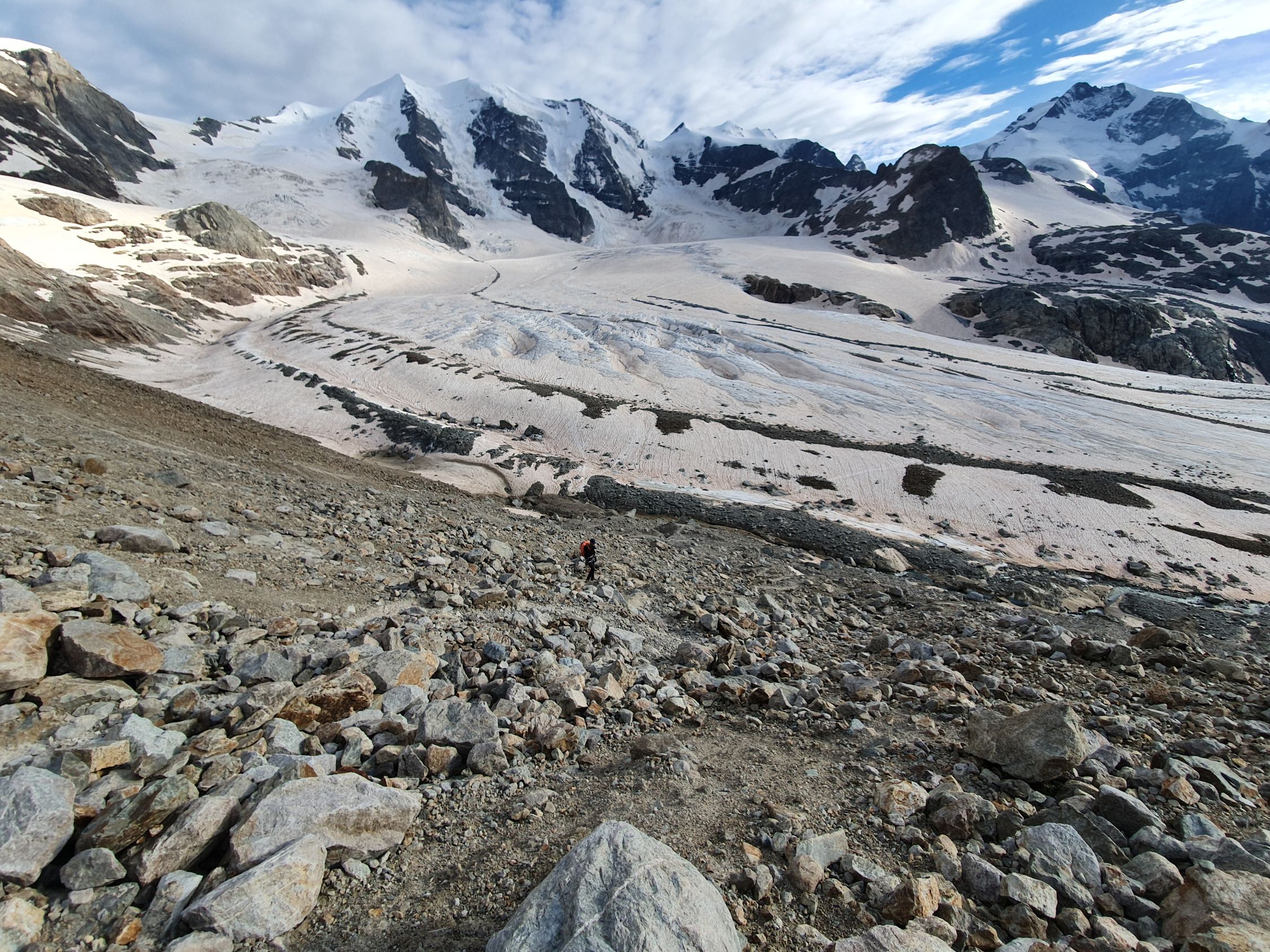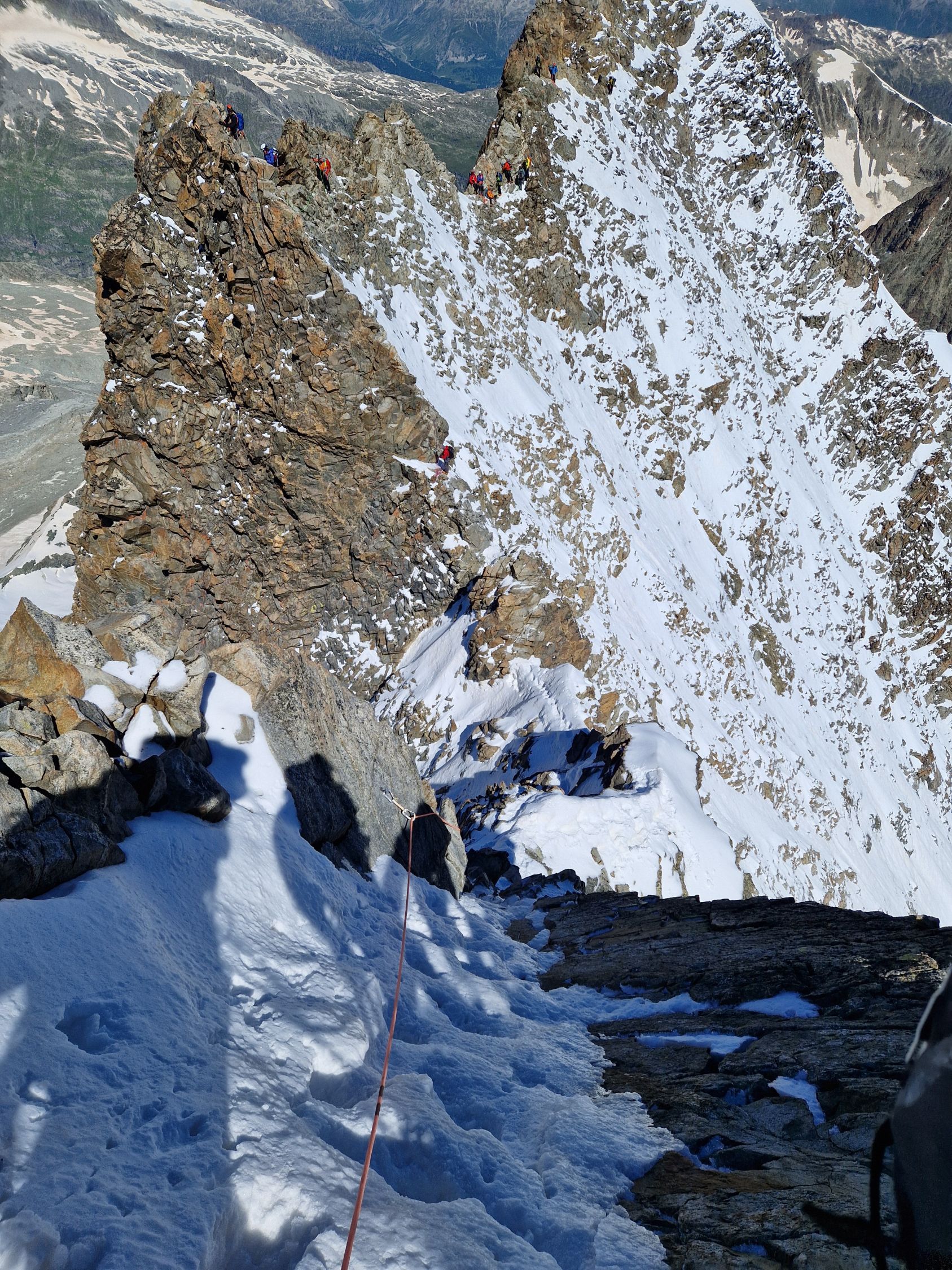 Es waren 50-70 Personen auf der Route, und unvermeidlich blieb die Hälfte von uns hinter einer sehr langsamen Gruppe stecken, was zu einer zusätzlichen Wartezeit von etwa 3 Stunden führte, was den ohnehin langen Tag noch verlängerte (wir hatten geplant, mit der Seilbahn von Diavolezza über Fortezza zu fahren, was wir verständlicherweise nicht geschafft haben und daher herunterlaufen mussten). Es war der perfekte Tag für den Biancograt und an einem Wochenende, daher war ein Stau zu erwarten :_)