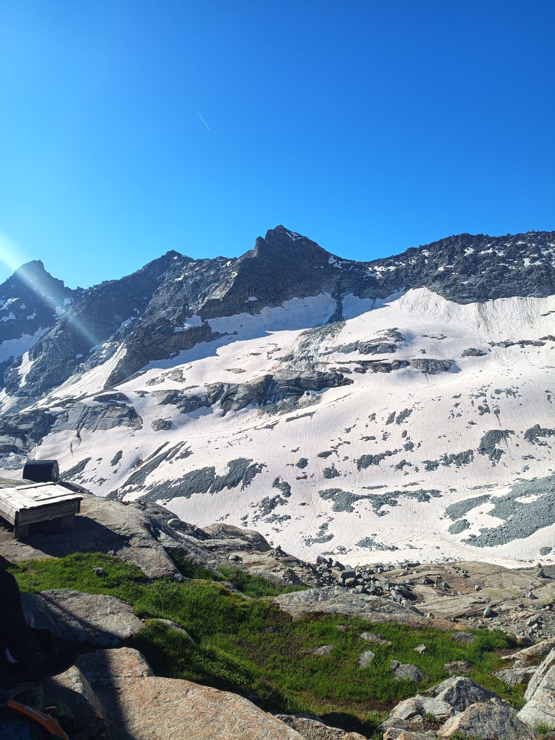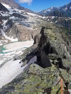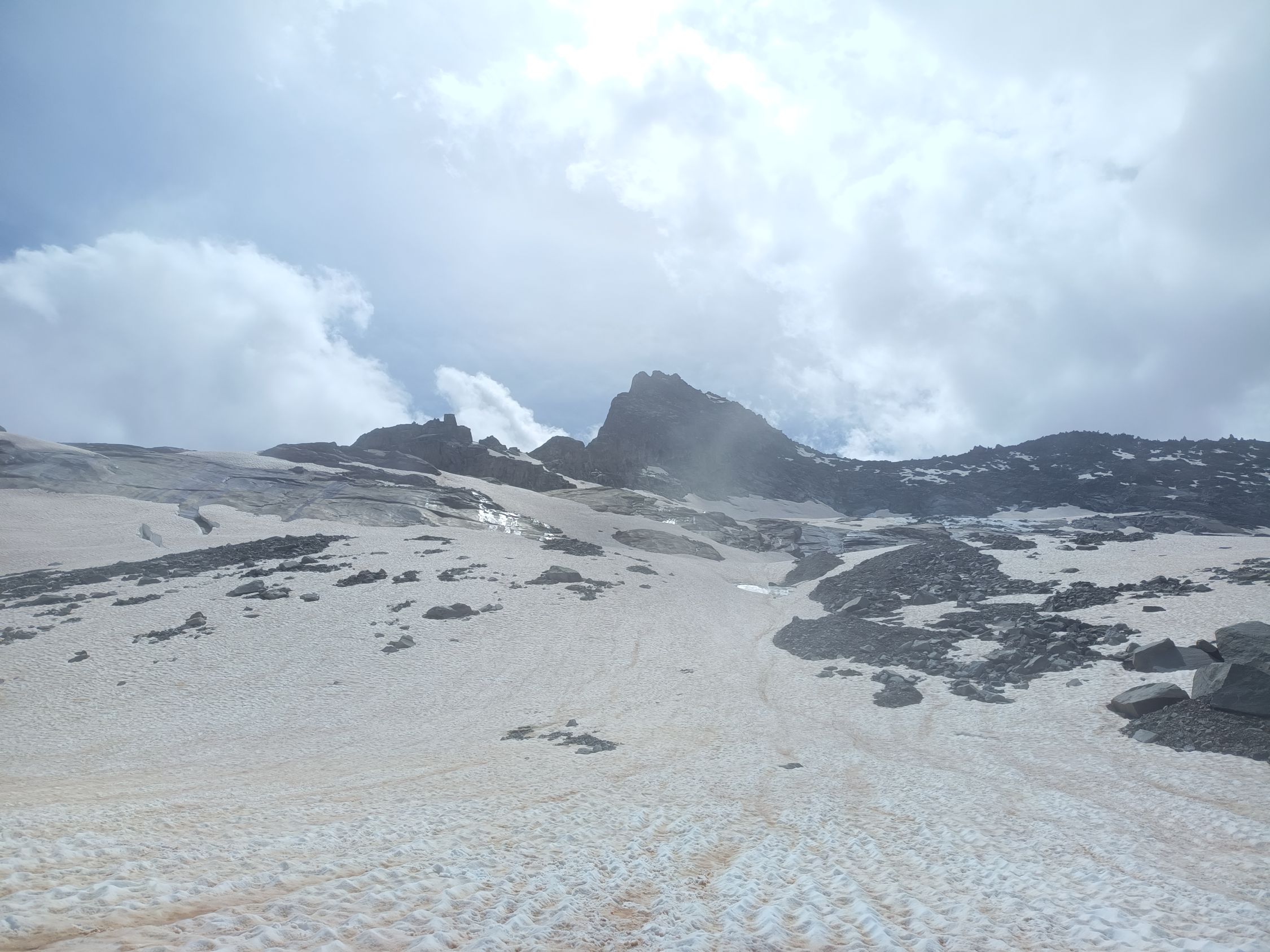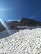 Noch viel Schnee im Zustieg, dieser Trittschnee war gut ohne Steigeisen zu gehen. Eisgerät jedoch obligatorisch da steile Schneefelder gequert werden müssen. Im Grat hat es etwas lose Steine und nicht alles ist so fest wie es aussieht. Abstieg wohl das heikelste an der Tour: Steiles Geröll muss bis fast ganz unten begangen werden und der Abseilstand (redundant mit zwei Fixpunkten und Kette) muss gesucht werden. Die Steinmännchen sind eine gute Hilfe, jedoch nicht immer eindeutig. Wenn man den Abseilstand gefunden hat ist in Falllinie ein Zwischenstand kurz oberhalb der Randkluft.