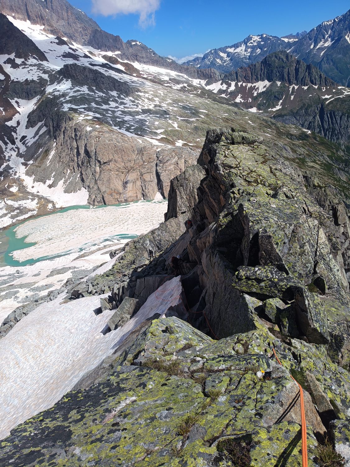 Wir haben diesen Zwischenstand nicht genutzt sondern 60m bis aufs Schneefeld abgeseilt.