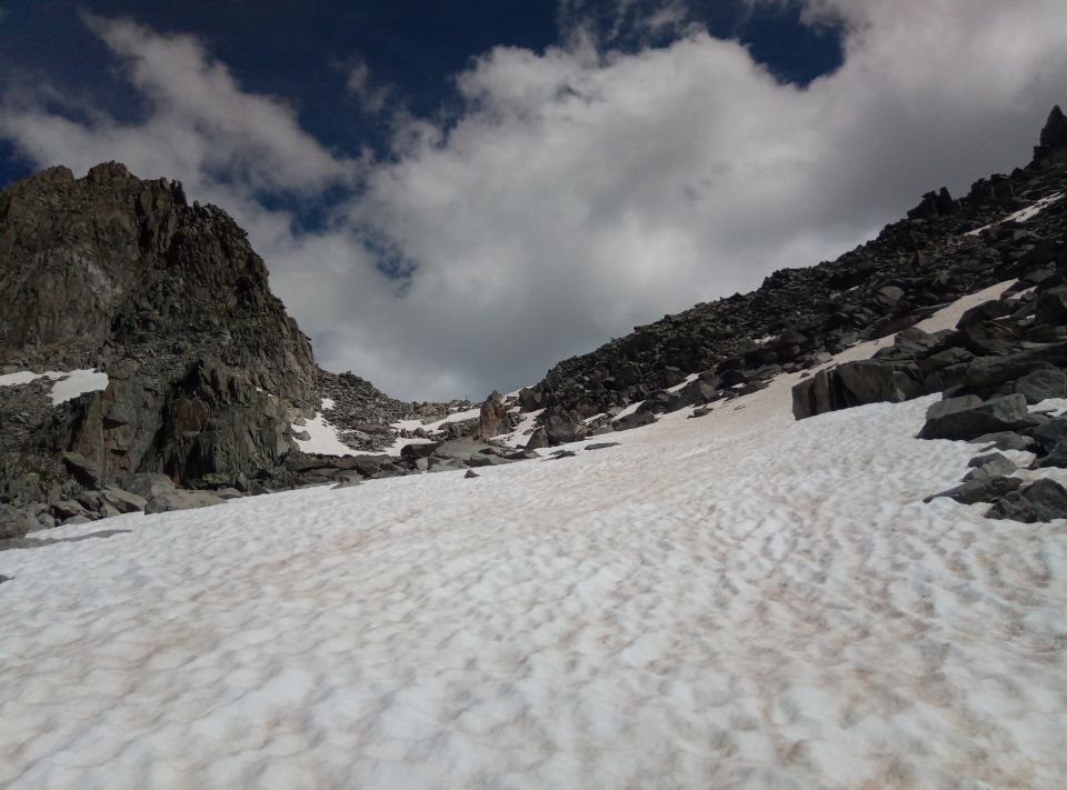 Einige Schneefelder helfen beim Auf- und Abstieg. Grat völlig Schnee frei.