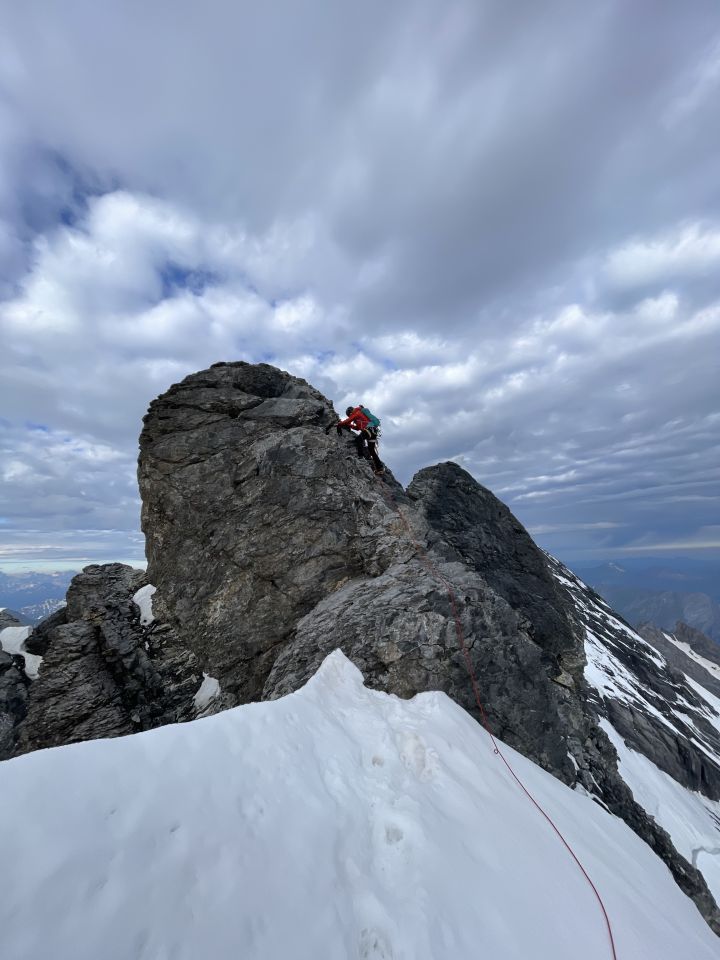 Die Flanke zum Morgenhorn hat wohl durch den letzten Regenfall gelitten und wir mussten vier Seillängen Eisschrauben setzen. Ansonsten tipptopp Verhältnisse und wunderschöne Überschreitung