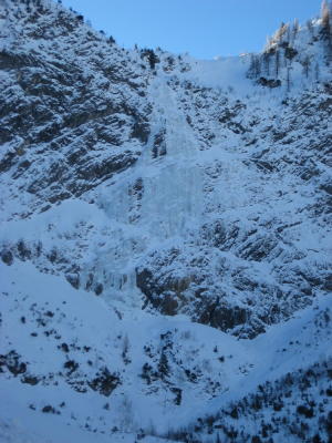 Albelefall (am 3.1.): Zustieg ohne Ski/Schneeschuhe gut machbar. Fall steht schon gut da (s. Foto). Wir kletterten die linke Variante bis zum oberen Abseilstand im Fels (5 SL von je 40 bis 50m). Genug gutes Kompakteis zum Sichern, dazwischen auch schneeiges Gelände. Es lief trotz der Kälte (unter -10°C) noch viel Wasser. Auch die rechte (Haupt-)Variante wurde geklettert. Abstieg mittels 5-maligem Abseilen (2x50m-Seile) zunächst an 2 Normalhaken, dann über Abalakov-Eissanduhren. Den unteren Abseilstand im Fels konnten wir nicht entdecken, nur eine einsame, alte Rostgurke. Zum Abseilen wären 2 60m-Seile vorteilhaft.