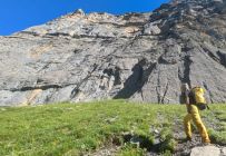 6. Sl: 6a+ Zuerst kurz athletisch gerade hoch, dann schräg nach links hoch queren. Den Stand von Zabayone überklettern und leicht fallend zum Routenbuch und Standplatz. Schlüsselstelle ist eine kurze Einzelstelle zu Beginn der Traverse.