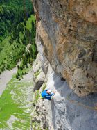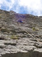 1. Sl: Eher gutmütiges 6b mit ziemlich weitem Hakenabstand vor dem letzten Haken (da war früher eine gute Schuppe, jetzt nur noch kleine Leistchen..)