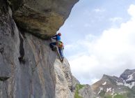 4. Sl: 6b+: Steiler, aber gut gesicherter Start. Beim ansetztenden Linksquergang zuerst rechts hoch zu den Untergriffen (hoch ist eigentlich die crux, and feinen Wasserlöchern aufzustehen) und dort traversieren (weniger schwer). Tipp: Nach den Linksquergang nicht gerade zum nächsten Haken hoch, sondern nochmals ca. 2 m nach links (weit unten bleiben) und dort im steilen, aber etwas griffigeren Fels hoch. Der Haken ist dann etwas unangenehm rechts zum clippen und auch etwas weiter weg. Schlusstraverse nach rechts dann problemlos.