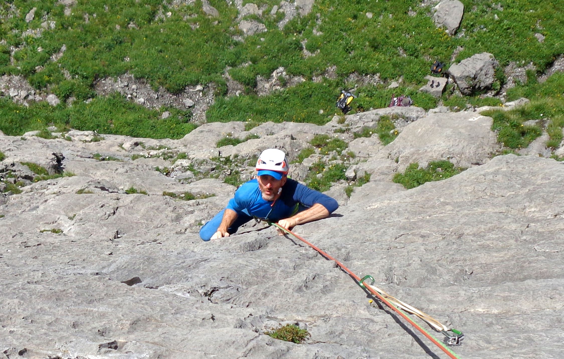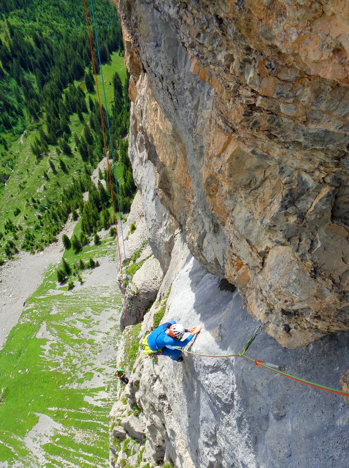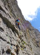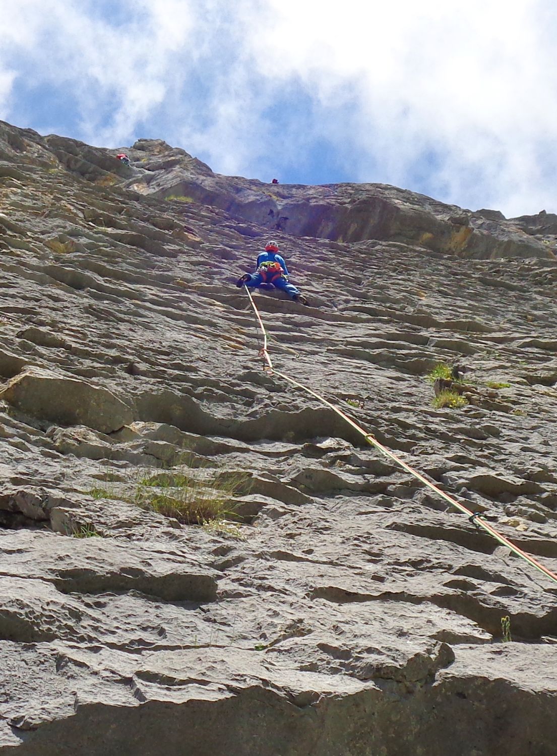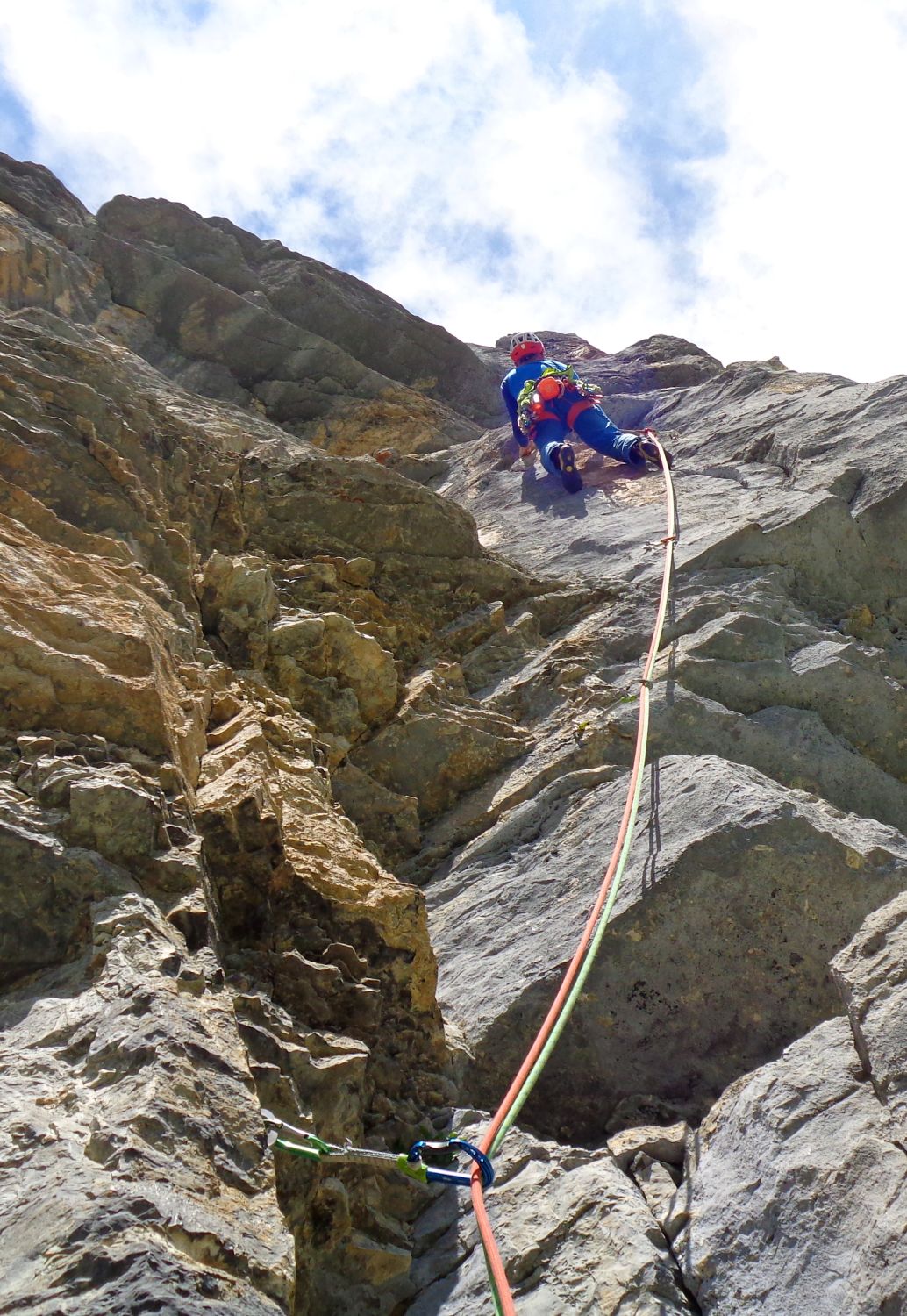 5. Sl: 5c Piaz-Risskletterei; Absicherung dort gut (neu). Hoch aufs Band und oben 3 m nach R zu Stand