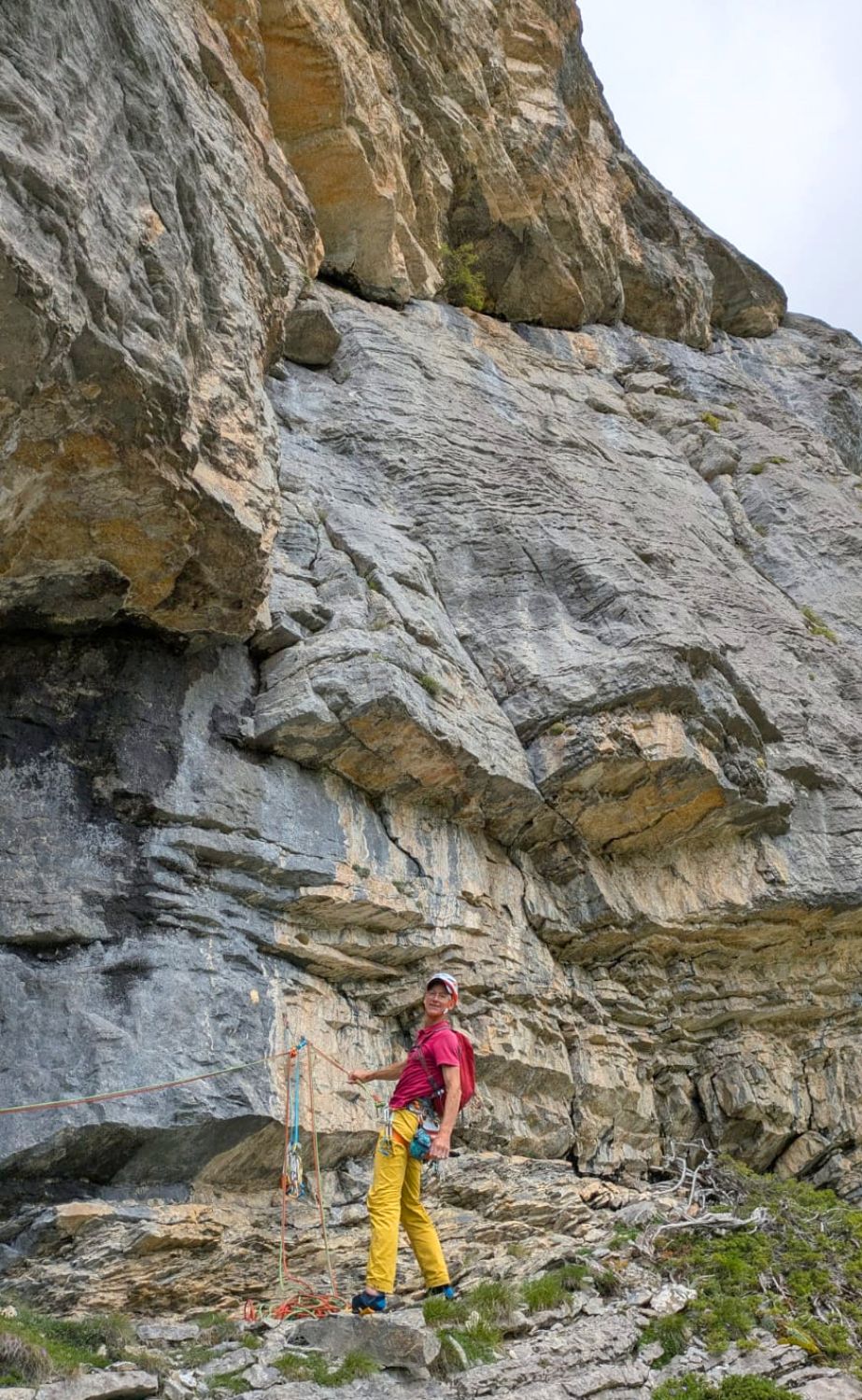 7. SL 6a Der Rampe entlang, zweimal Stellen zum Anpiazen an der oberen Wulstlippe. Interessant- Fels ist fest.