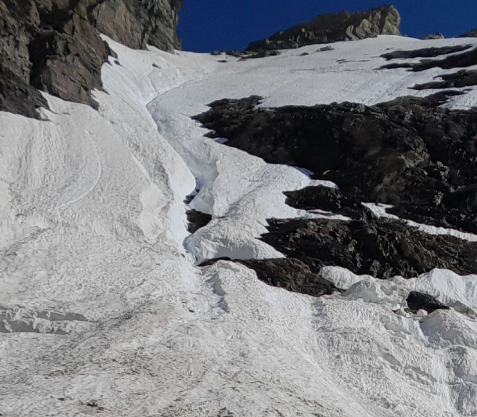 Aufstieg durchs Firncouloir noch gut machbar, ca. 45 Grad. Schrund problemlos.