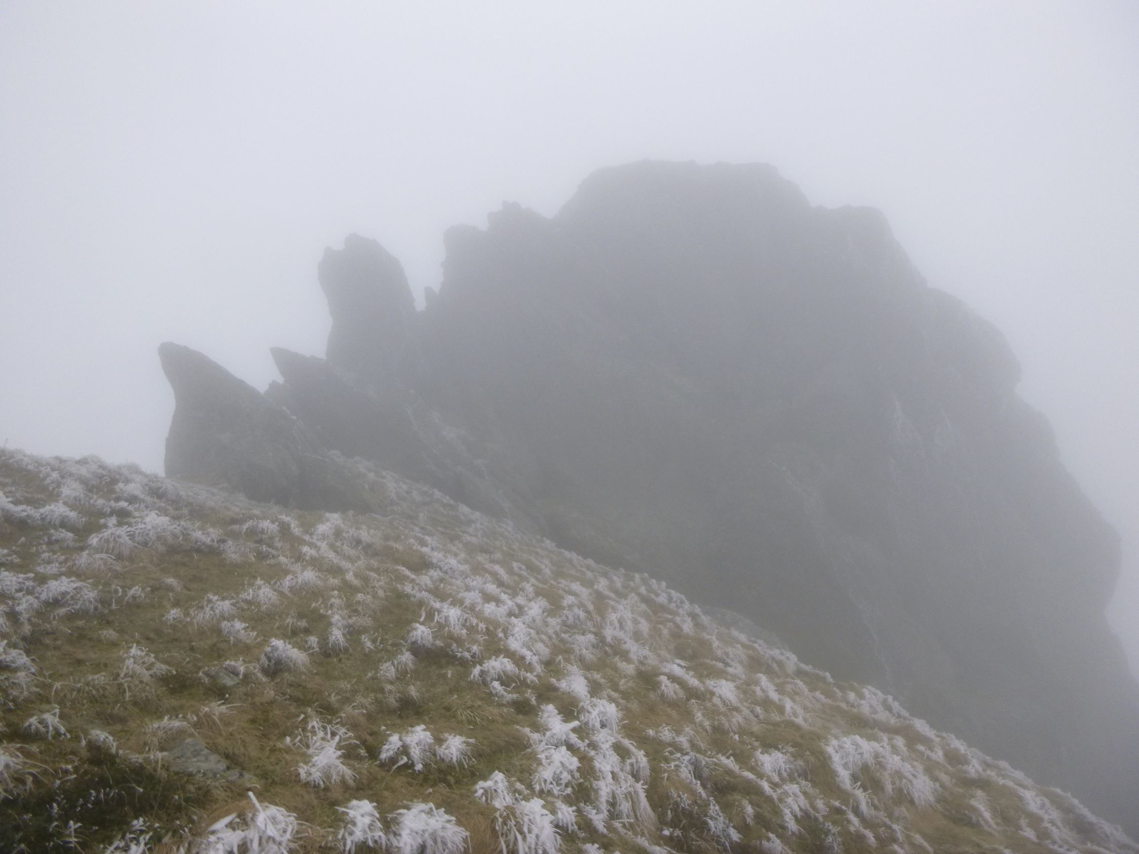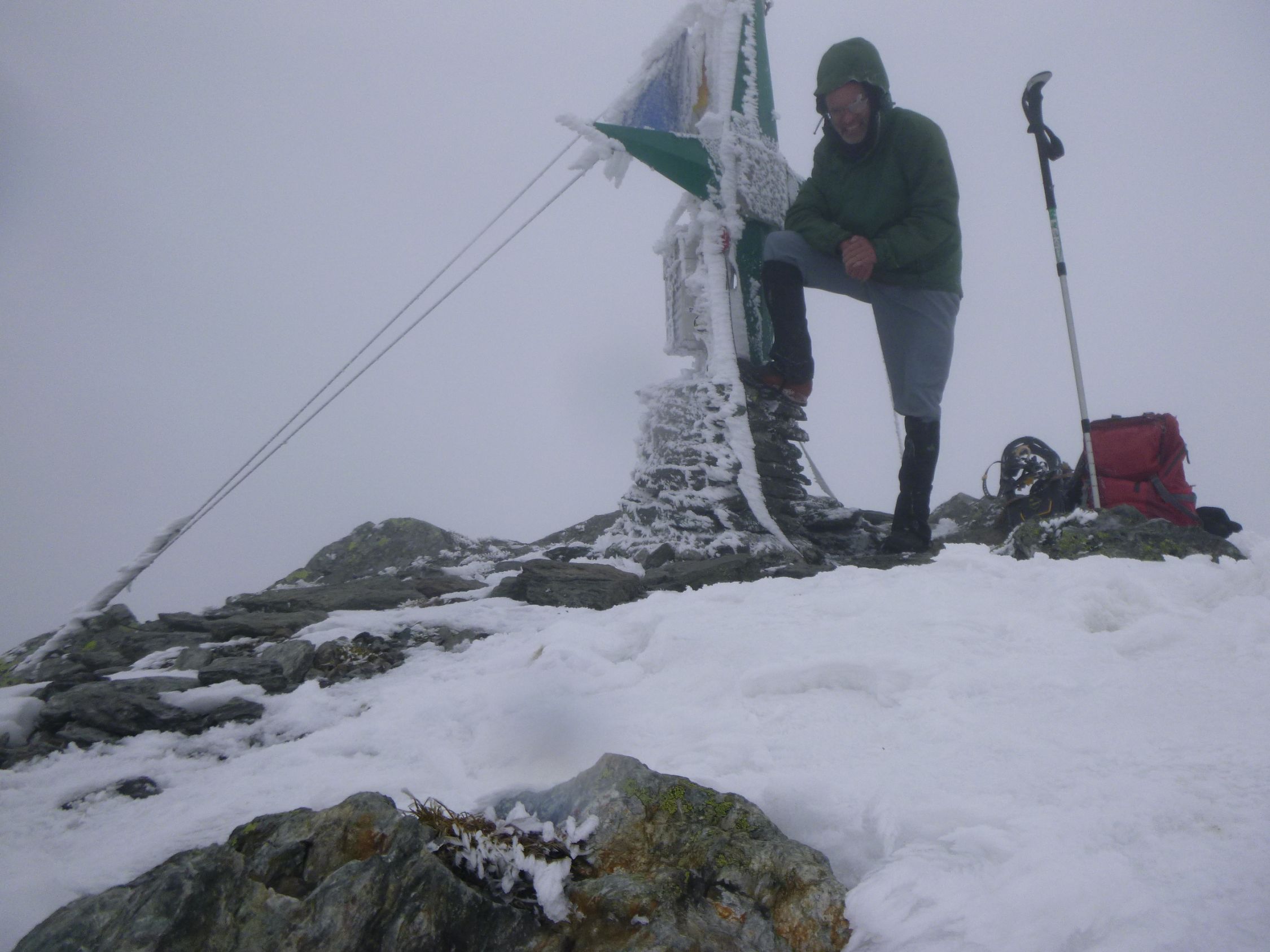Tourenbeginn um 07:50 Uhr bei 6°C unter bedecktem Himmel. Oberhalb 1900 m herrschte dicker Nebel und die Oberflächen waren mit Rauhreif bedeckt.