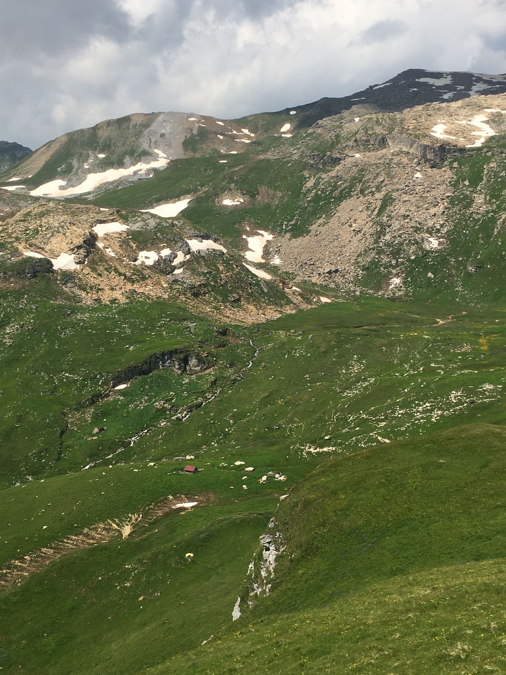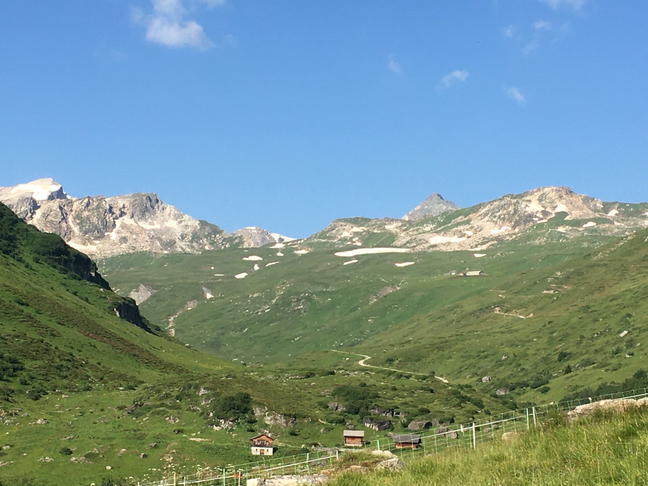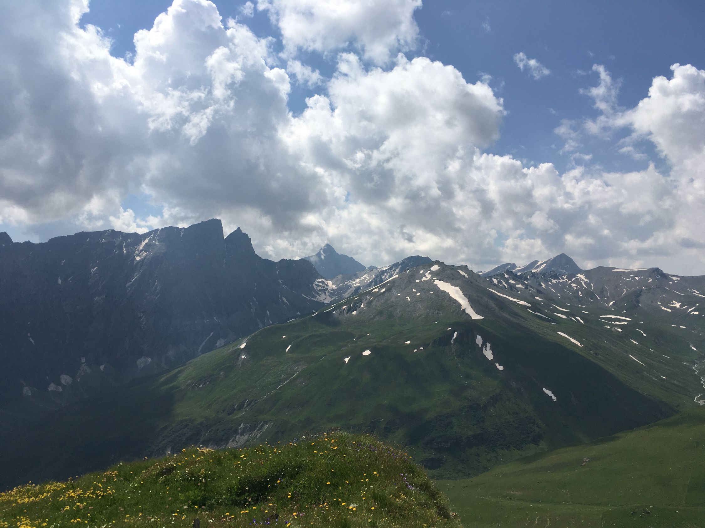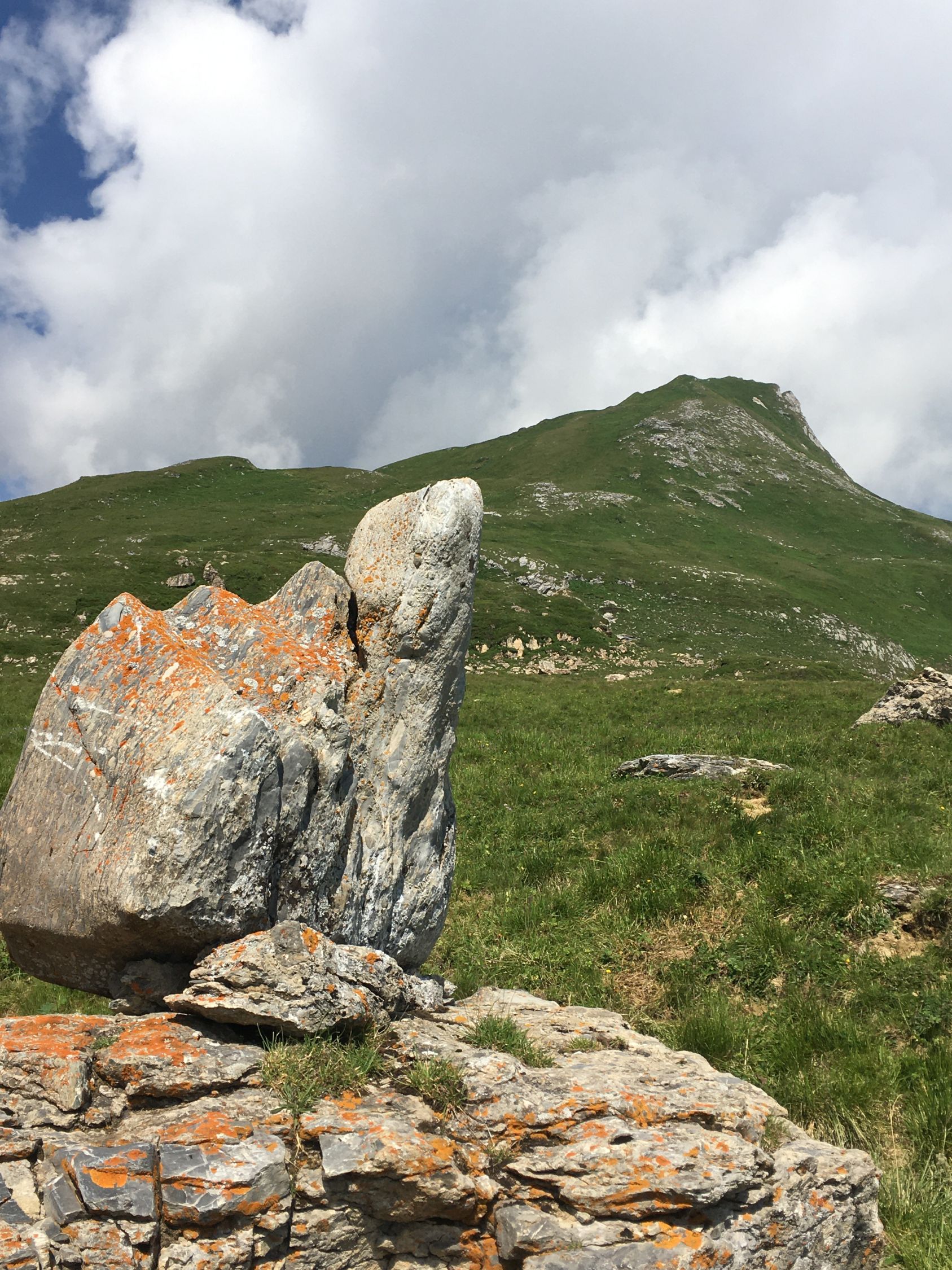Wanderung auf den markanten Gras- und Felsgipfel oberhalb Radons, T3+. Start Restaurant Muntaneala bei Radons, 9 Uhr, 15 Grad, windstill. Gemütlich das Alpsträsschen hoch bis zum kleinen Maiensäss Höhe 2100 m. Nun weglos Alpgelände und weiter oben Waidgelände für Kühe bis ca. Höhe 2250 m. Nun die teilweisen steilen Grashänge hoch bis zum Gipfel. Abstieg wie Aufstieg.,