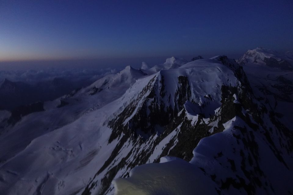 Eigentlich war die Tour am Furkapass bereits zu Ende. Unser eh schon an der Grenze der Lächerlichkeit liegende Zeitplan verpuffte dort durch eine nächtliche Sperre. Wir kamen um 0:30 an und der freundliche Wächter der Baustelle bedeutete uns, dass wir um ca. 5:00 vielleicht auch schon 4:30 passieren können. Zum Glück klopft er bereits um 2:00 an die Scheibe und gibt grünes Licht. So können wir um 4:30 von der Täschalpe starten und über den Rotgrat das Mischabelbiwak am frühen Nachmittag erreichen. Dieses Kleinod an Biwak war leer. Start um 2:00. Erst ohne Steigeisen und noch eher gemütlich über den unteren Bruch. Irgendwann kommt erster guter Firn und es geht mit Steigeisen weiter. Eine sehr steile Passage auf eine riesige Wechte hätte uns fast zur Umkehr oder einer aufwändigen Sicherungsaktion gezwungen. Zwei Meter 60 Grad und kaum Halt für die Geräte. Zum Glück hatten wir drei Eisgeräte dabei und der Erste konnte ein Gerät zum Zweiten an einer Schlinge herunterlassen. Danach weitgehend unproblematisch zum Gipfel des Täschhorns. Abstieg über den Nordgrat in gutem Hartschnee mit einigen heiklen Stellen, daher über Felszacken gesichert zum Teil am laufenden Seil bis zum Domjoch. Von dort meist in Fels unterdurchschnittlicher Qualität am Grat oder der Ostseite bis unter den Gipfelaufbau. Dort steiler aber in besserem Fels auf den Dom. Abstieg über perfekte Trasse.