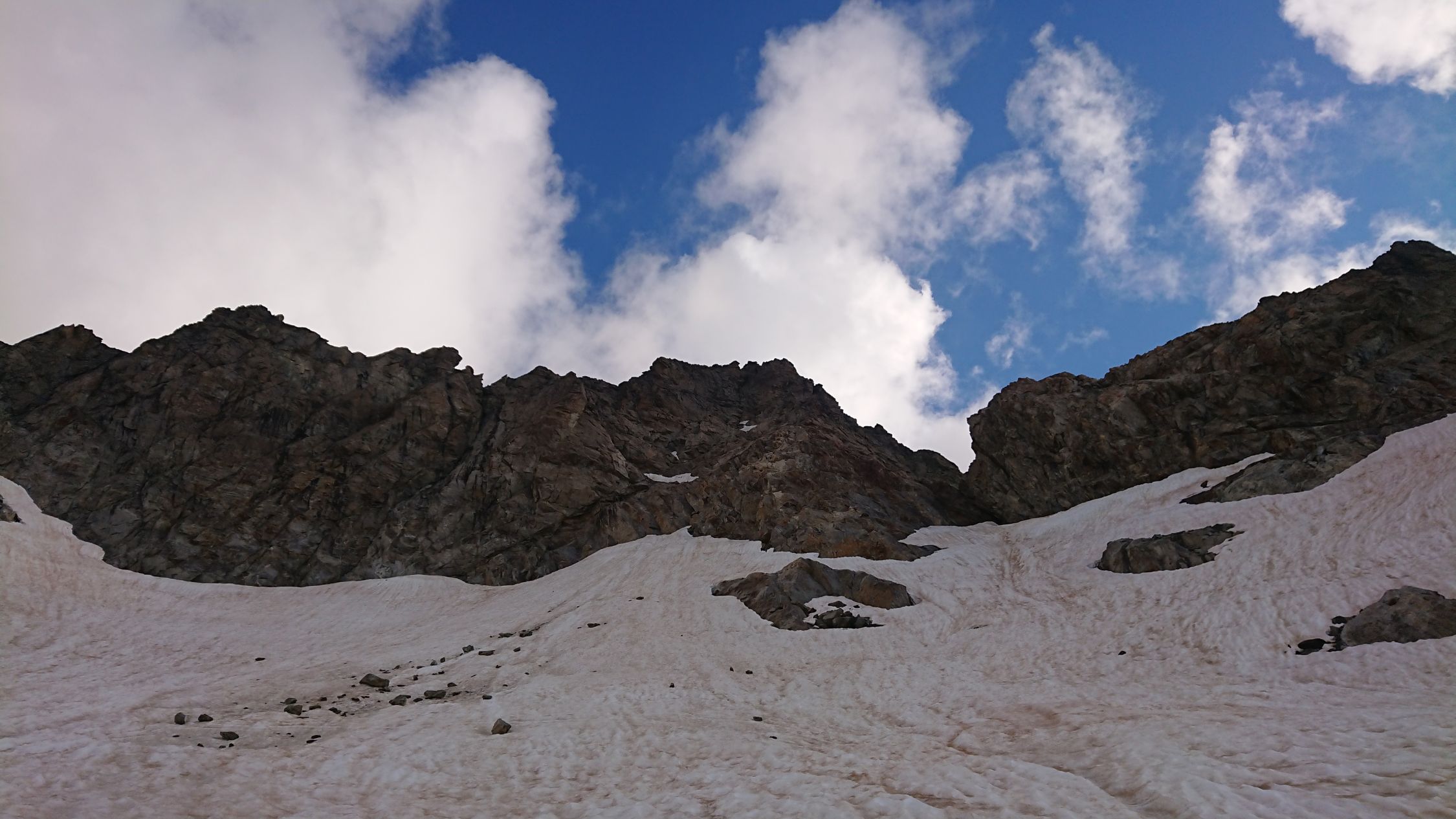 Direktvariante nicht mehr möglich. Variante (rechts in eine Verschneidung und anschliessende Querung von rechts nach links zur Ausstiegsrinne auf den SW-Grat) geht gut, aber die ersten Meter vom Firn über die Felsen am Fixseil sind steil und schlifrig ?